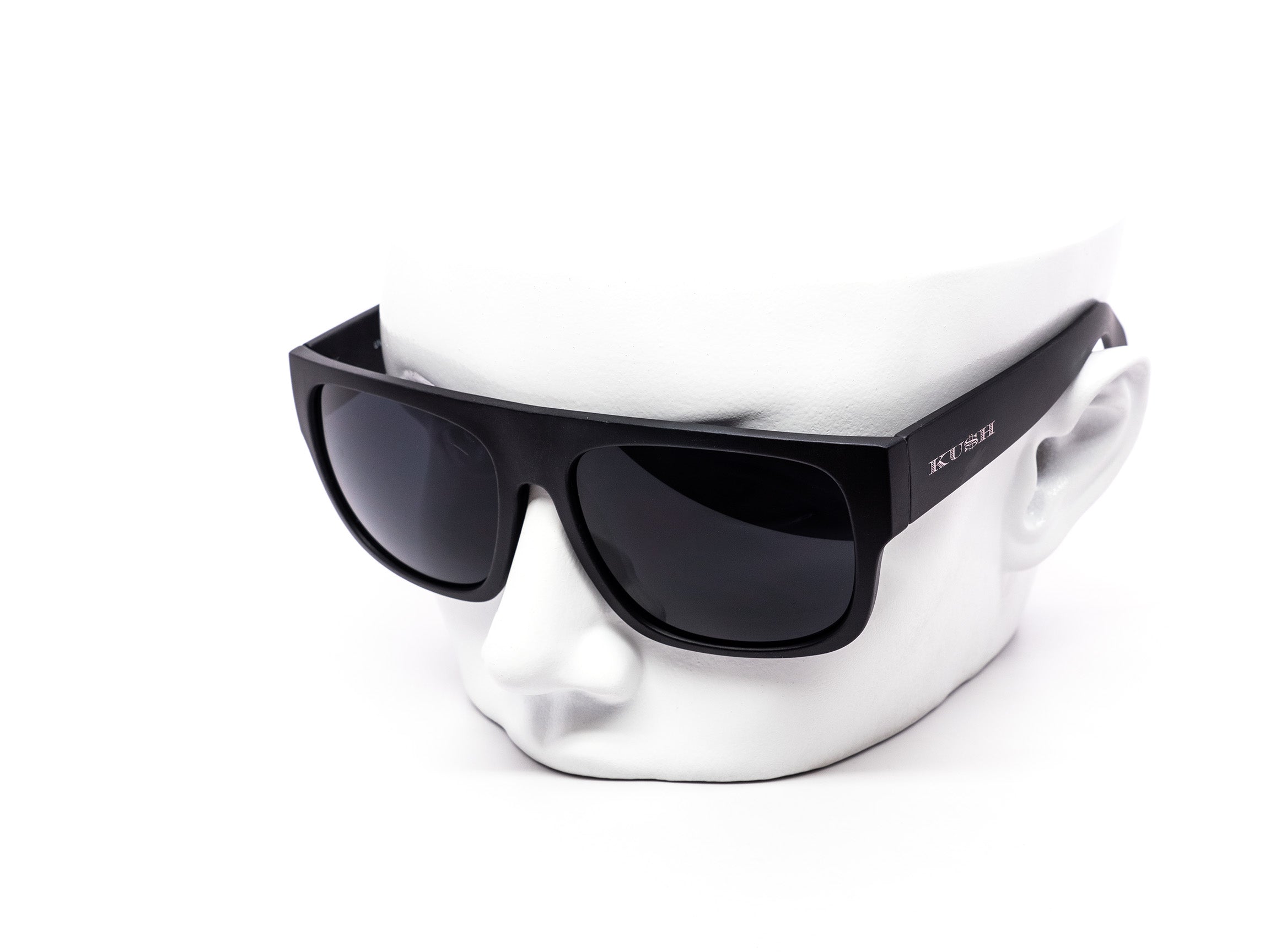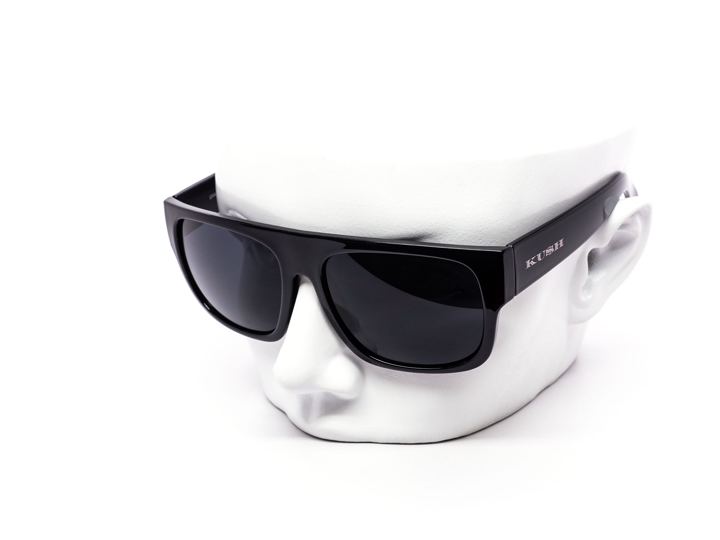 Super Low-Key Flat-Top Rebel Style Shades. These sunglasses boast an all-black frame and lens for a sleek, understated look. The thick, oversized fit ensures they stand out while offering maximum coverage and protection. With the KUSH logo etched in a distinctive money currency font, these shades blend luxury with attitude, making them the perfect accessory for anyone looking to make a bold statement.