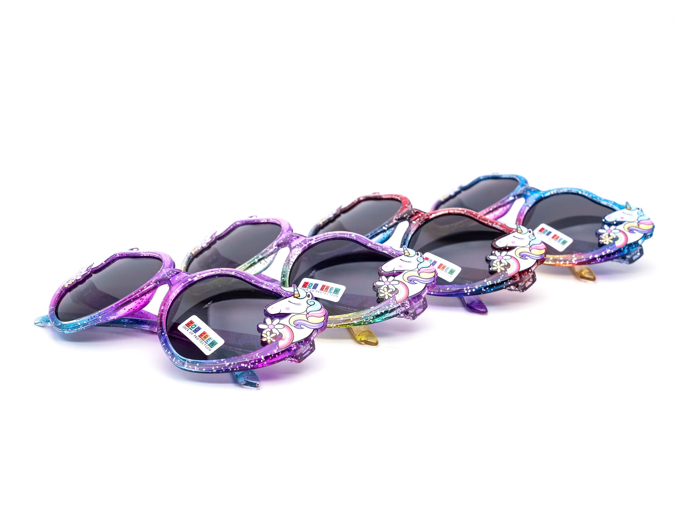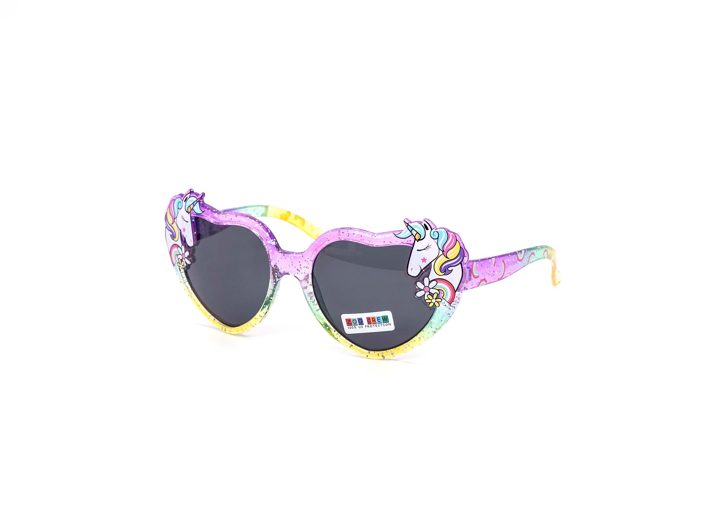 Cute kids heart shaped shades with unicorn accents and rainbow glitter patterns on the frames. Comes in fun assorted color frames and dark lens. Perfect for ages 1-6.