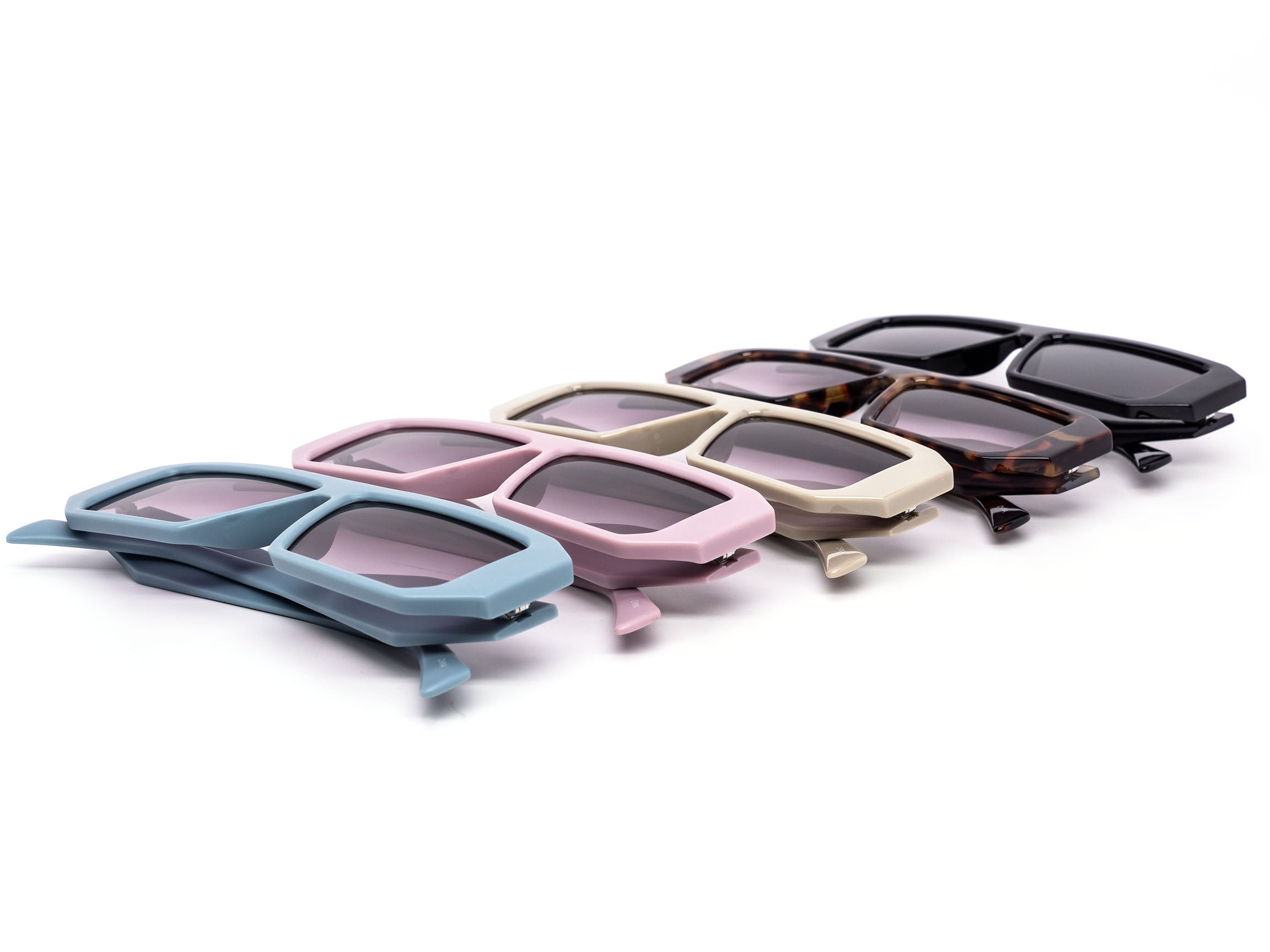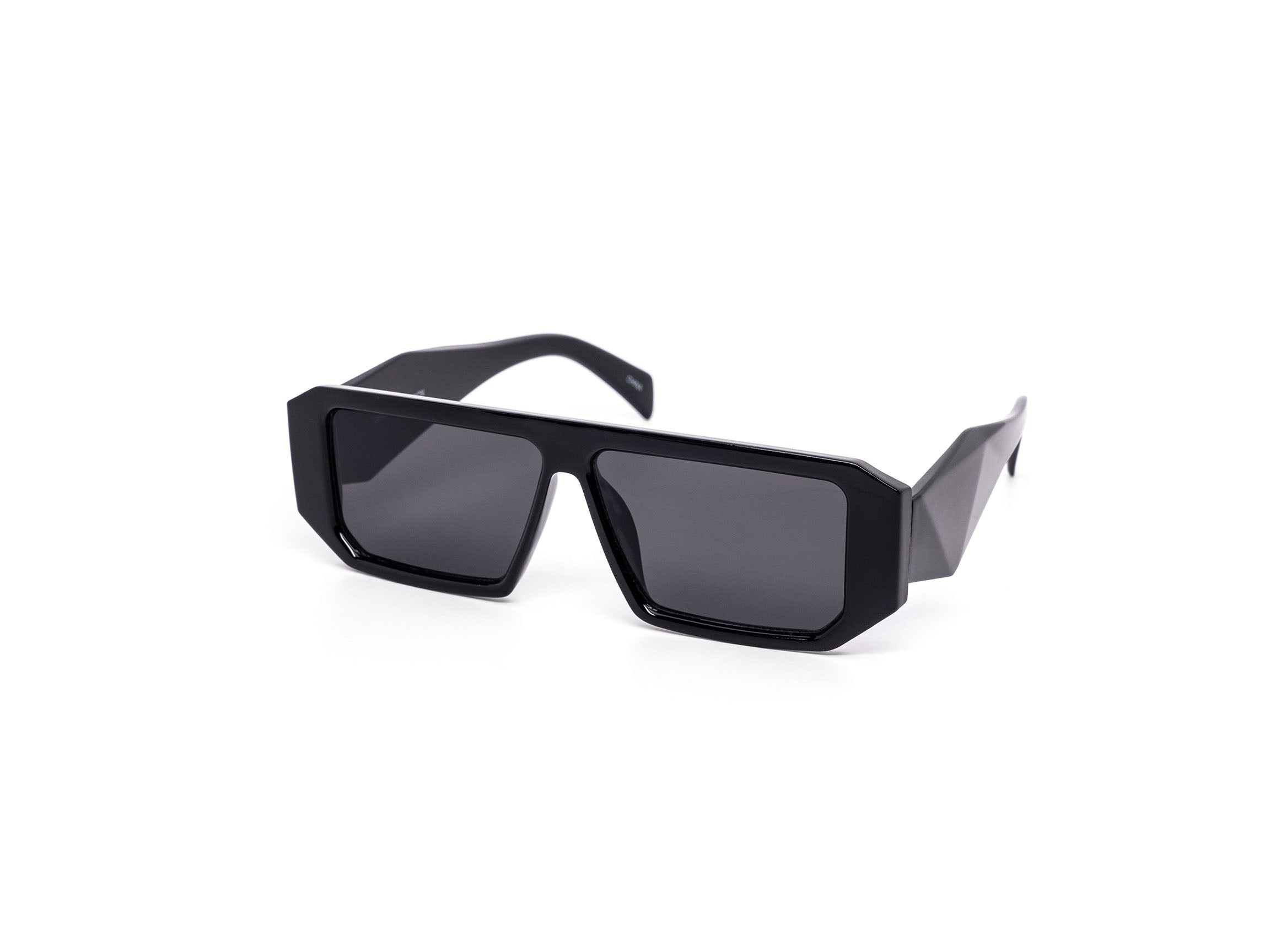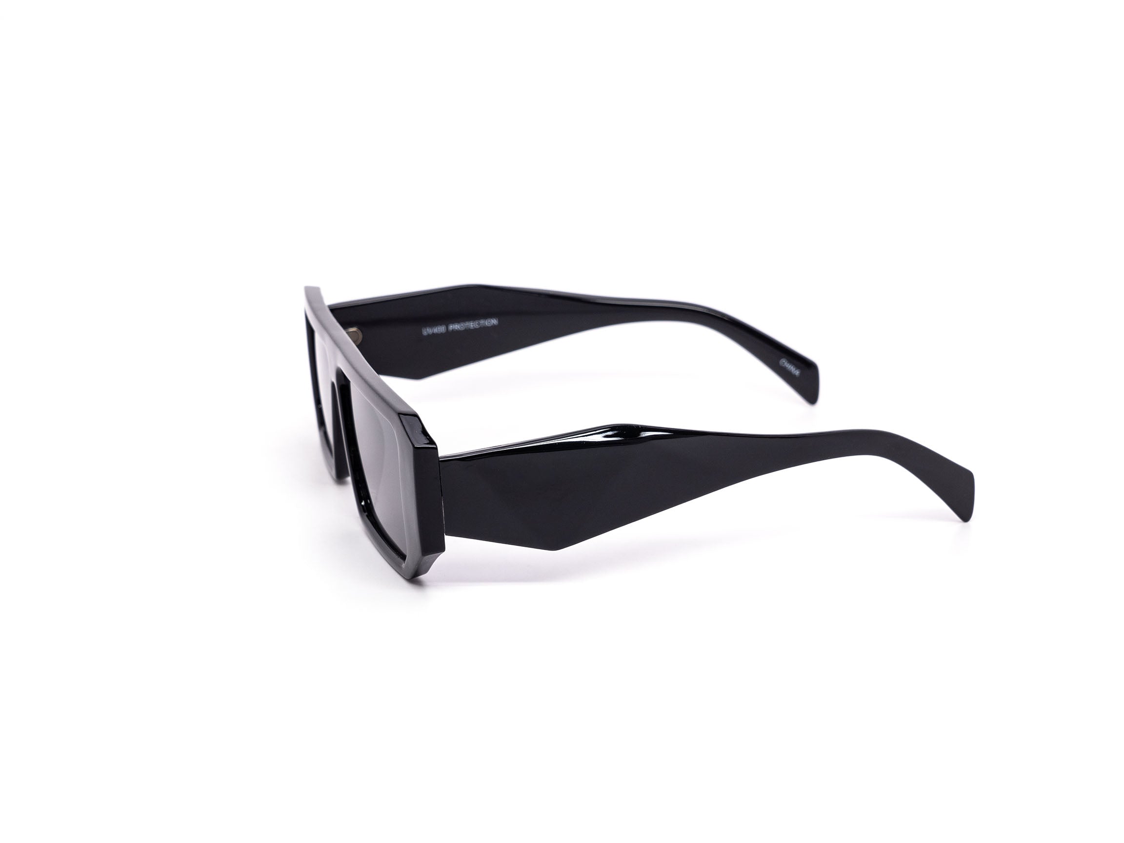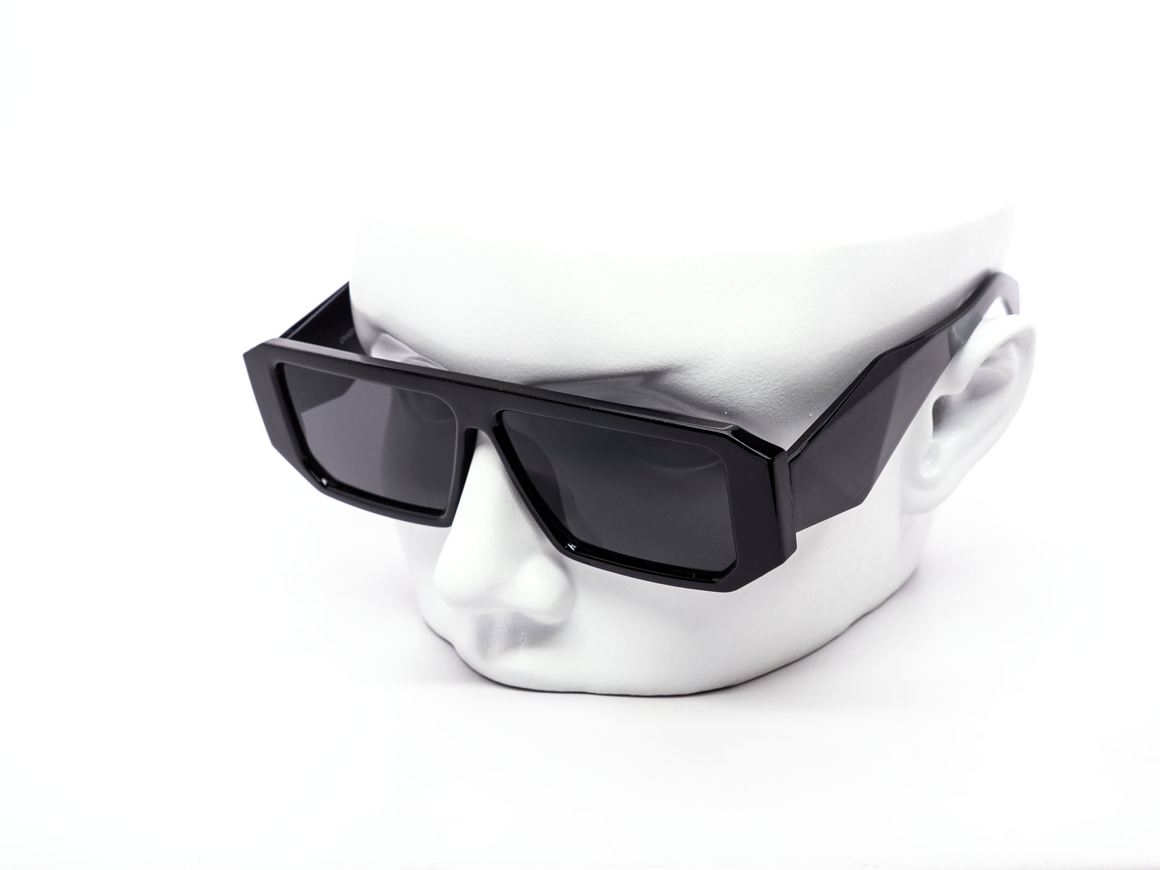 Fashion-forward and bold, these sunglasses feature a chunky, angular frame with a geometric flair and thick temples. Each pair comes with a beautifully curated selection of frame types, all complementing the square dark lenses for a striking, abstract look.