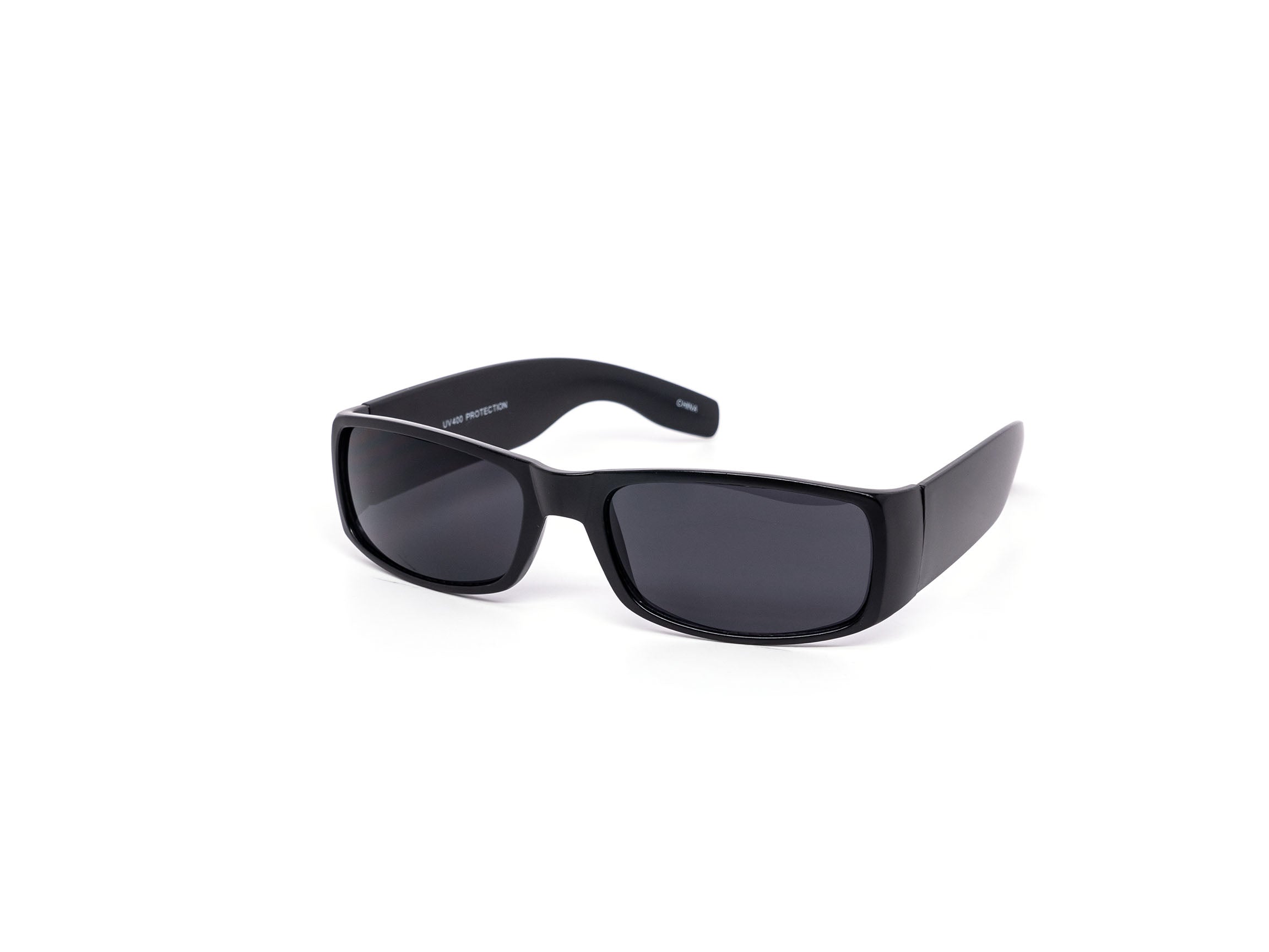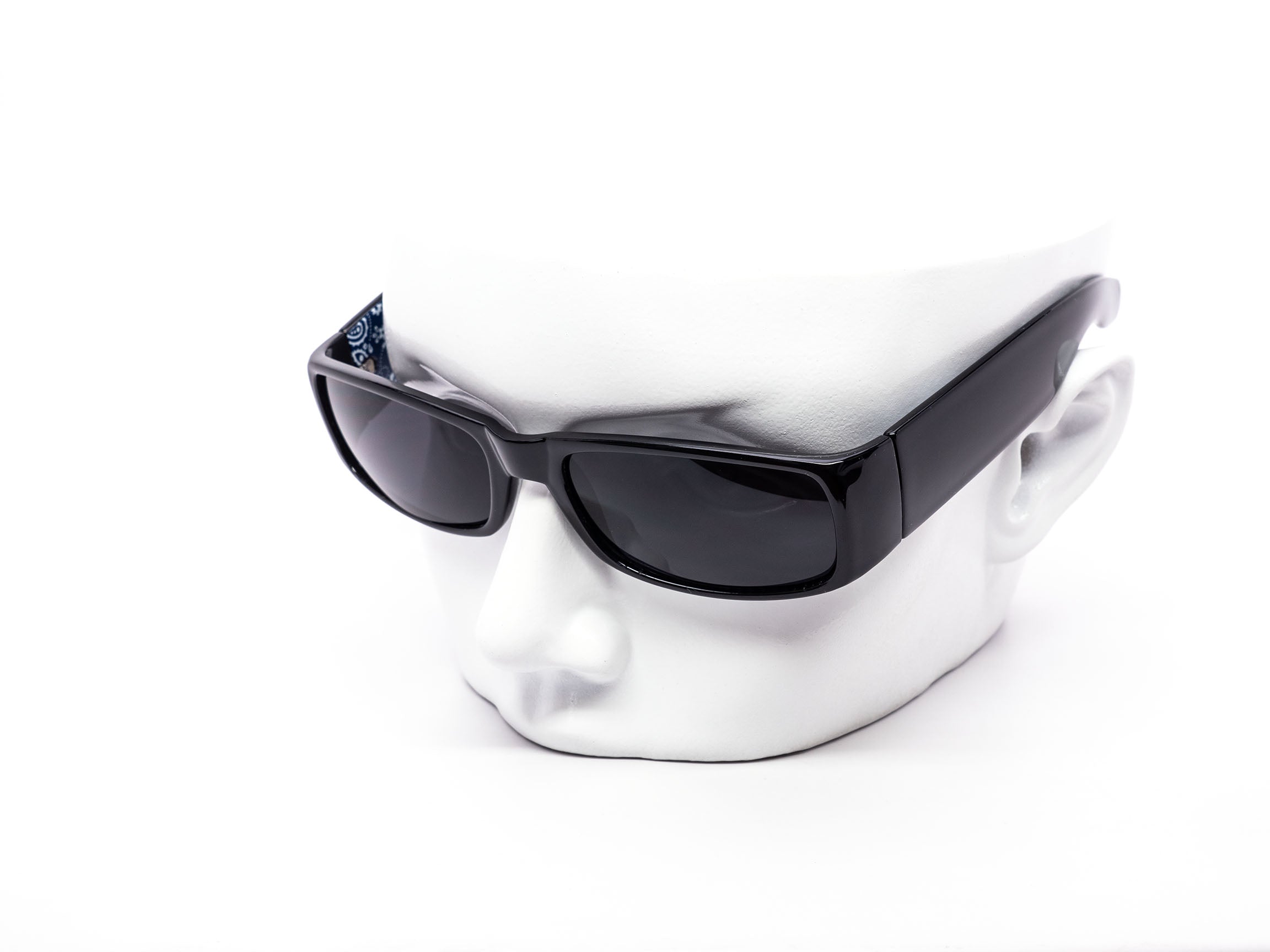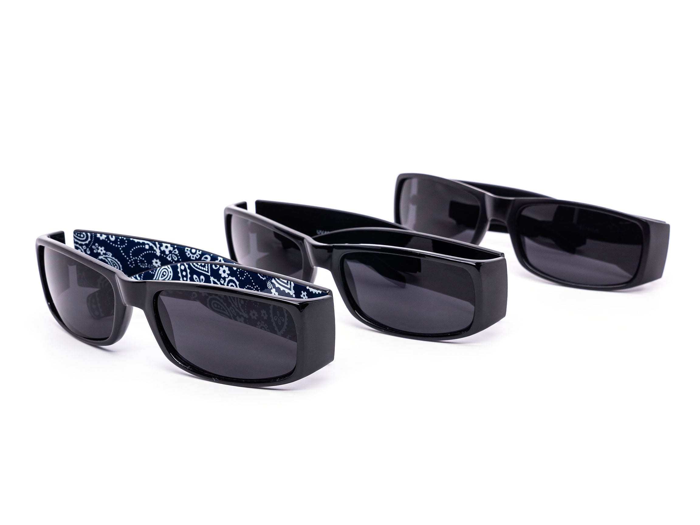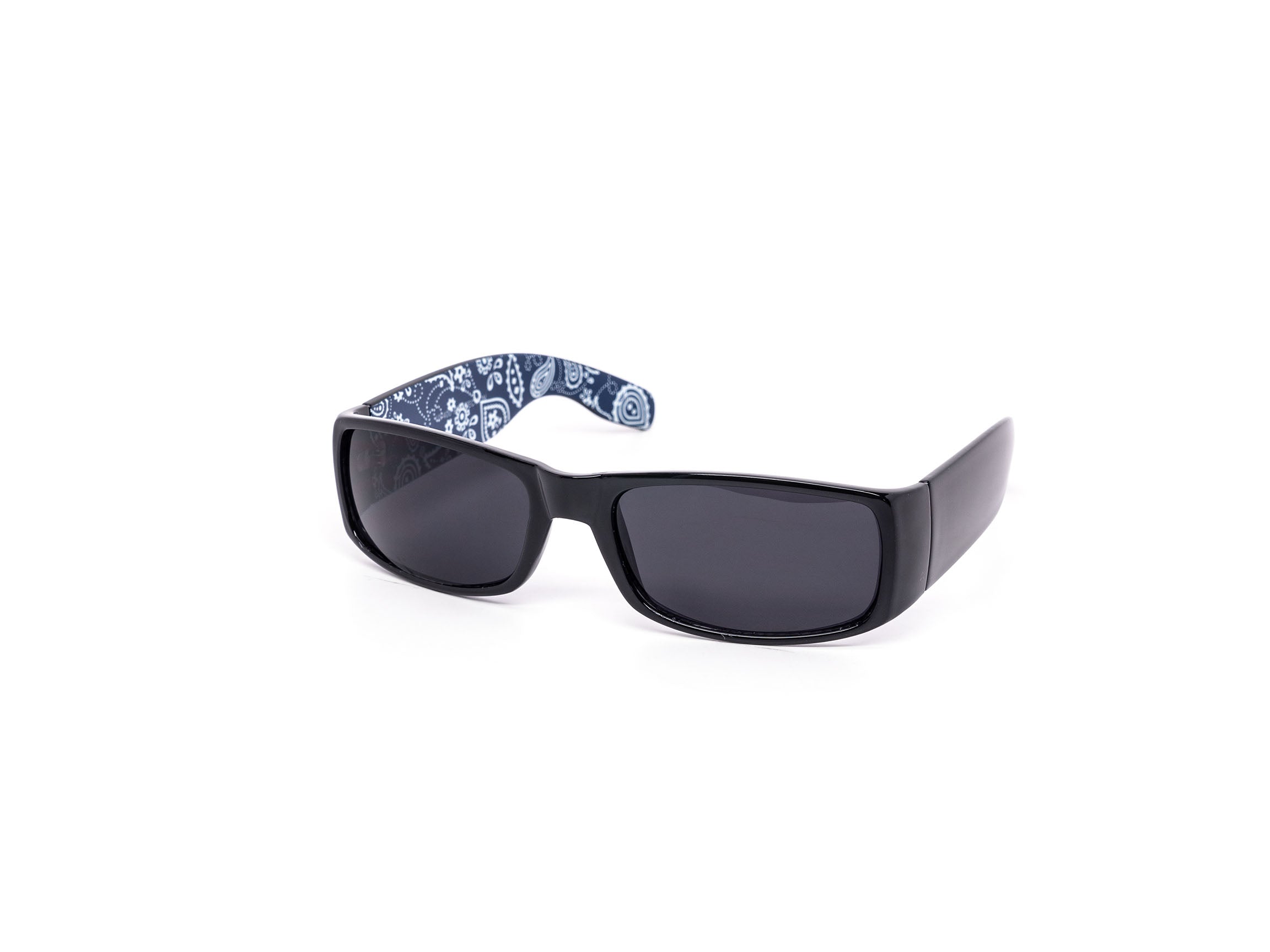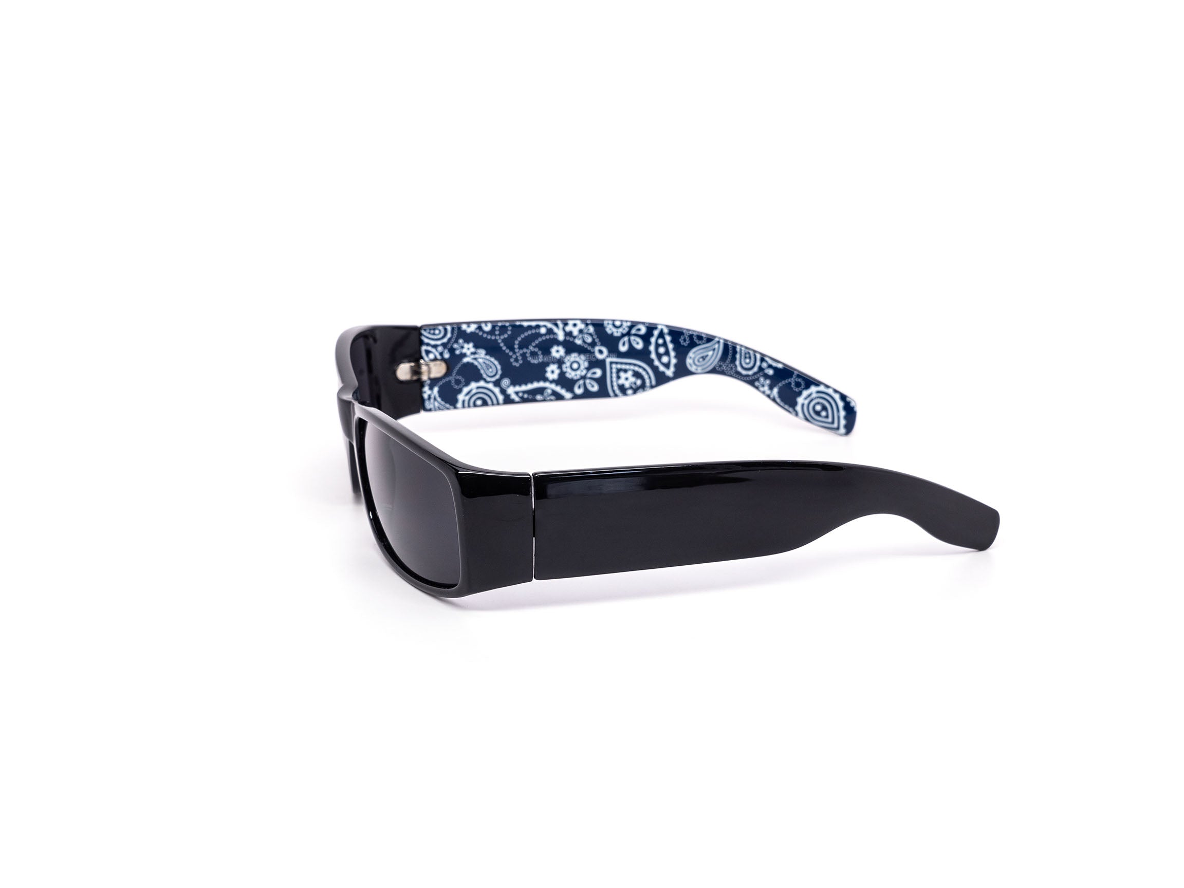 Classy super light black-on-black OG skinny Locs wraparound style and dark lens. Frames come assorted with matte, glossy, and glossy paisley pattern (Blue).