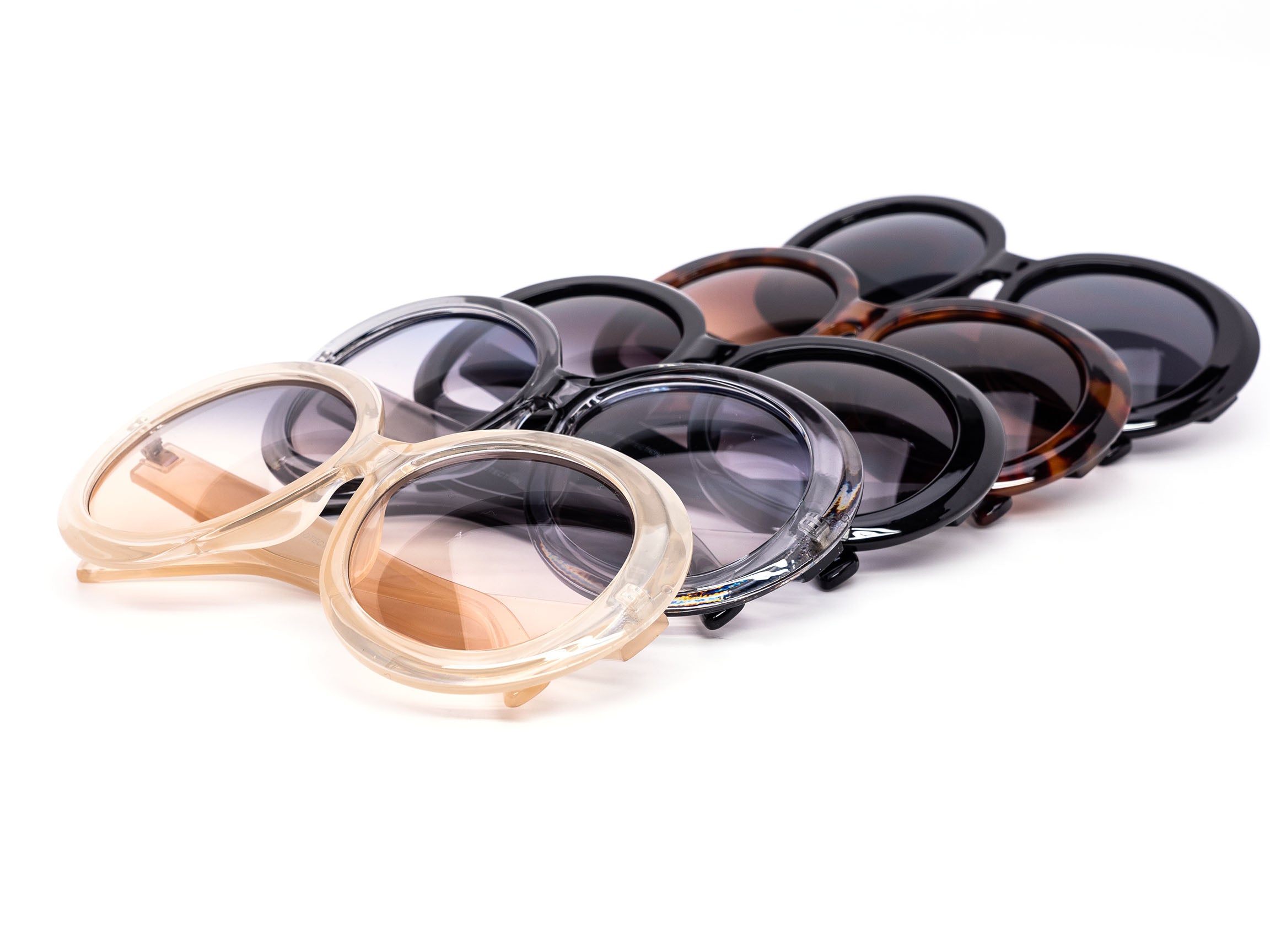 Luxurious oversized classic circle sunglasses featuring gradient and dark lenses, available in an assorted selection. Each dozen includes assorted frames for a timeless look.