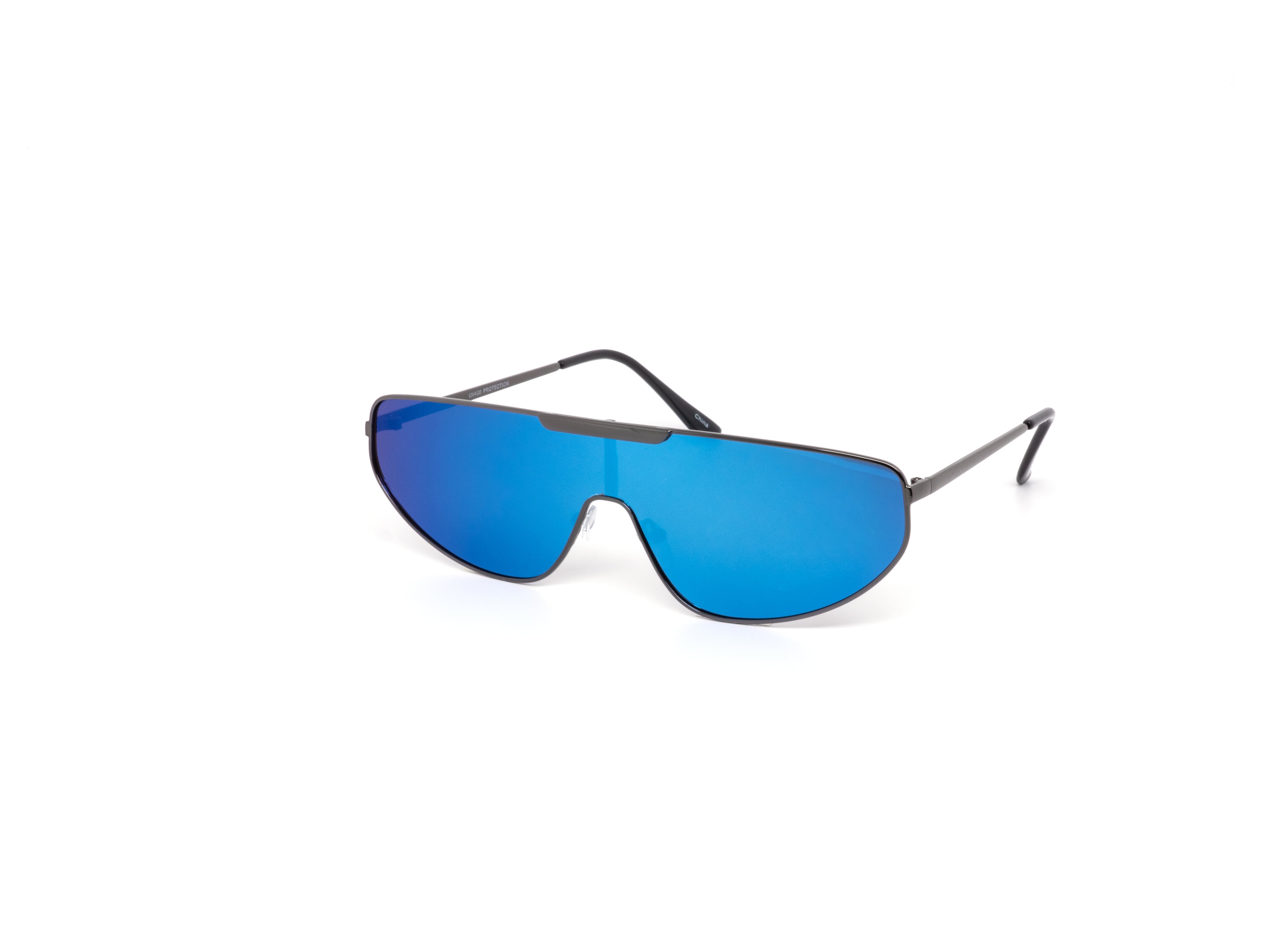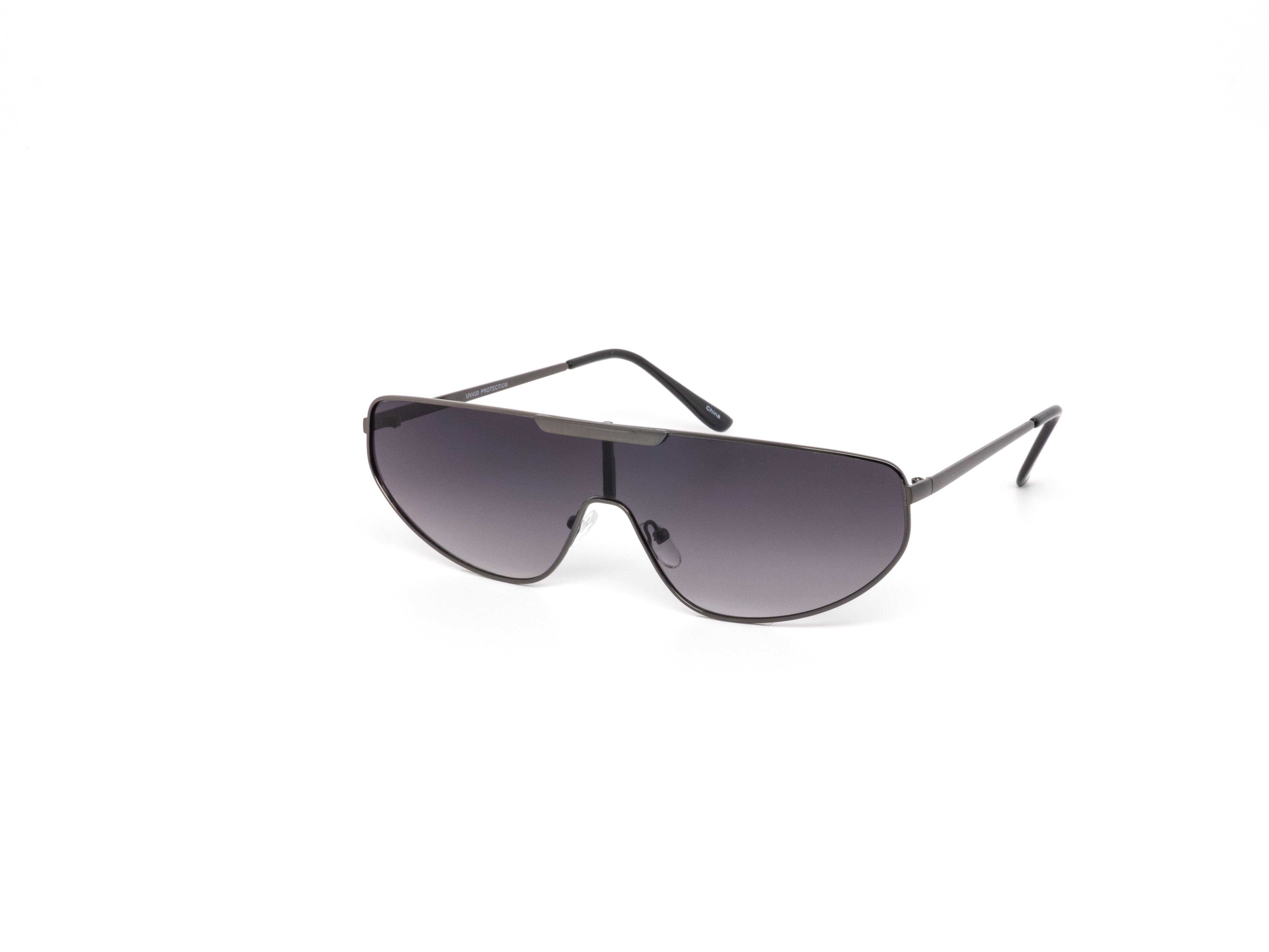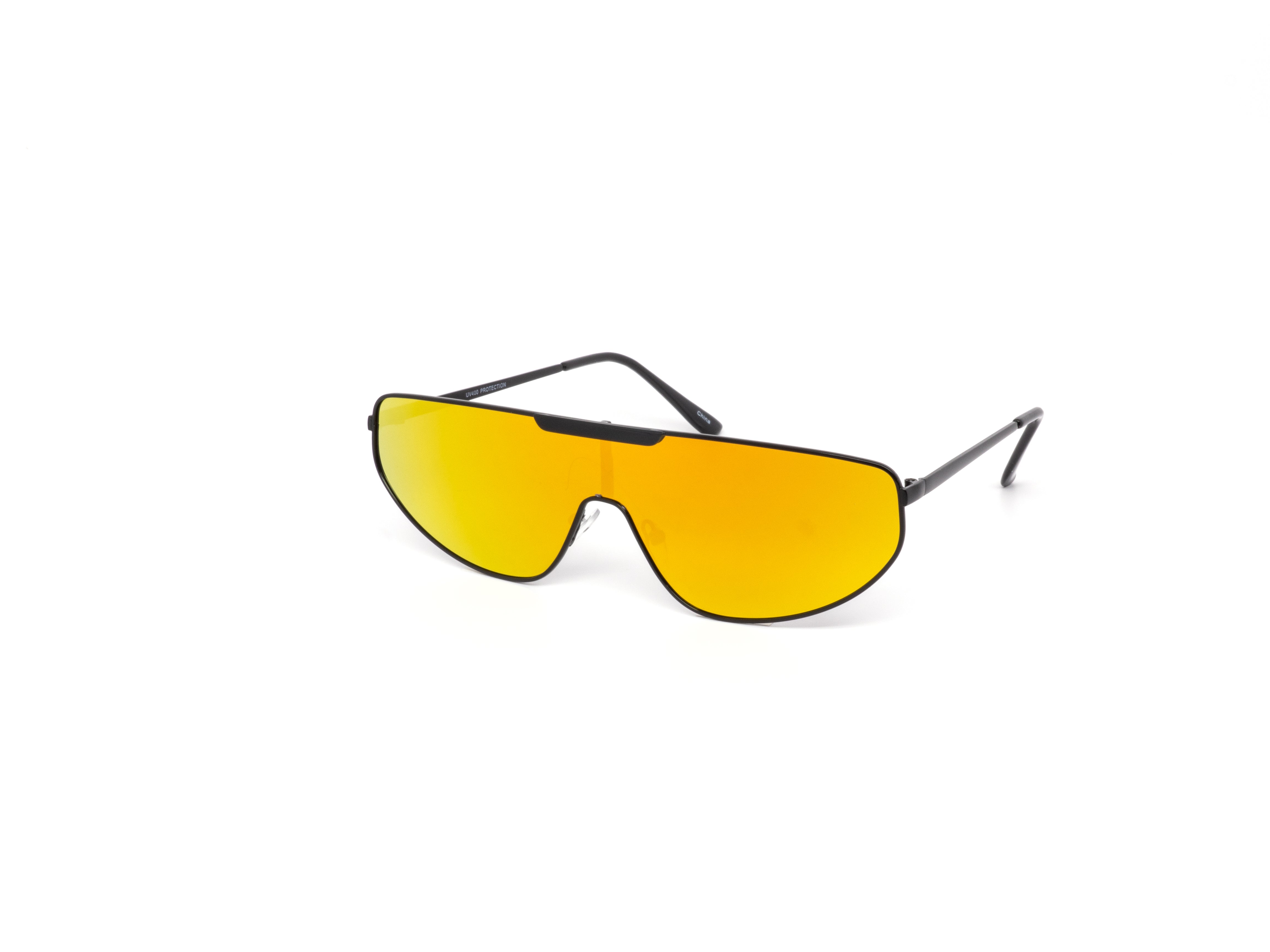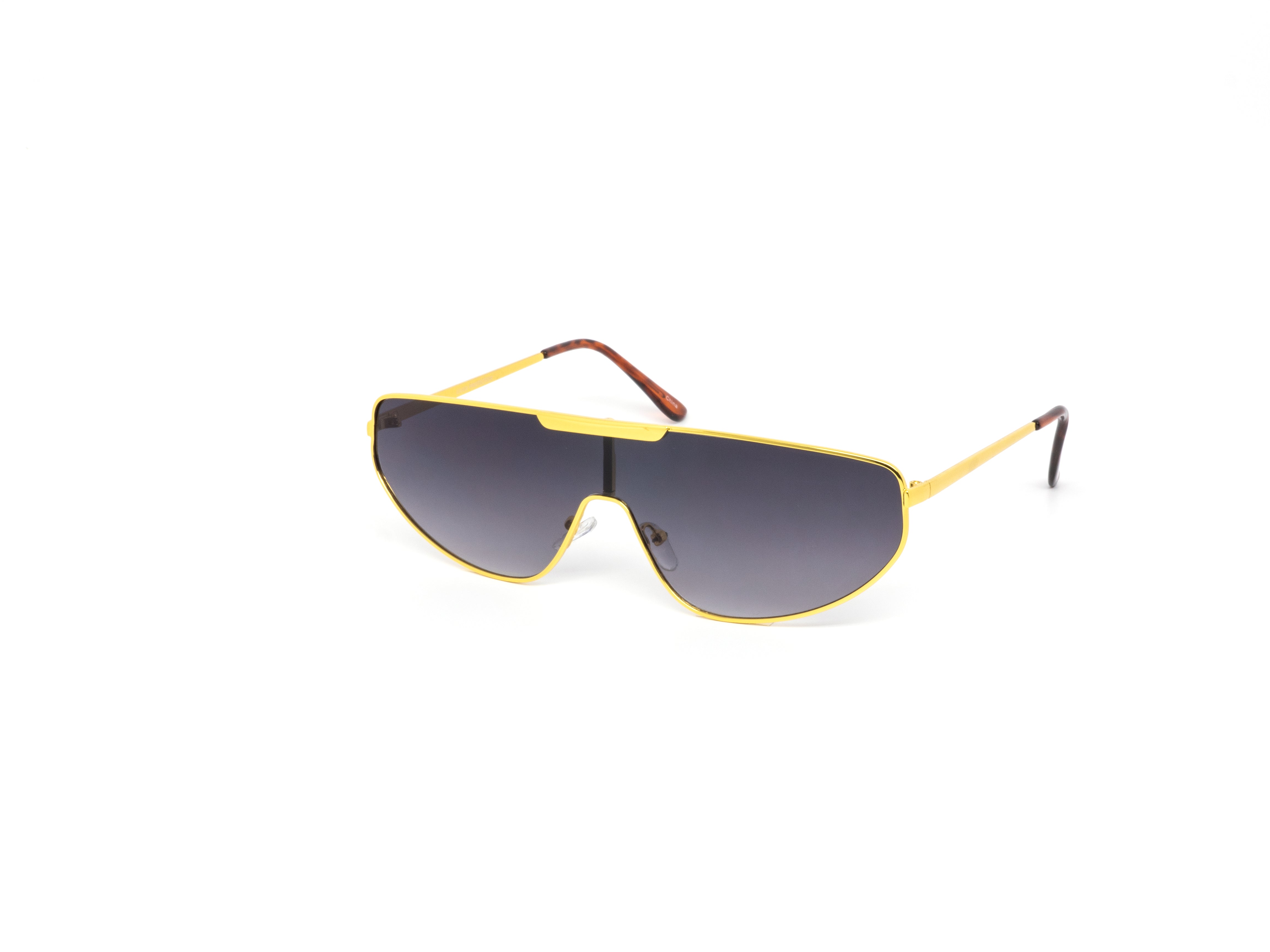 High fashion medium sized thin framed sleek sports shield style which comes in assorted color mirror, dark gradient lens. Assorted metal frame materials.
