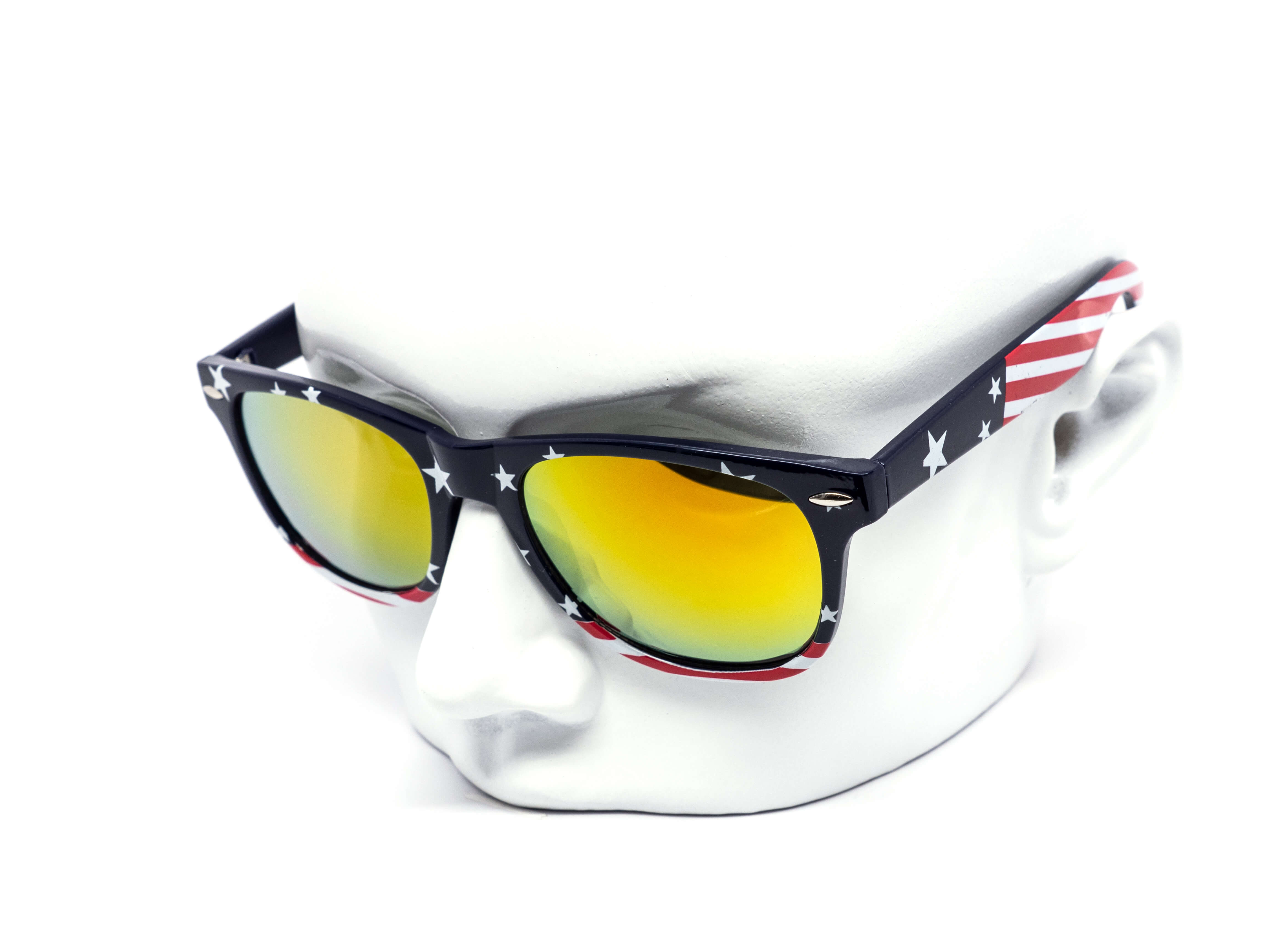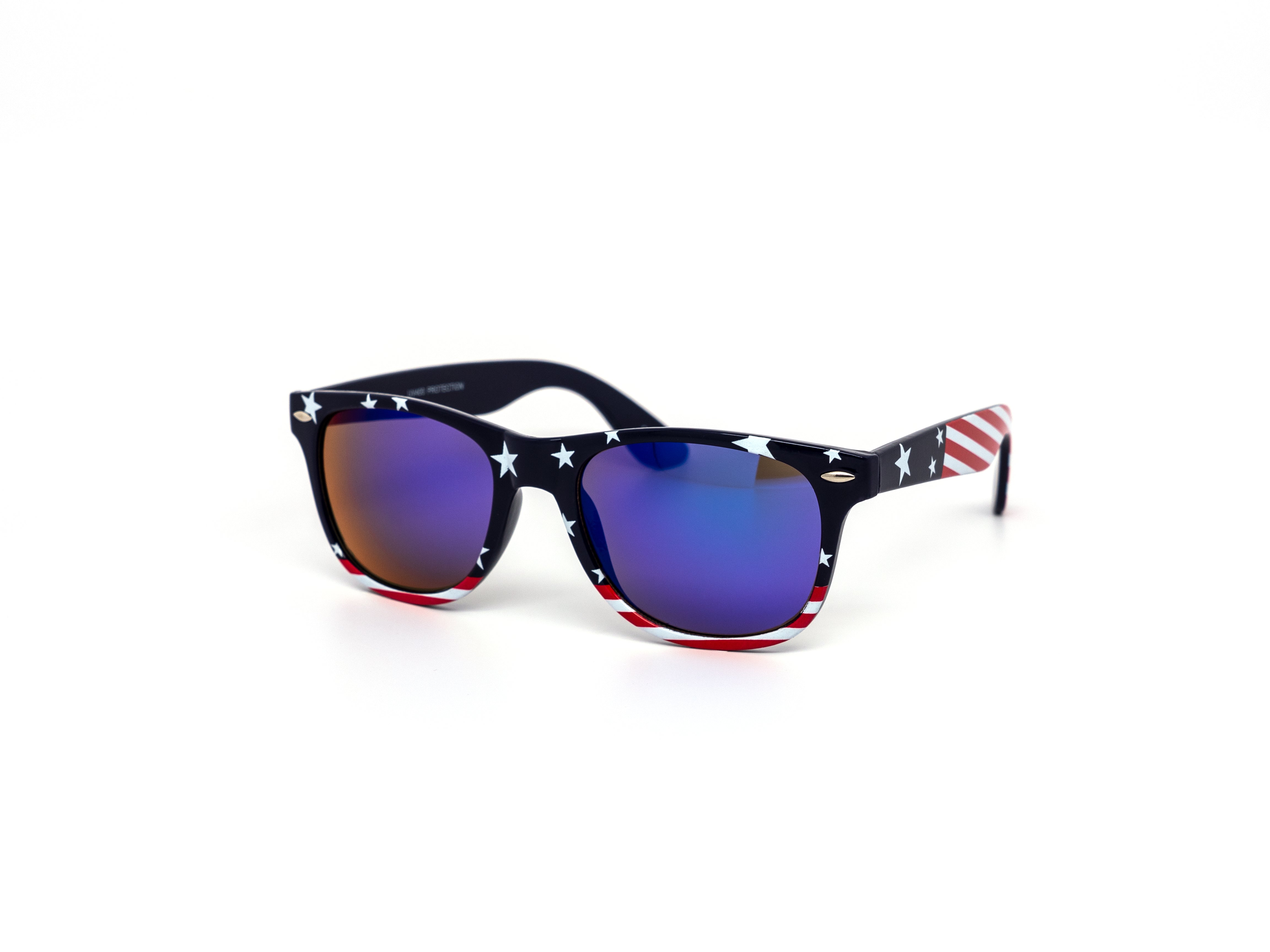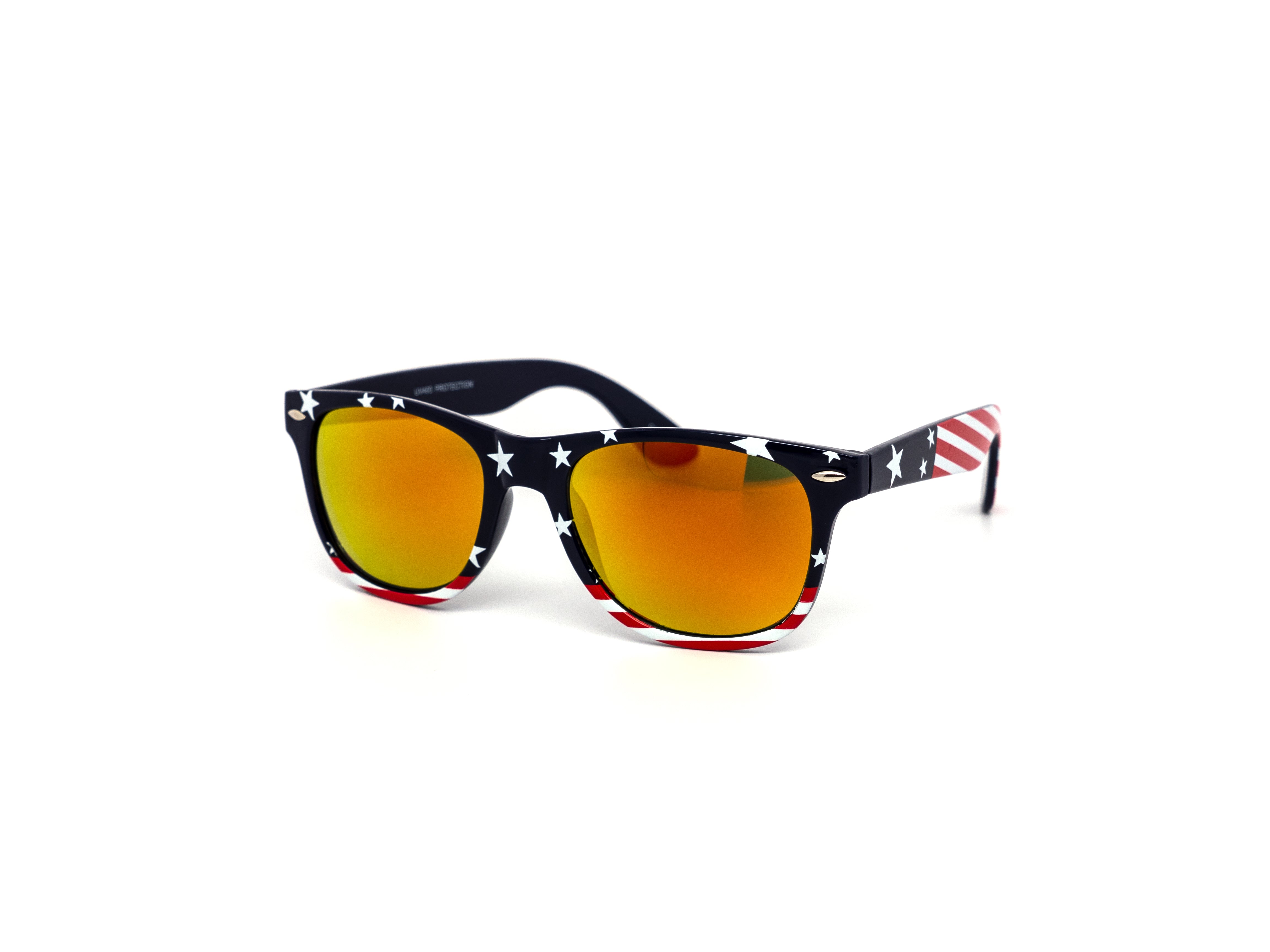 Star spangled USA Flag print on classic frame with color mirror lens. Comes assorted in two variations of American flag patterns. 6 flag pattern throughout the frame, 6 with nflag pattern on the temples. Let's go USA!