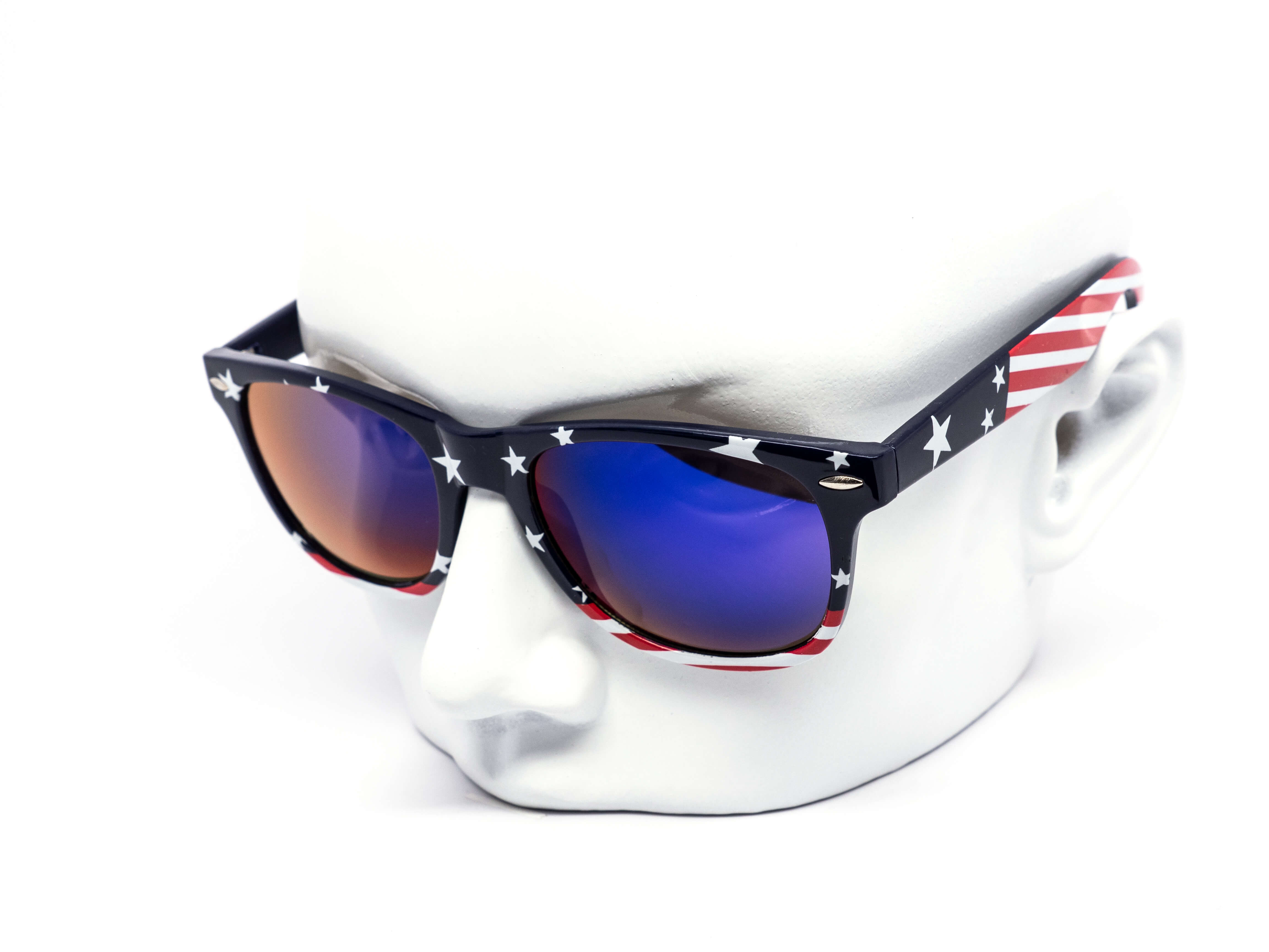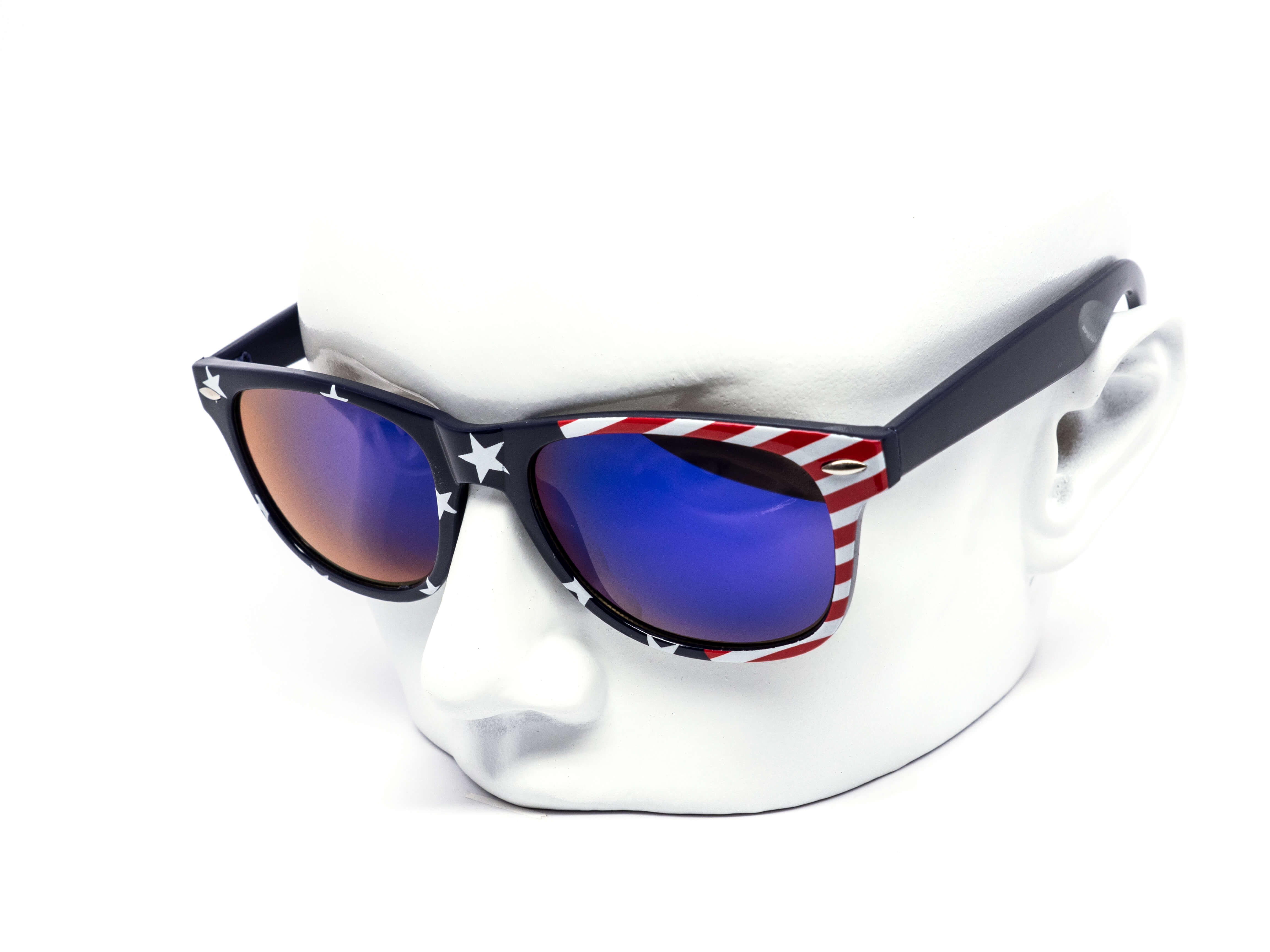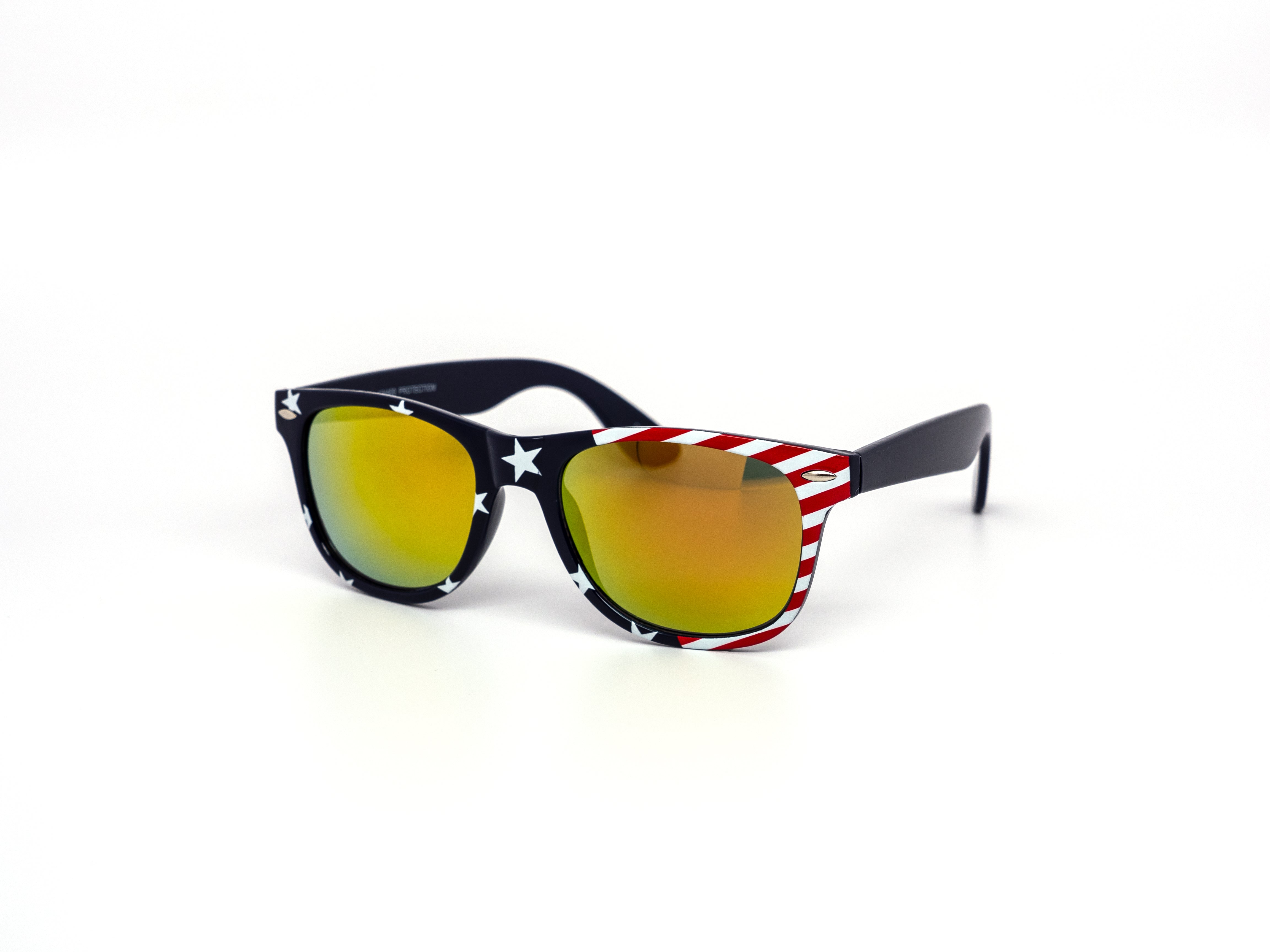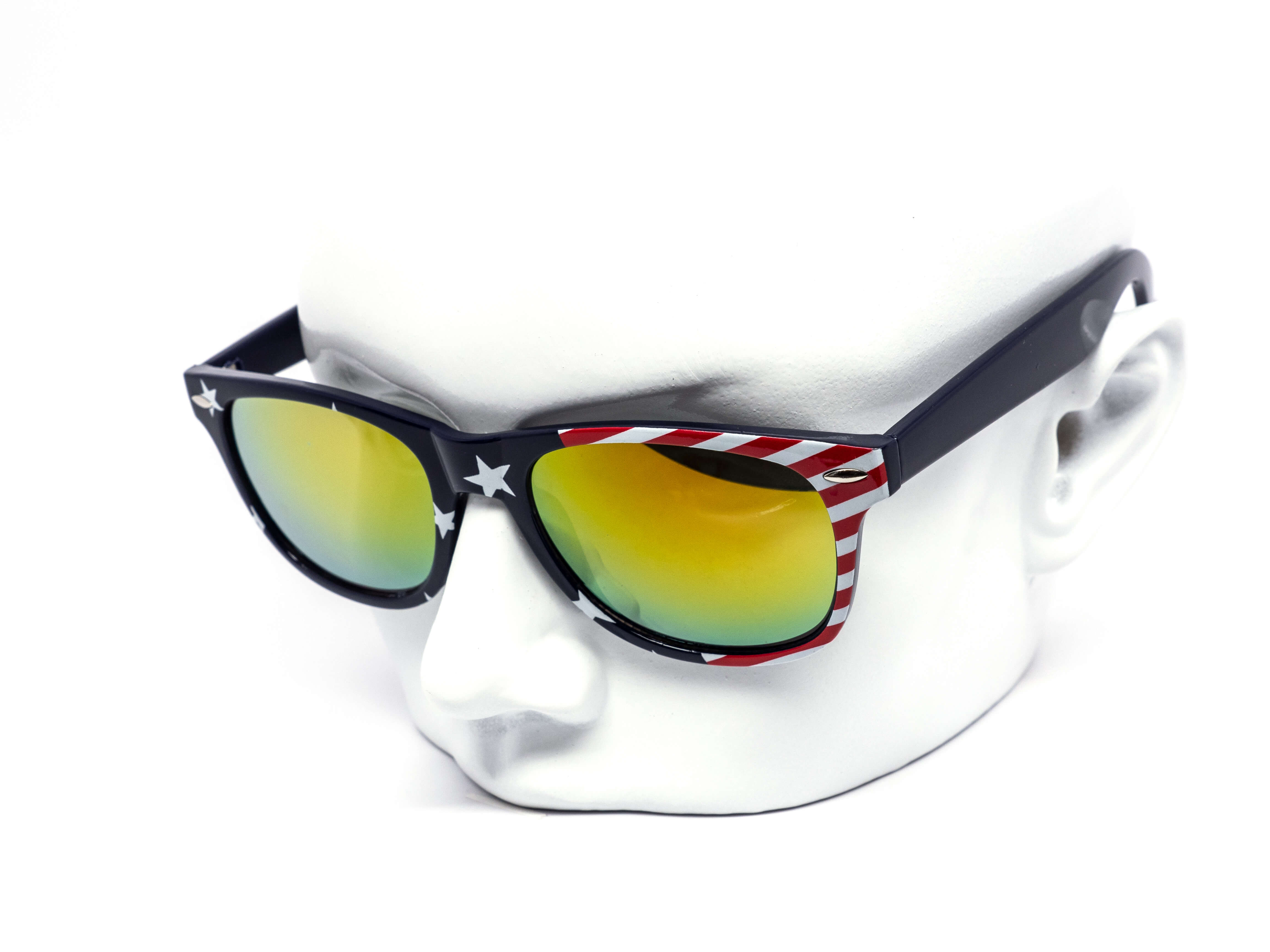 Star spangled USA Flag print on classic frame with color mirror lens. Comes assorted in two variations of American flag patterns. 6 flag pattern throughout the frame, 6 with nflag pattern on the temples. Let's go USA!