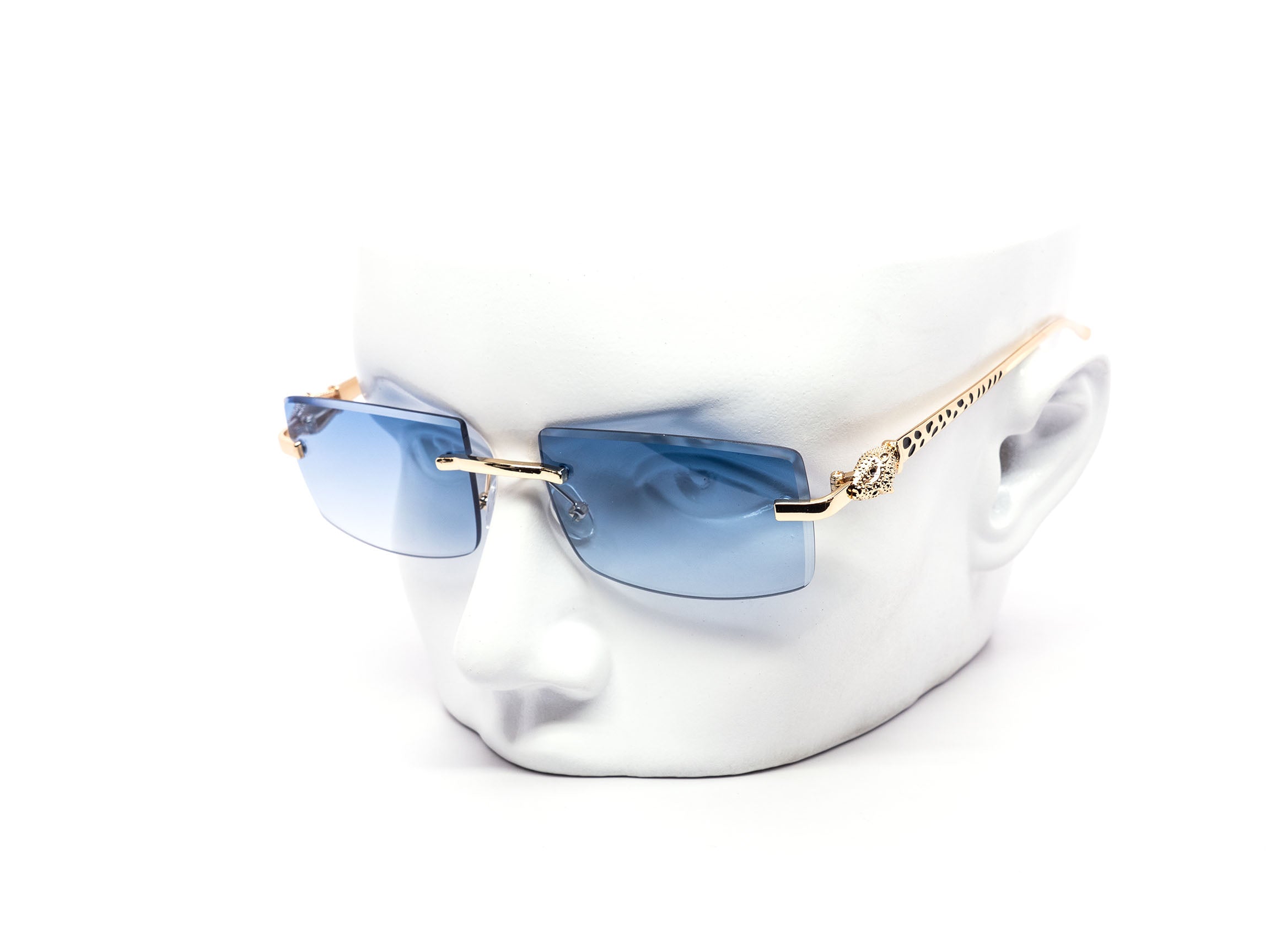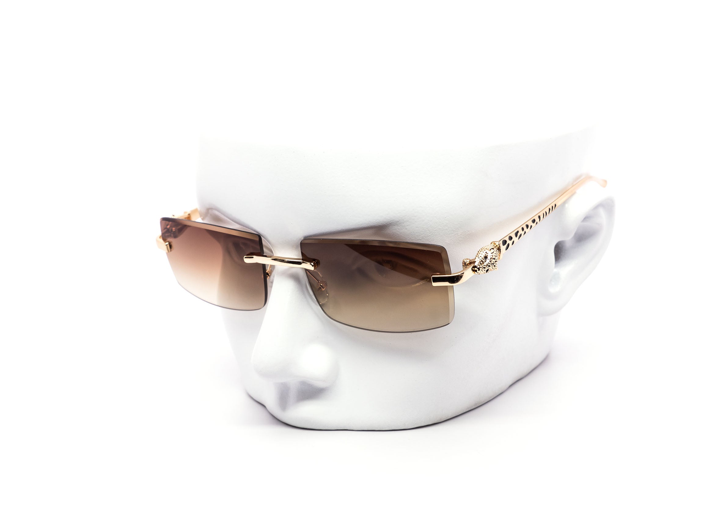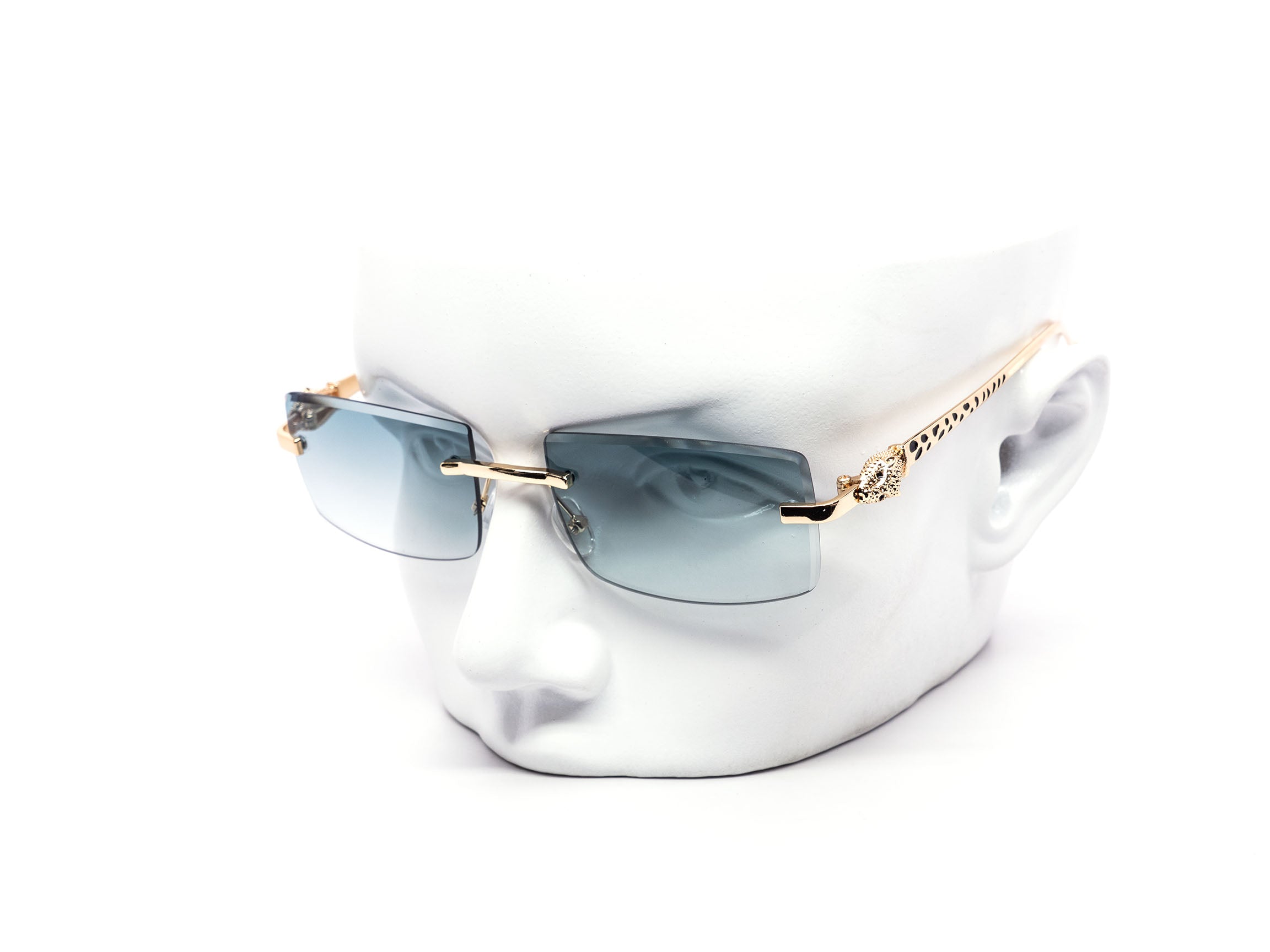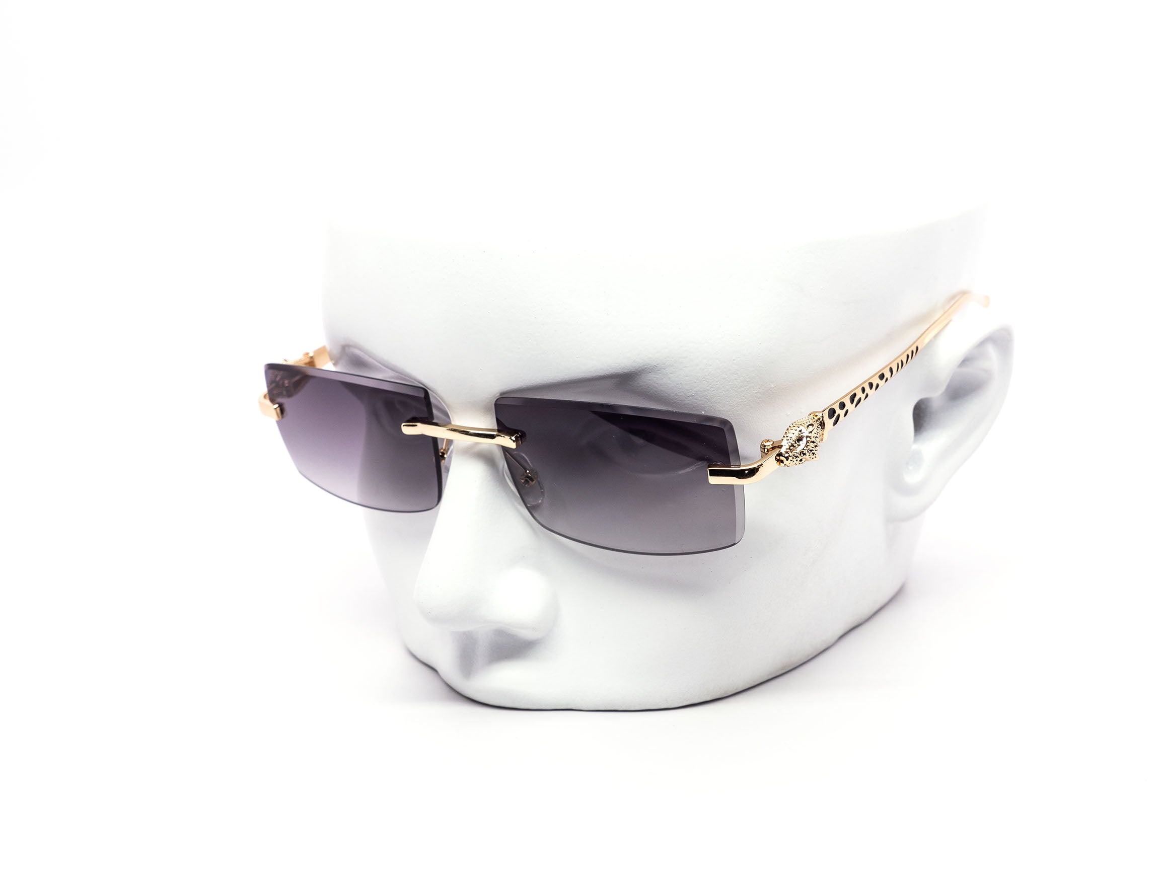 Embrace bold elegance with these rimless sunglasses featuring sleek, miter-cut square lenses and a slightly curved design. The metal temples are adorned with a fierce feline head and intricate jaguar pattern, adding a luxurious and exotic touch. Available in an assortment of gradient lens colors, these sunglasses are perfect for a high-end, distinctive look.