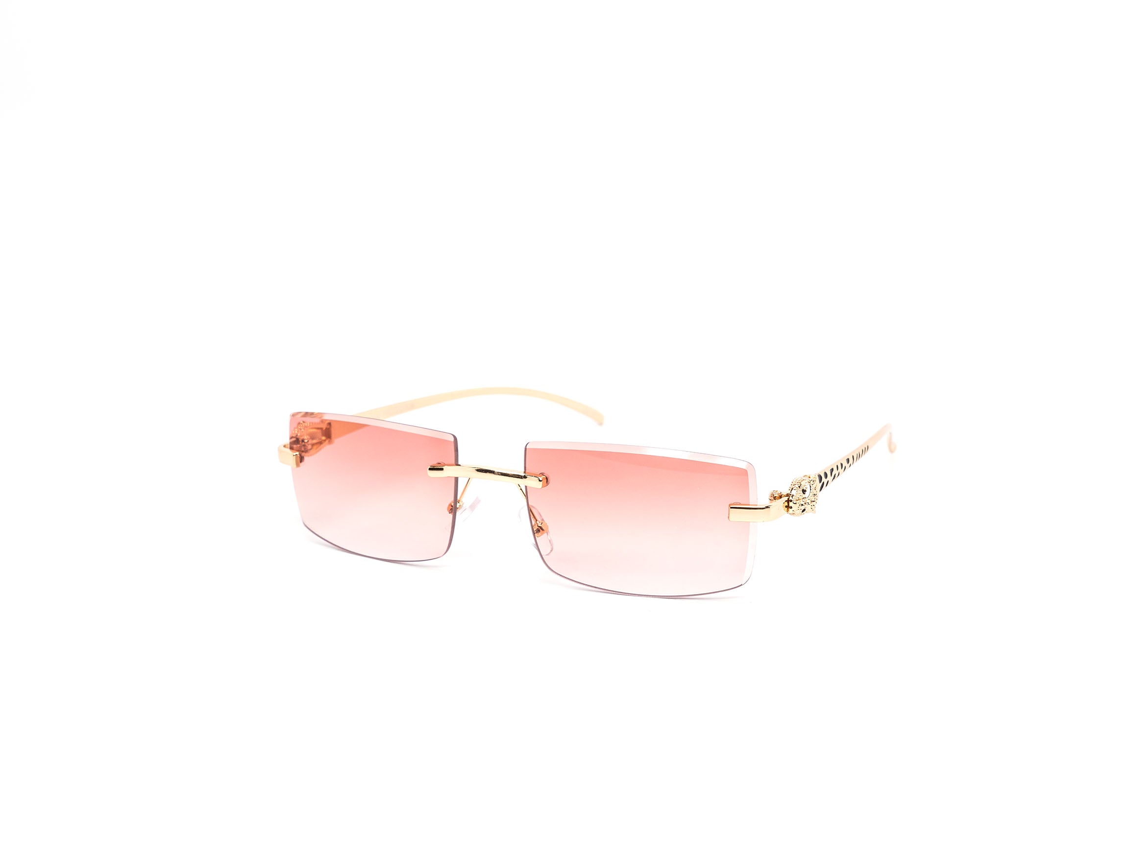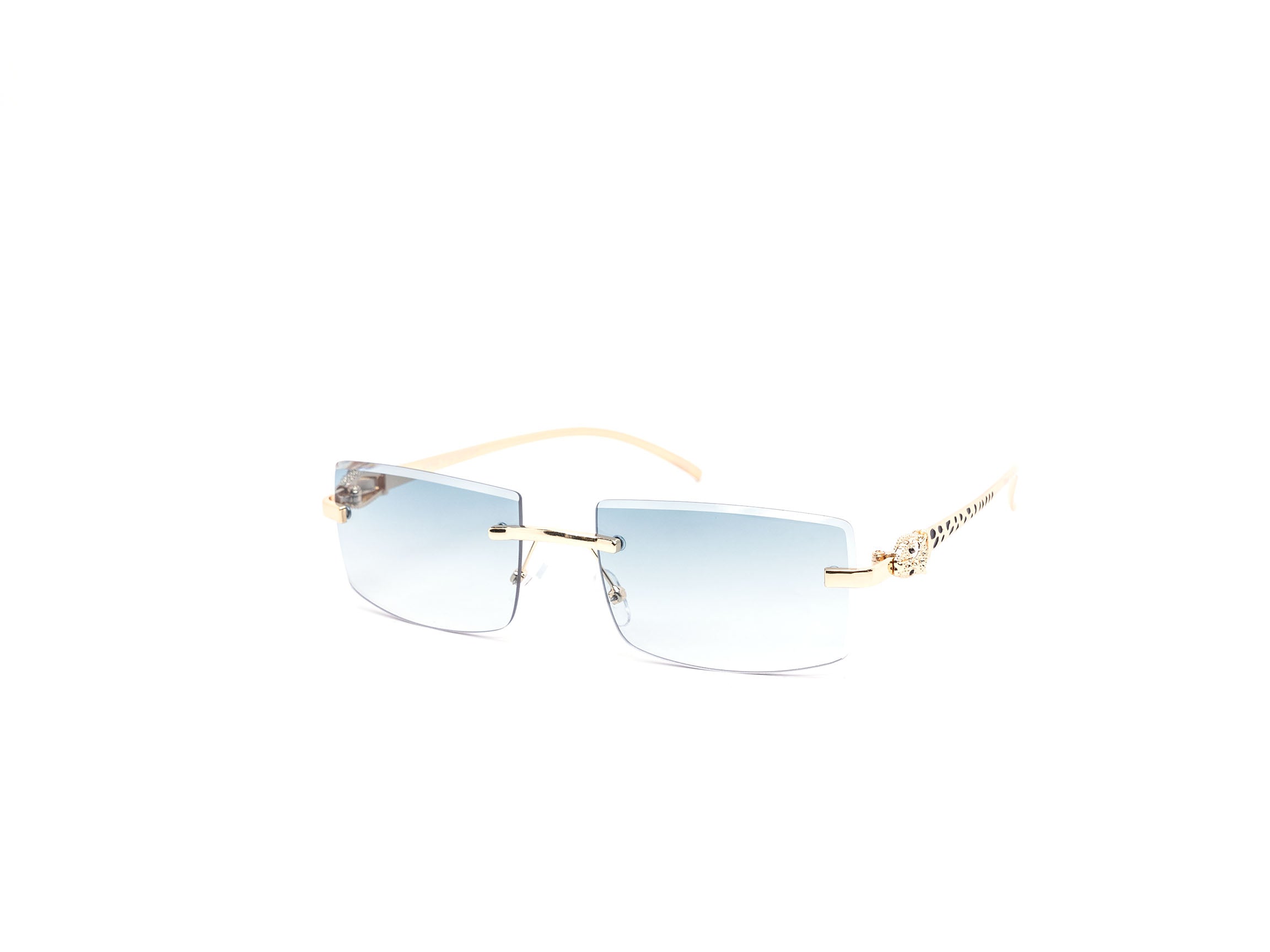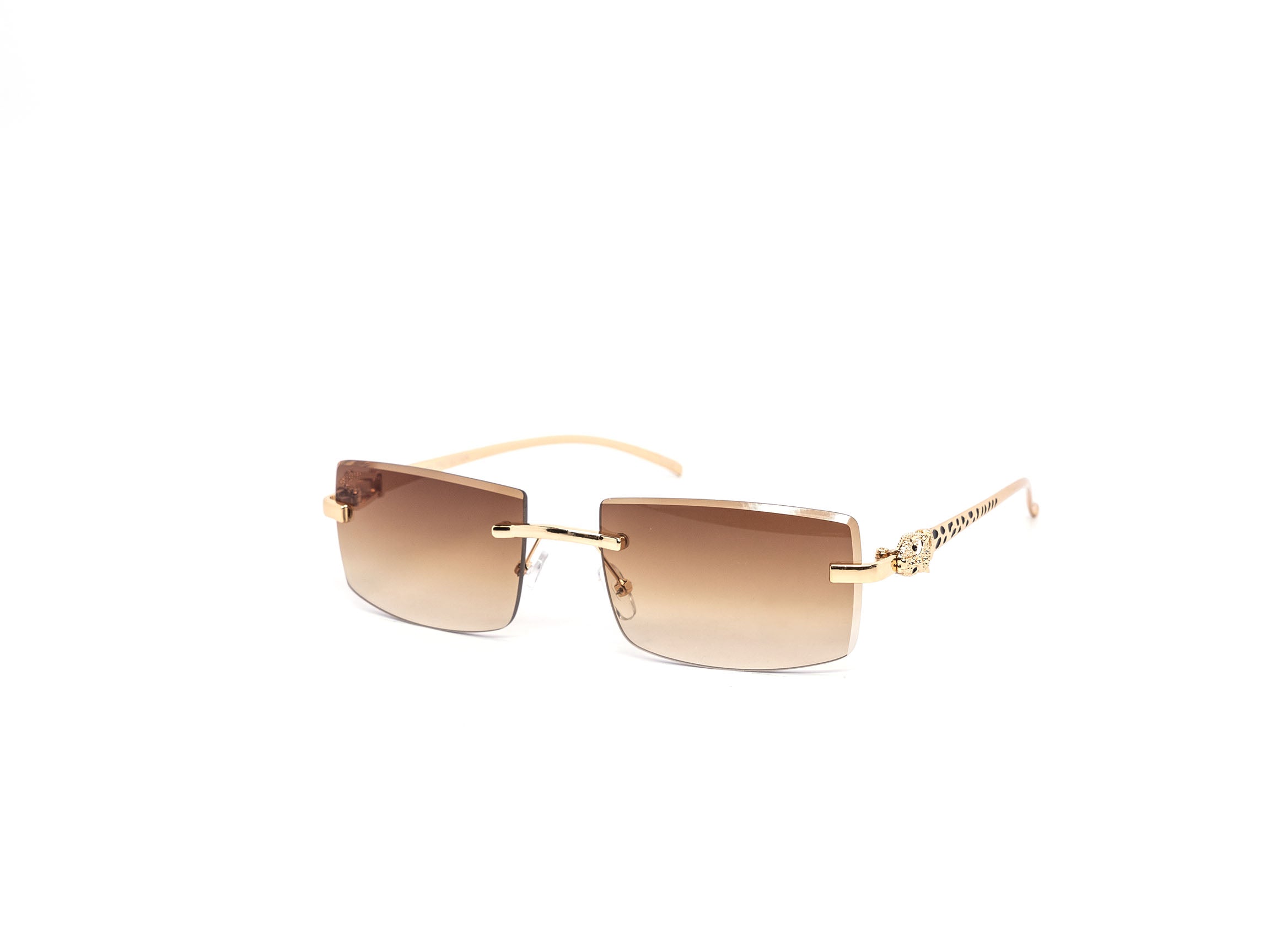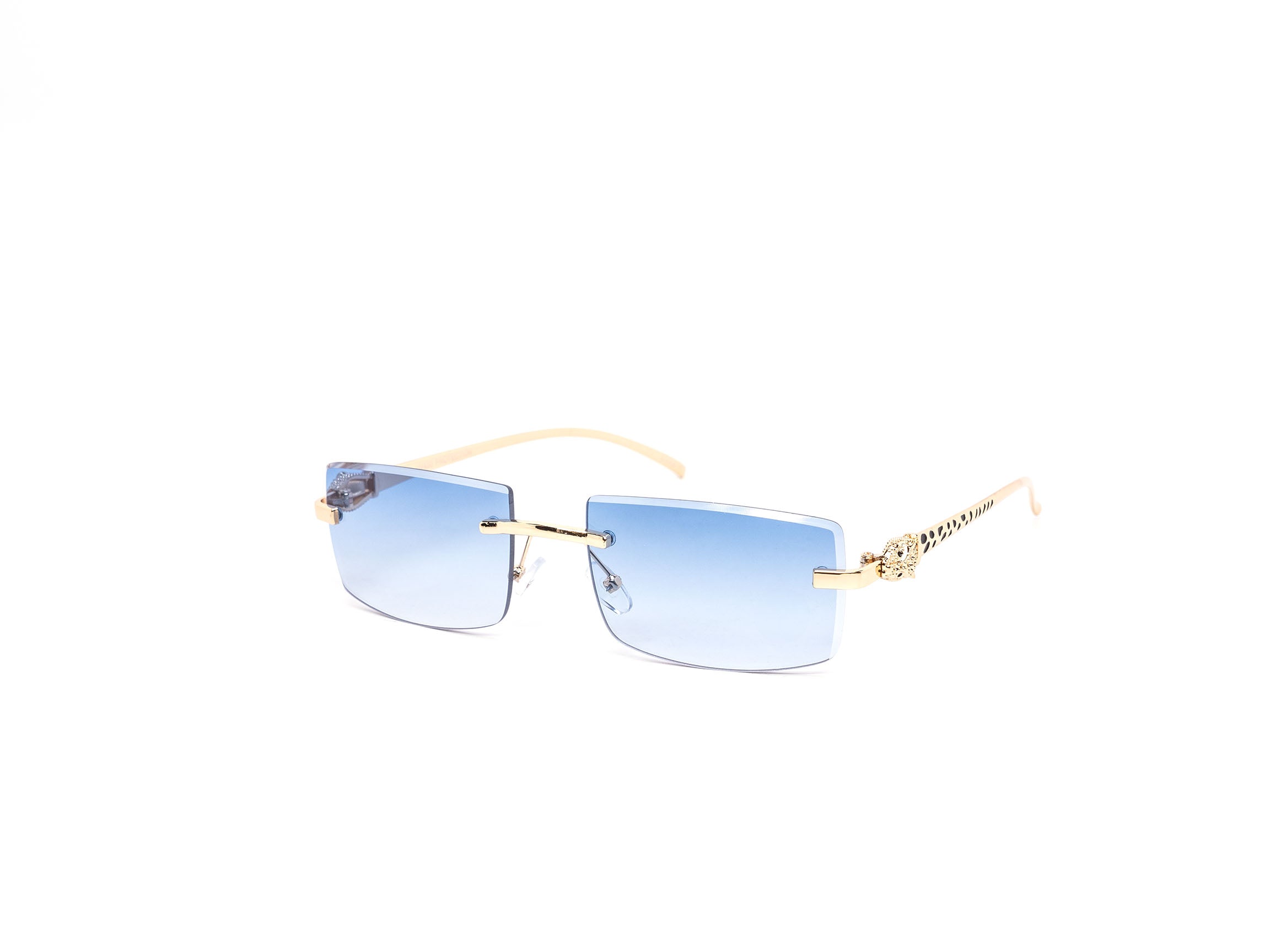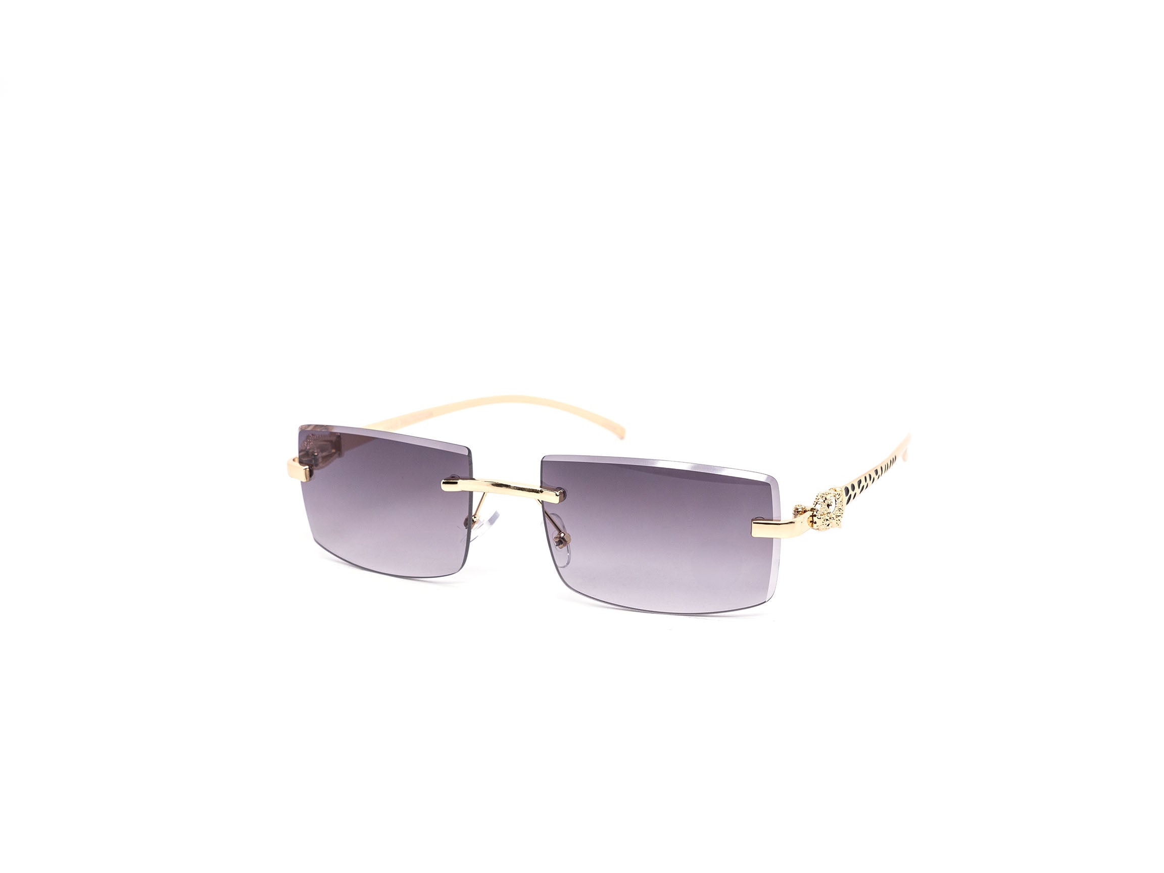 Embrace bold elegance with these rimless sunglasses featuring sleek, miter-cut square lenses and a slightly curved design. The metal temples are adorned with a fierce feline head and intricate jaguar pattern, adding a luxurious and exotic touch. Available in an assortment of gradient lens colors, these sunglasses are perfect for a high-end, distinctive look.