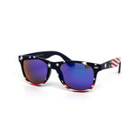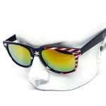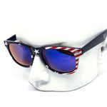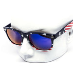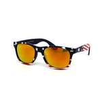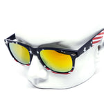 Star spangled USA Flag print on classic frame with color mirror lens. Comes assorted in two variations of American flag patterns. 6 flag pattern throughout the frame, 6 with no flag pattern on the temples. Let's go USA!