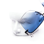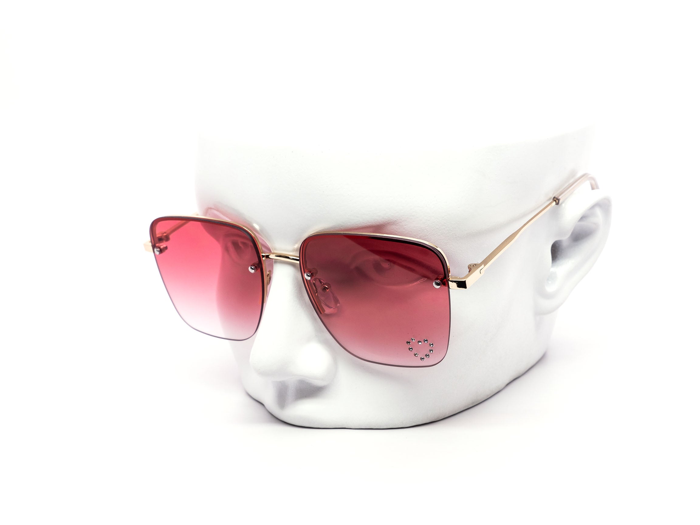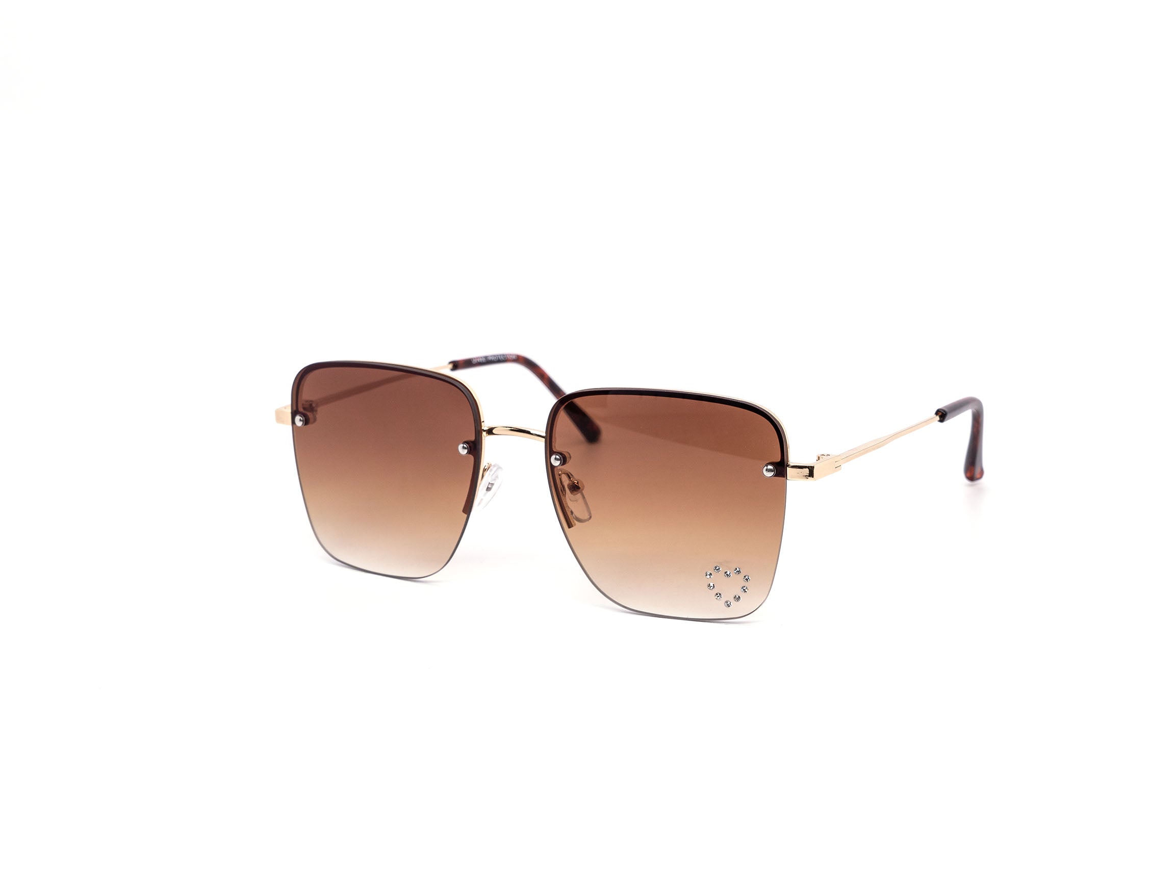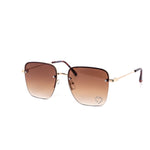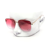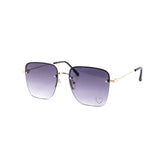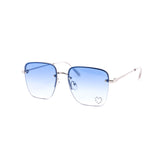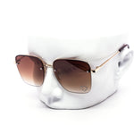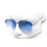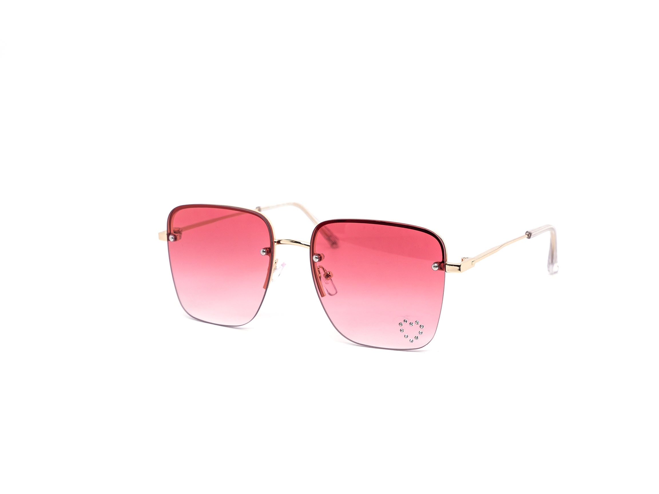 These stylish oversized rimless sunglasses are designed with a chic metal frame and feature a unique rhinestone heart detail embedded into each lens, adding a touch of sparkle.