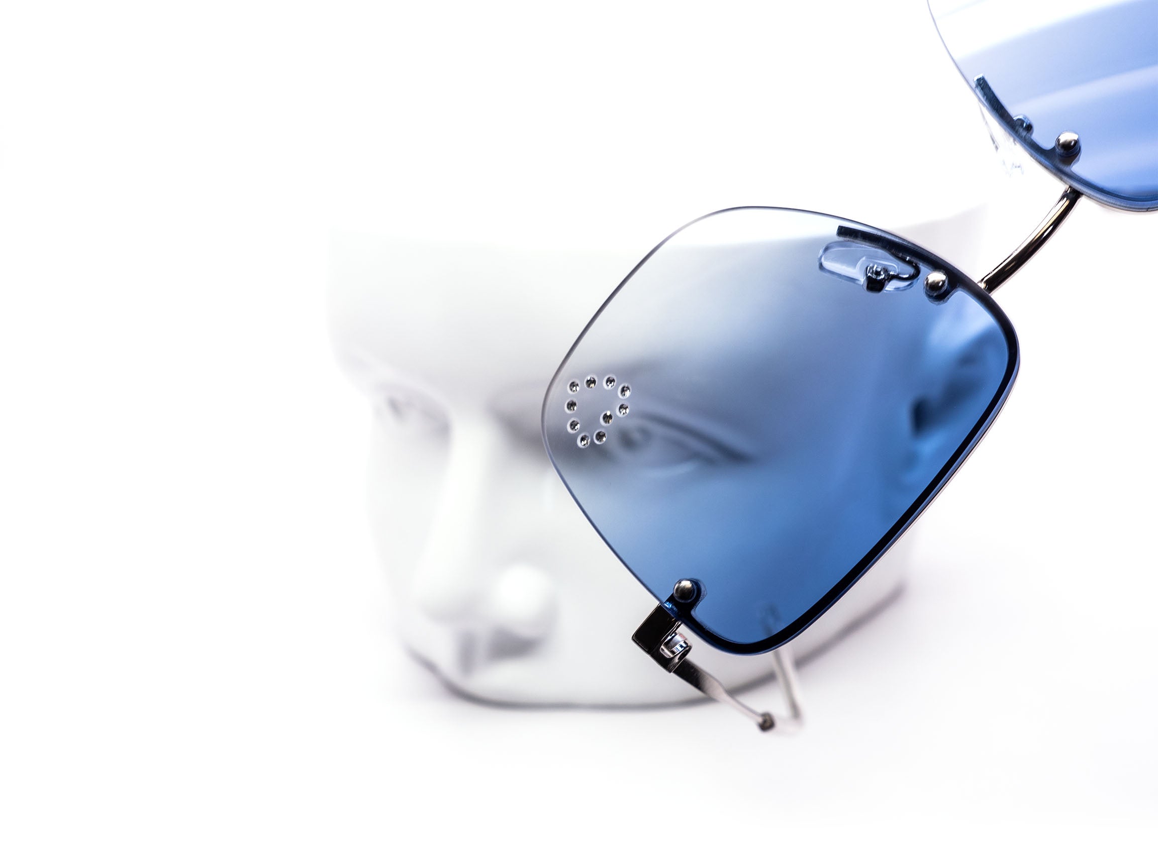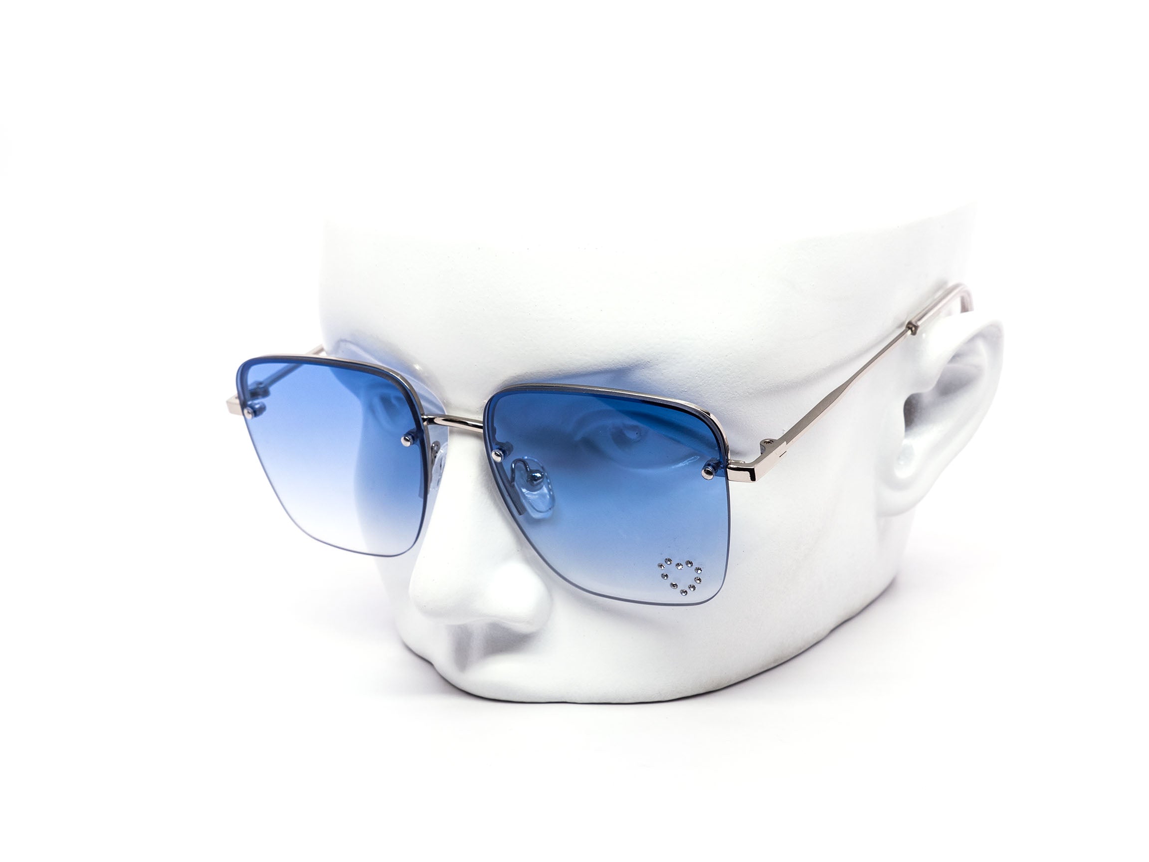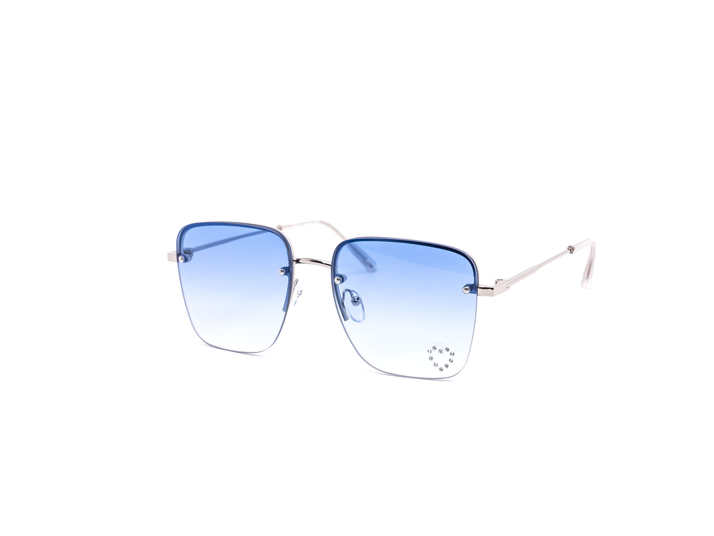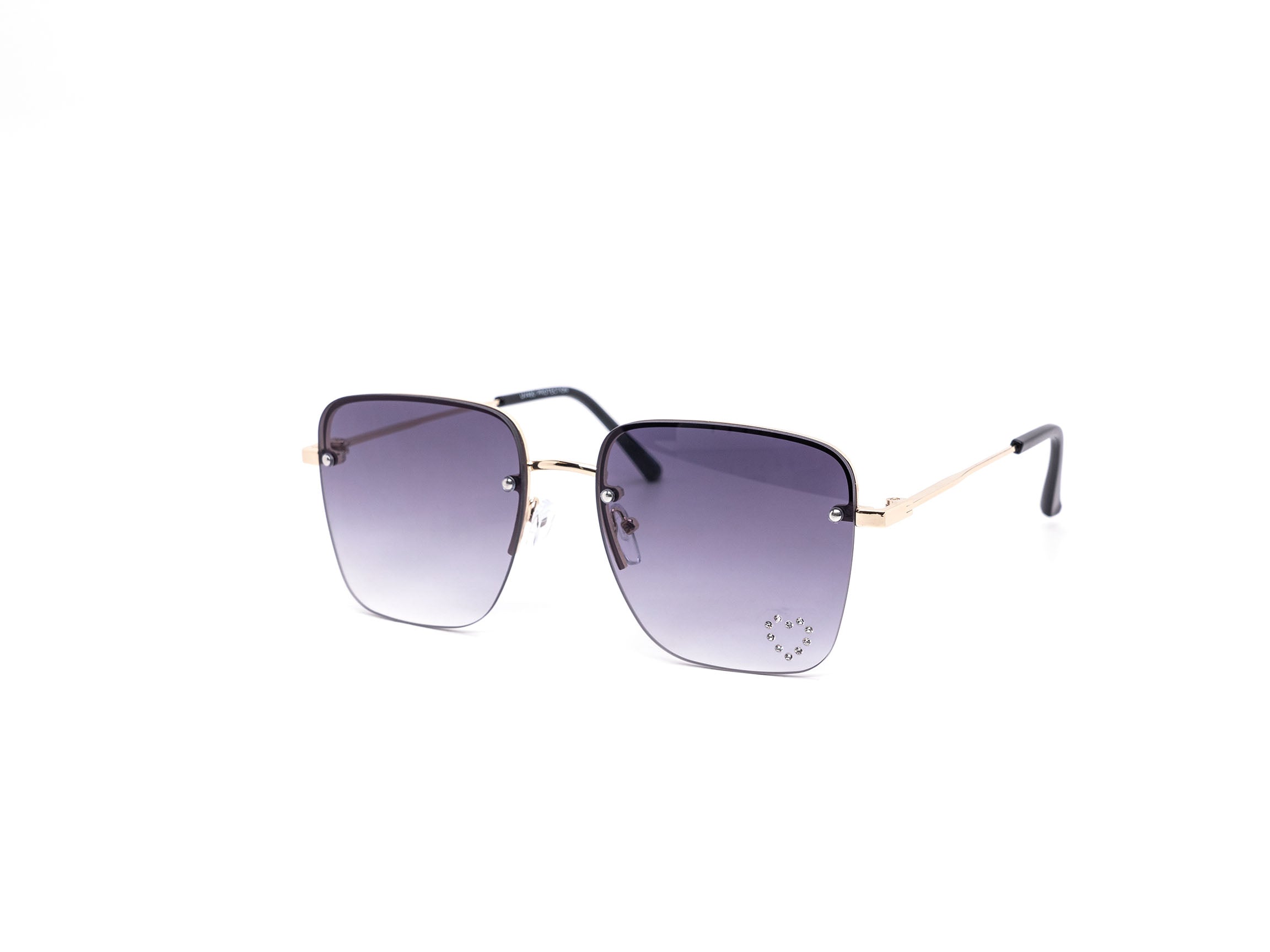 These stylish oversized rimless sunglasses are designed with a chic metal frame and feature a unique rhinestone heart detail embedded into each lens, adding a touch of sparkle.