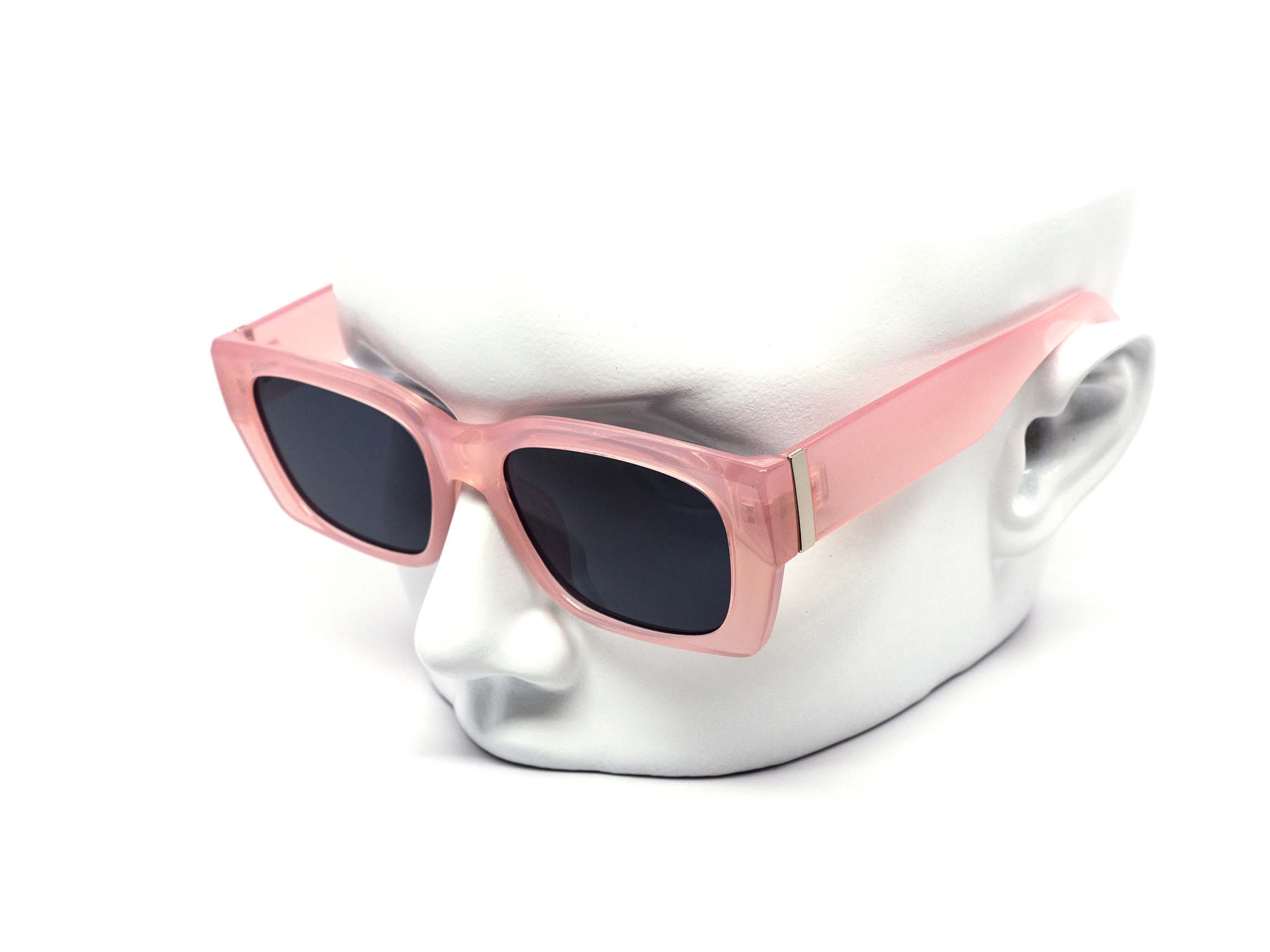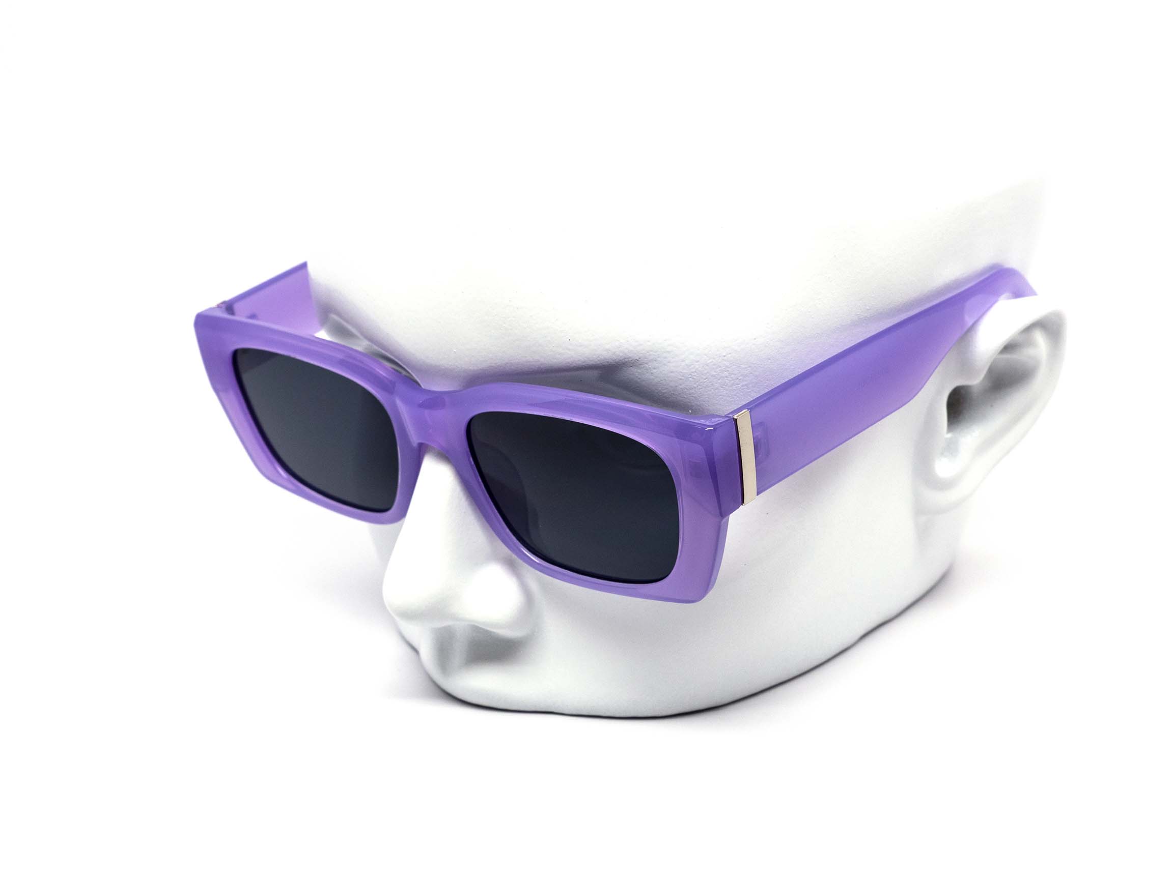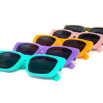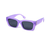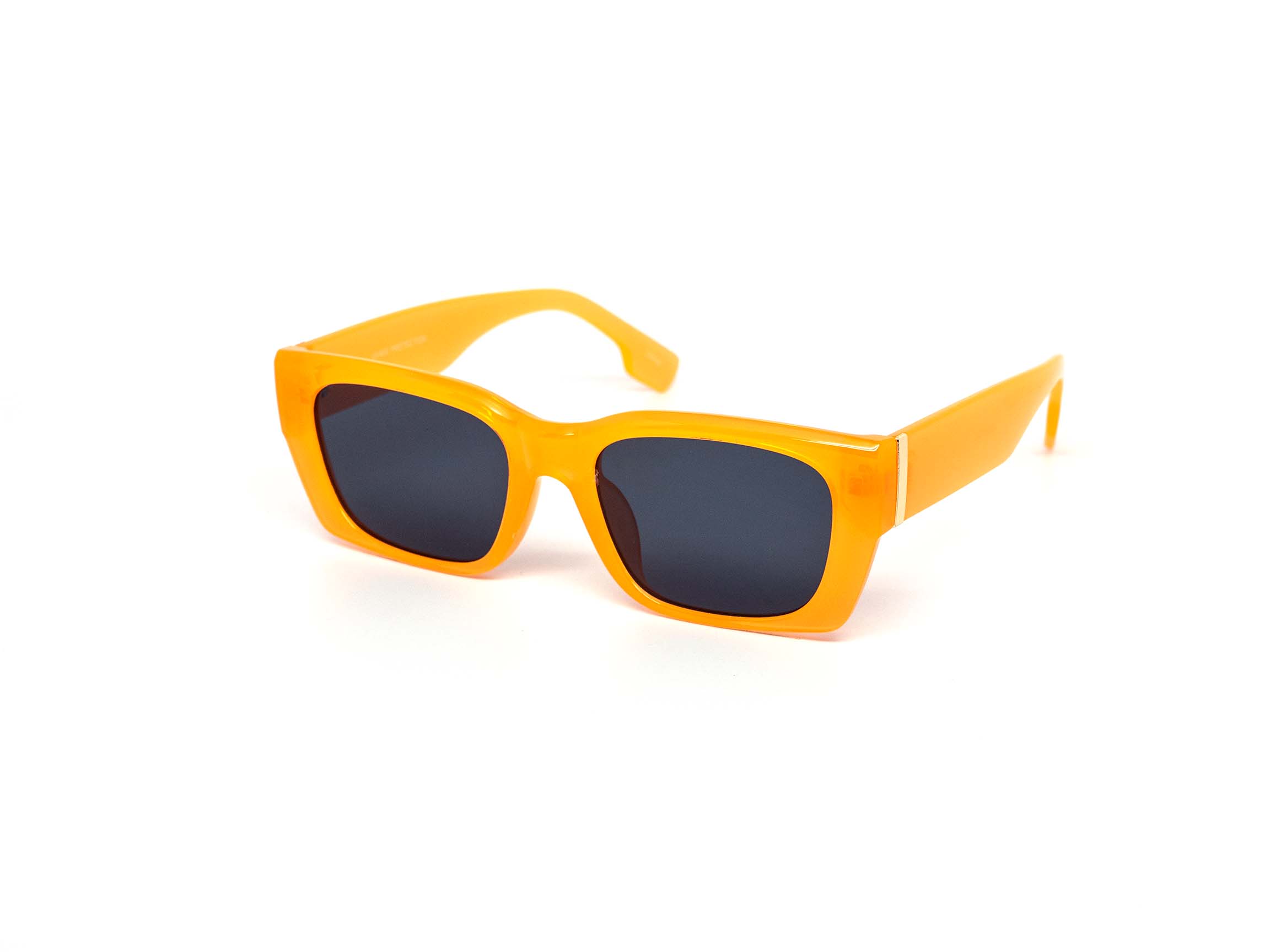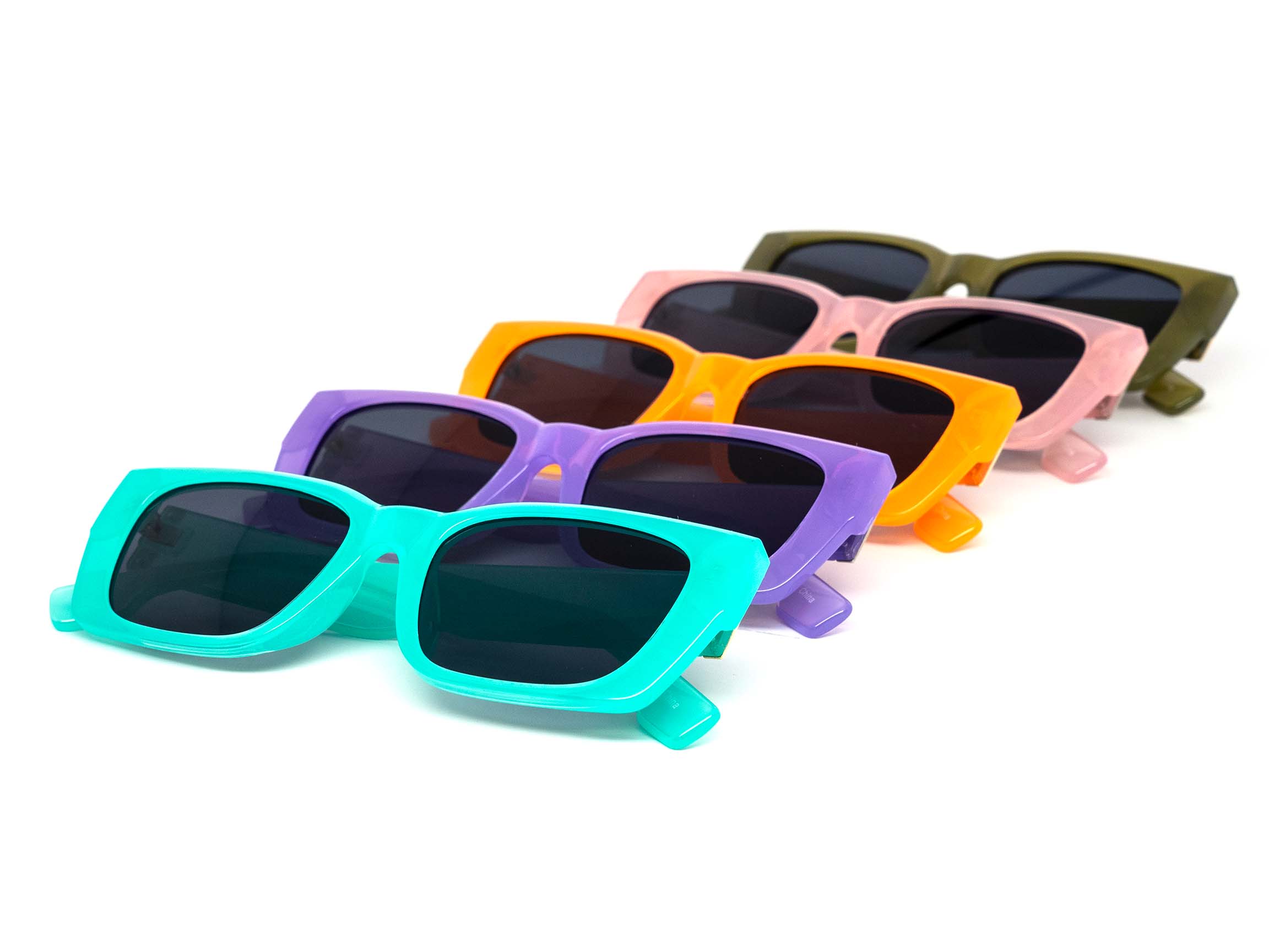 Gentle minimalistic rectangular flat design with assorted high contrast colored frames and dark lens. Metal accent bar on the sides. Simply stylish high fashion.