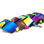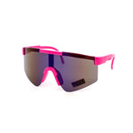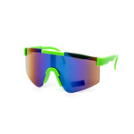 Rimless solid face shield design for the kiddos! These trendy shades come in assorted color mirror lens and 80s fluorescent colored frame combos.