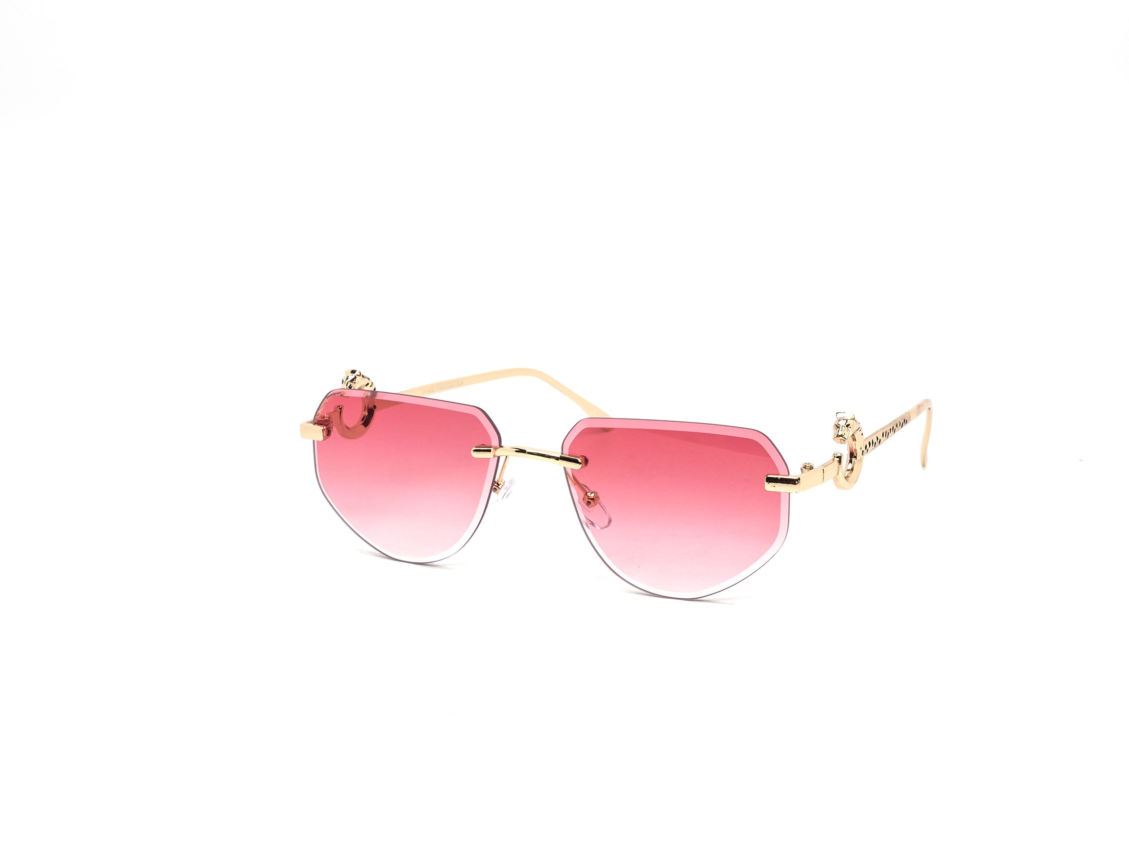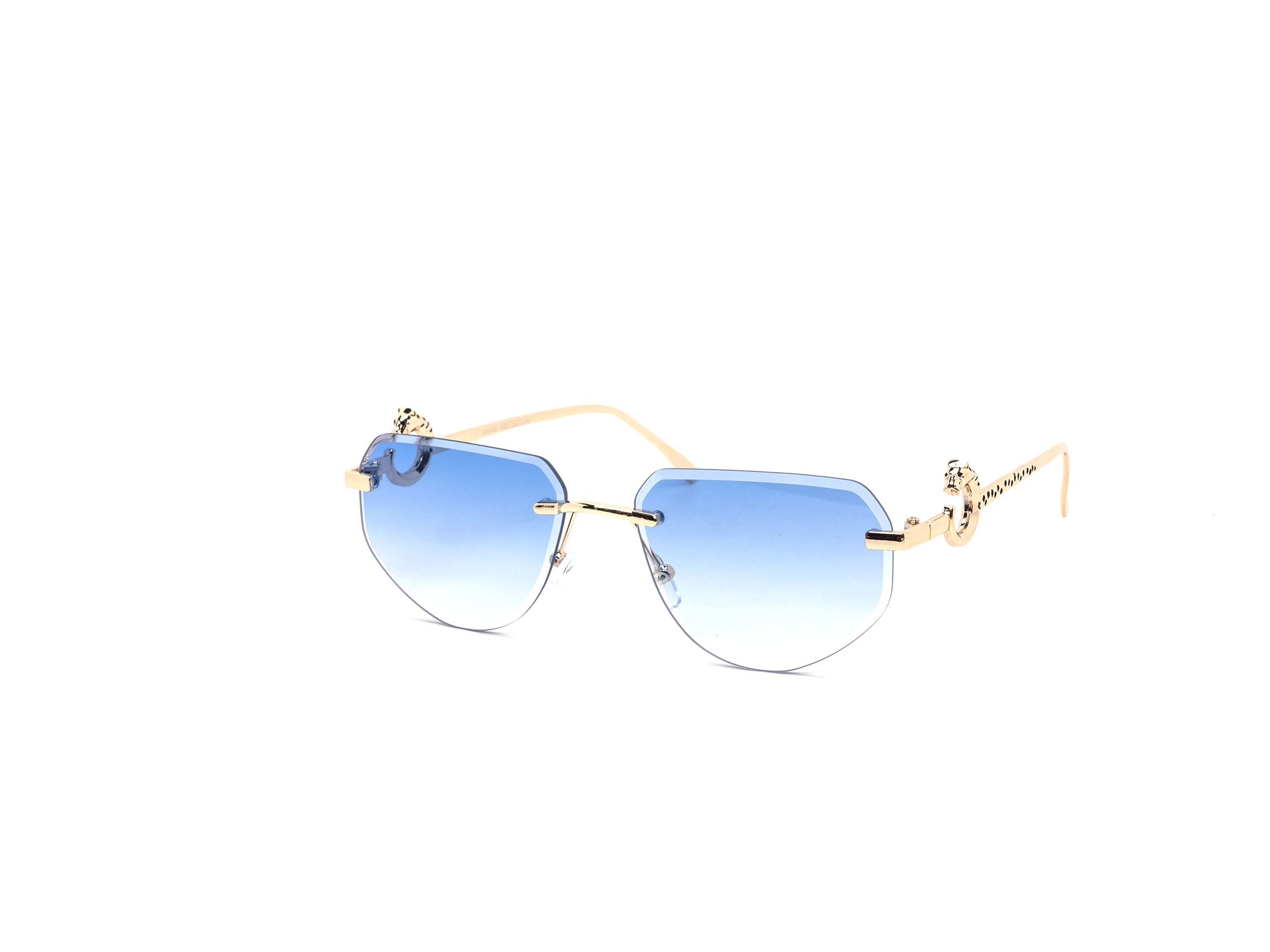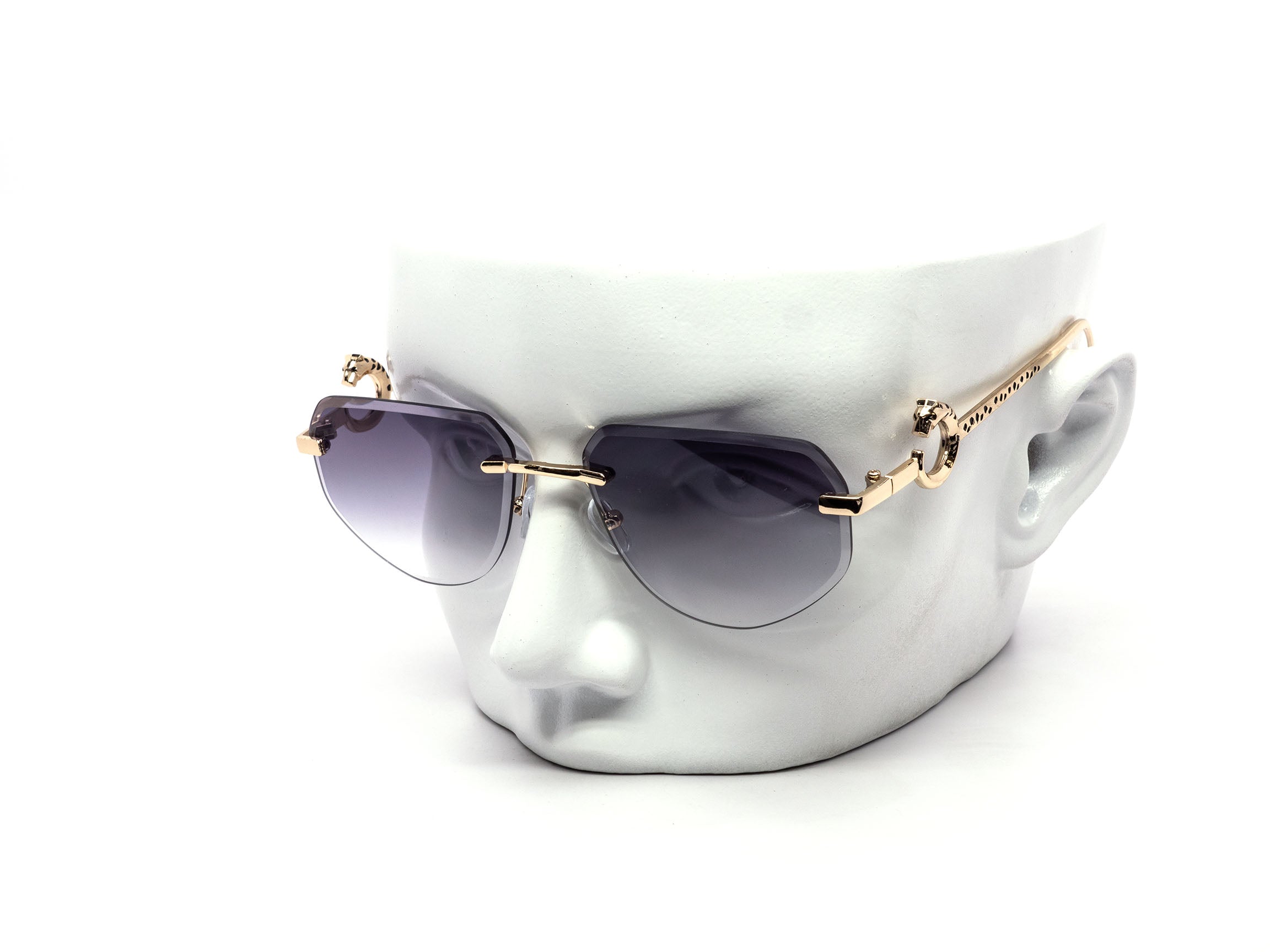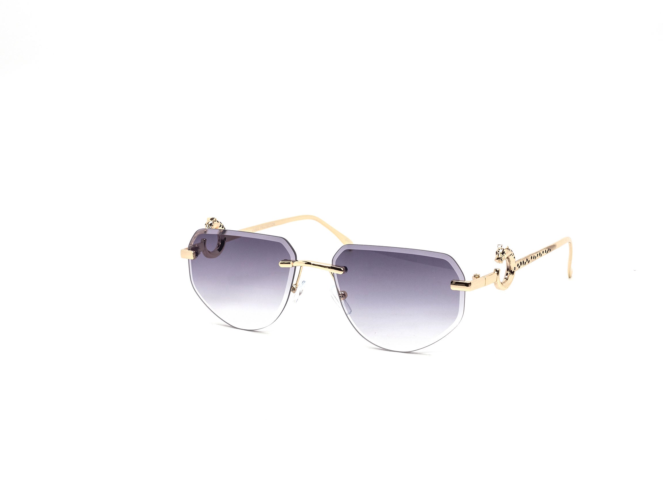Make a statement with these super sleek, miter-cut rimless sunglasses featuring elegant gold temples adorned with fierce feline-inspired accents. This luxurious style is complemented by an assortment of stunning gradient lenses in fun and vibrant colors, adding sophistication to any outfit.