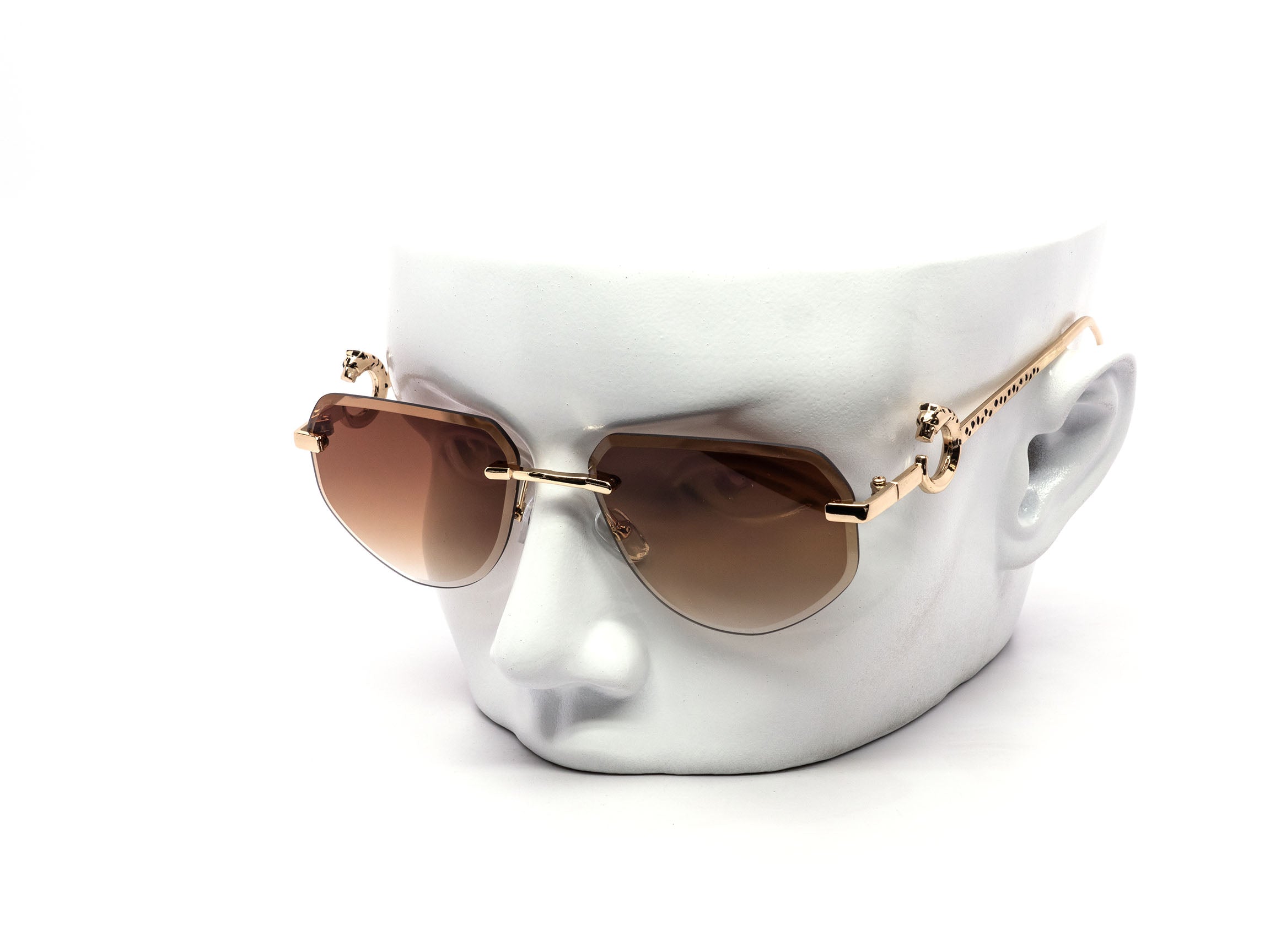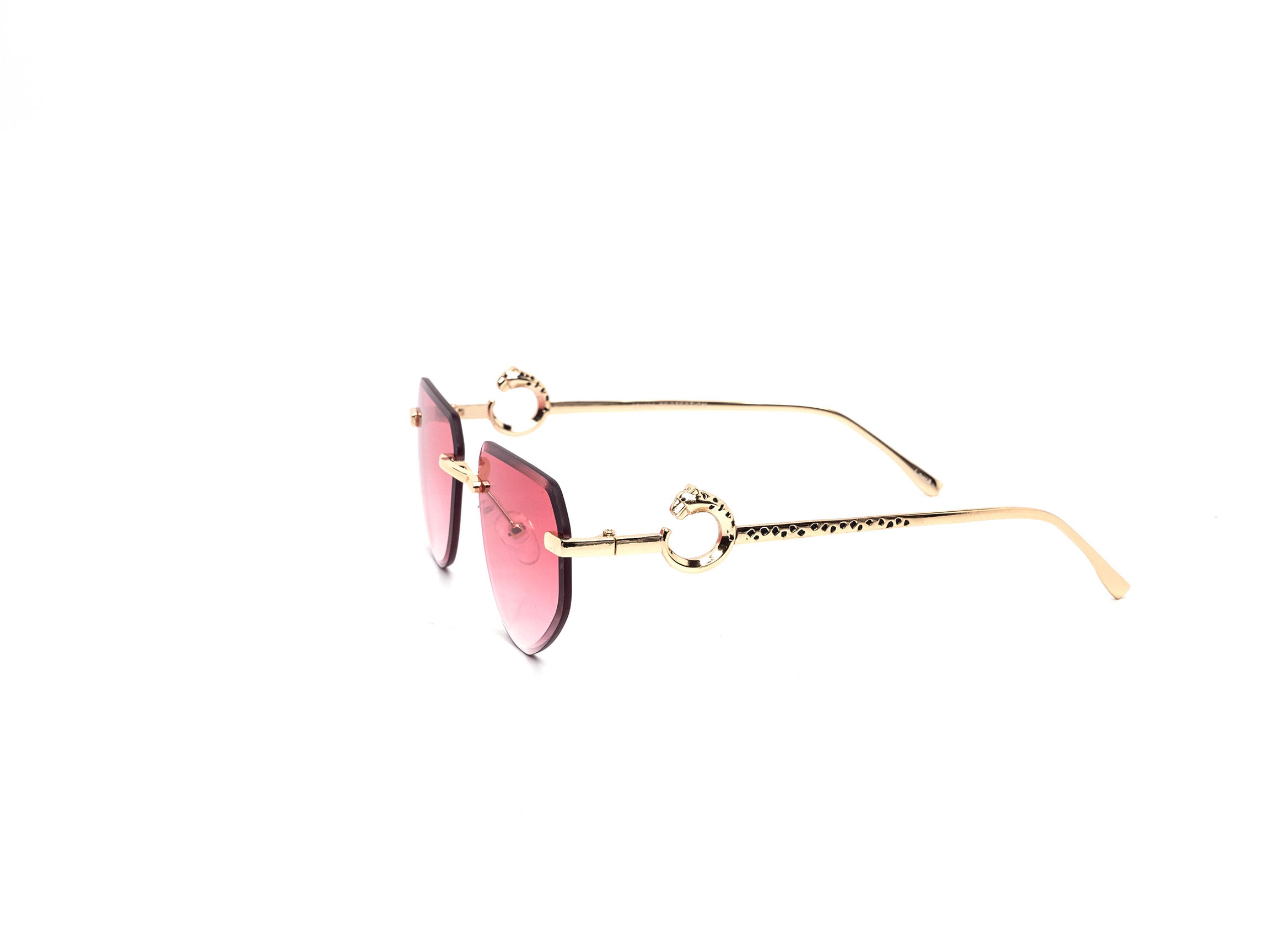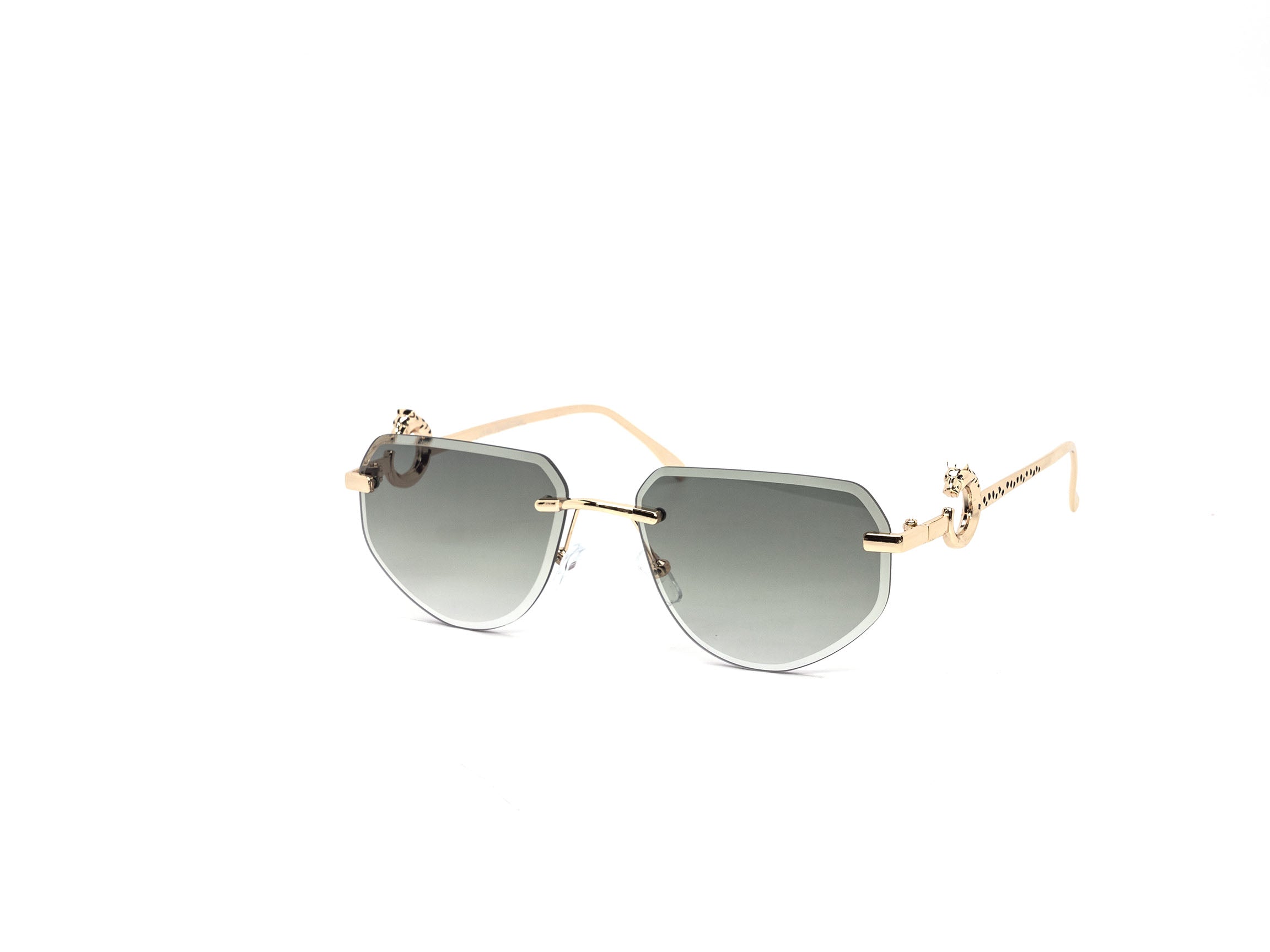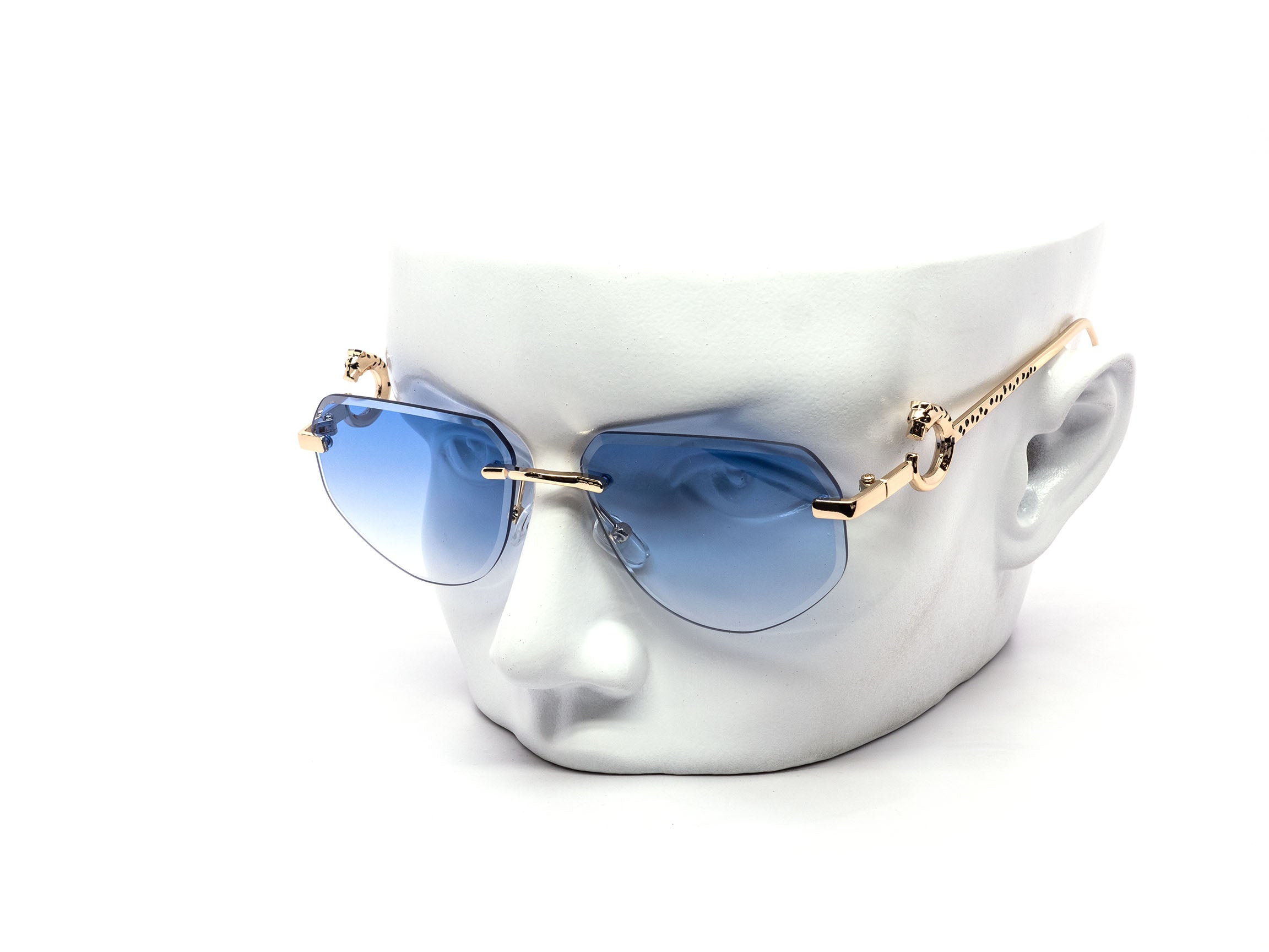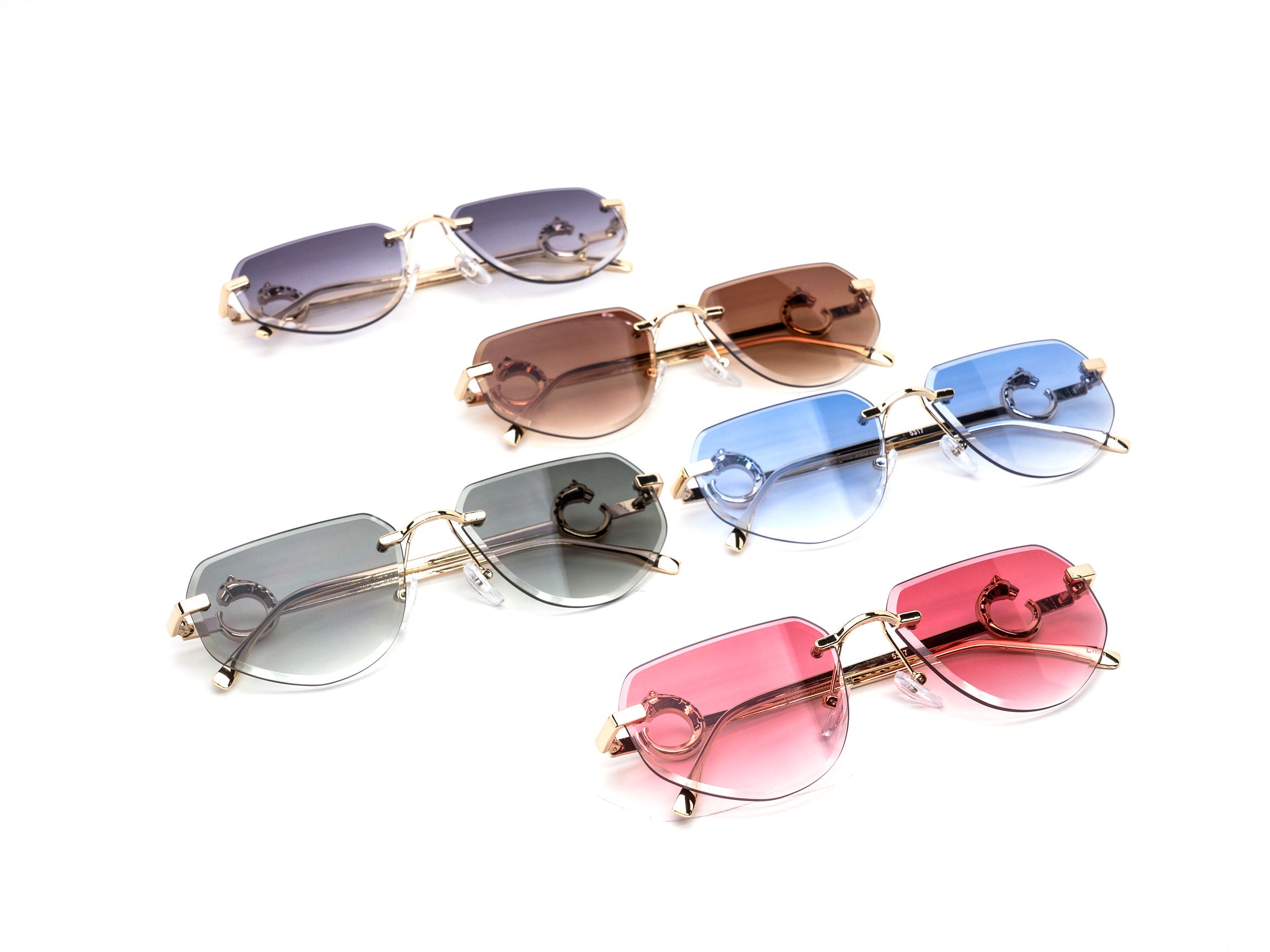 Make a statement with these super sleek, miter-cut rimless sunglasses featuring elegant gold temples adorned with fierce feline-inspired accents. This luxurious style is complemented by an assortment of stunning gradient lenses in fun and vibrant colors, adding sophistication to any outfit.