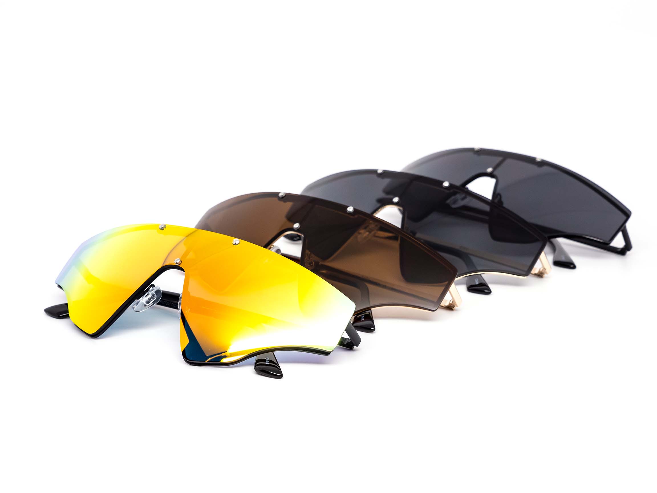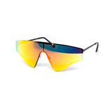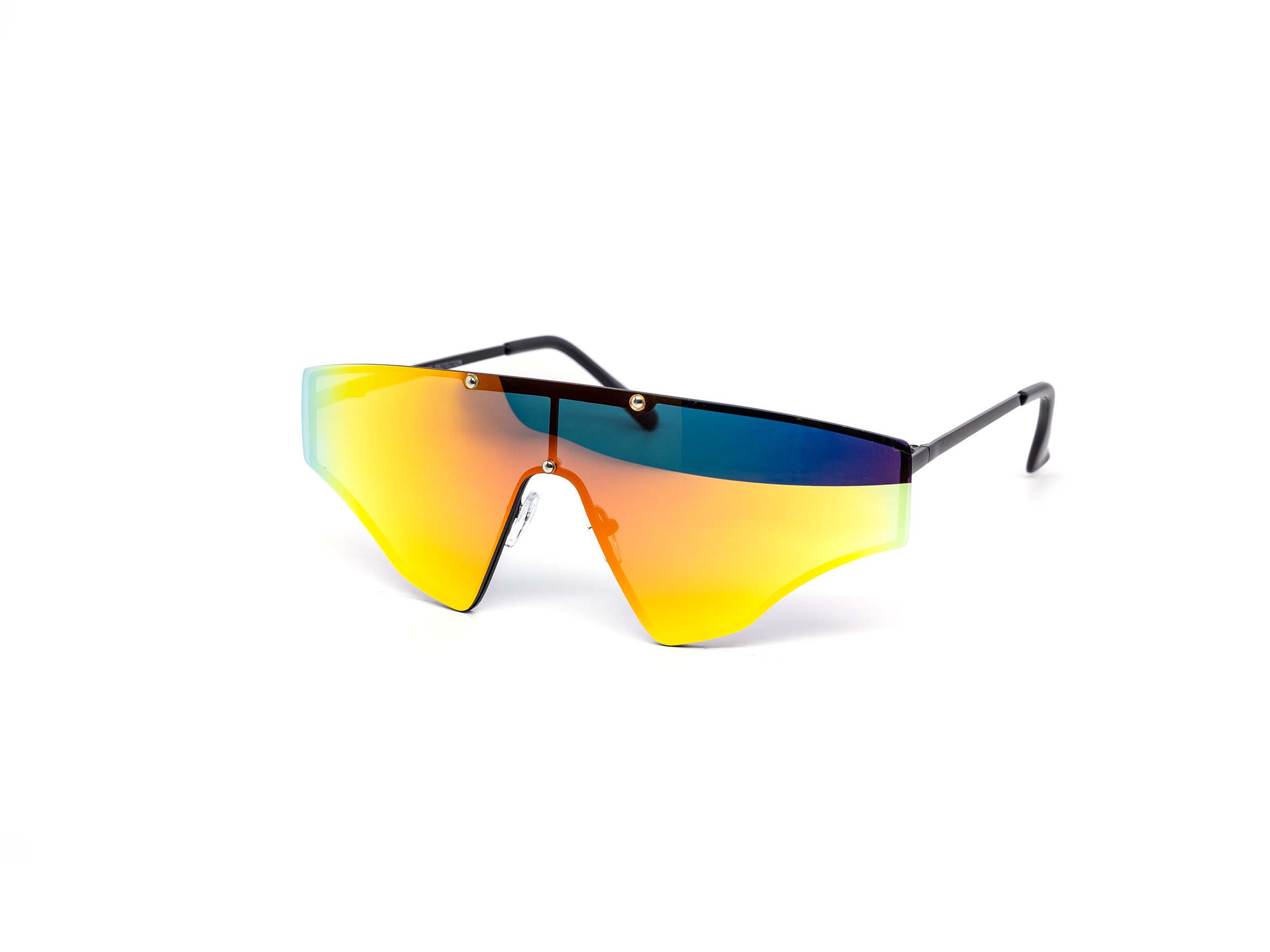 High fashion skinny rimless sports shield style which comes in assorted color mirror, yellow, and dark lens. Assorted color metal frames.