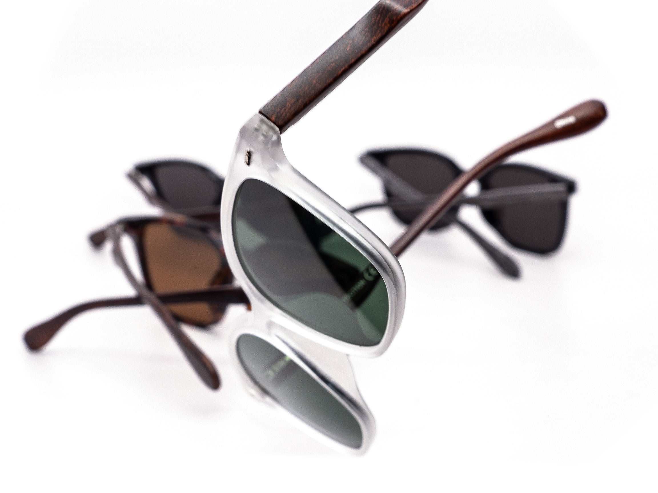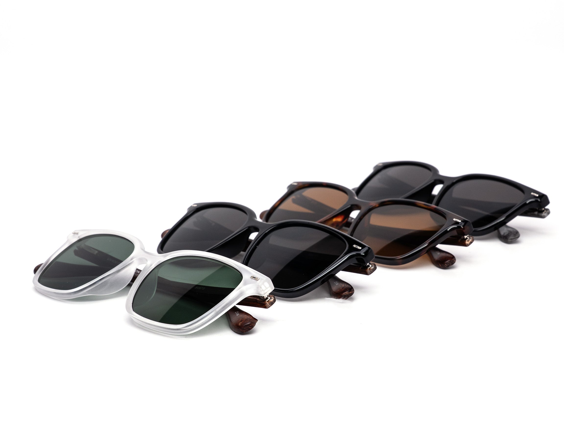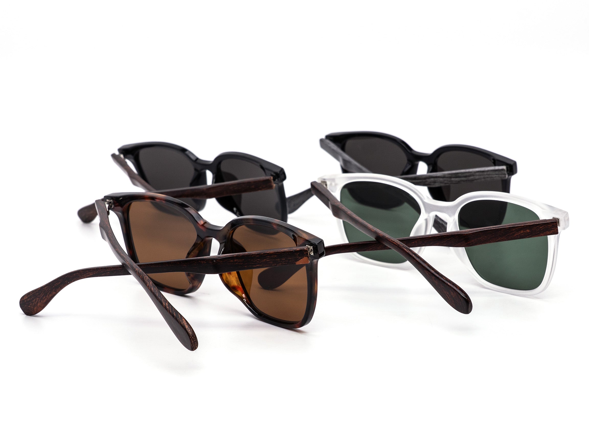 A timeless design with a natural twist. These classic wayfarer-style frames combine smooth wooden temples with a bold acetate front for a refined and relaxed look. Each box includes a mix of neutral tones such as clear frost, glossy black, and deep tortoise. Perfect for everyday wear or outdoor adventures.