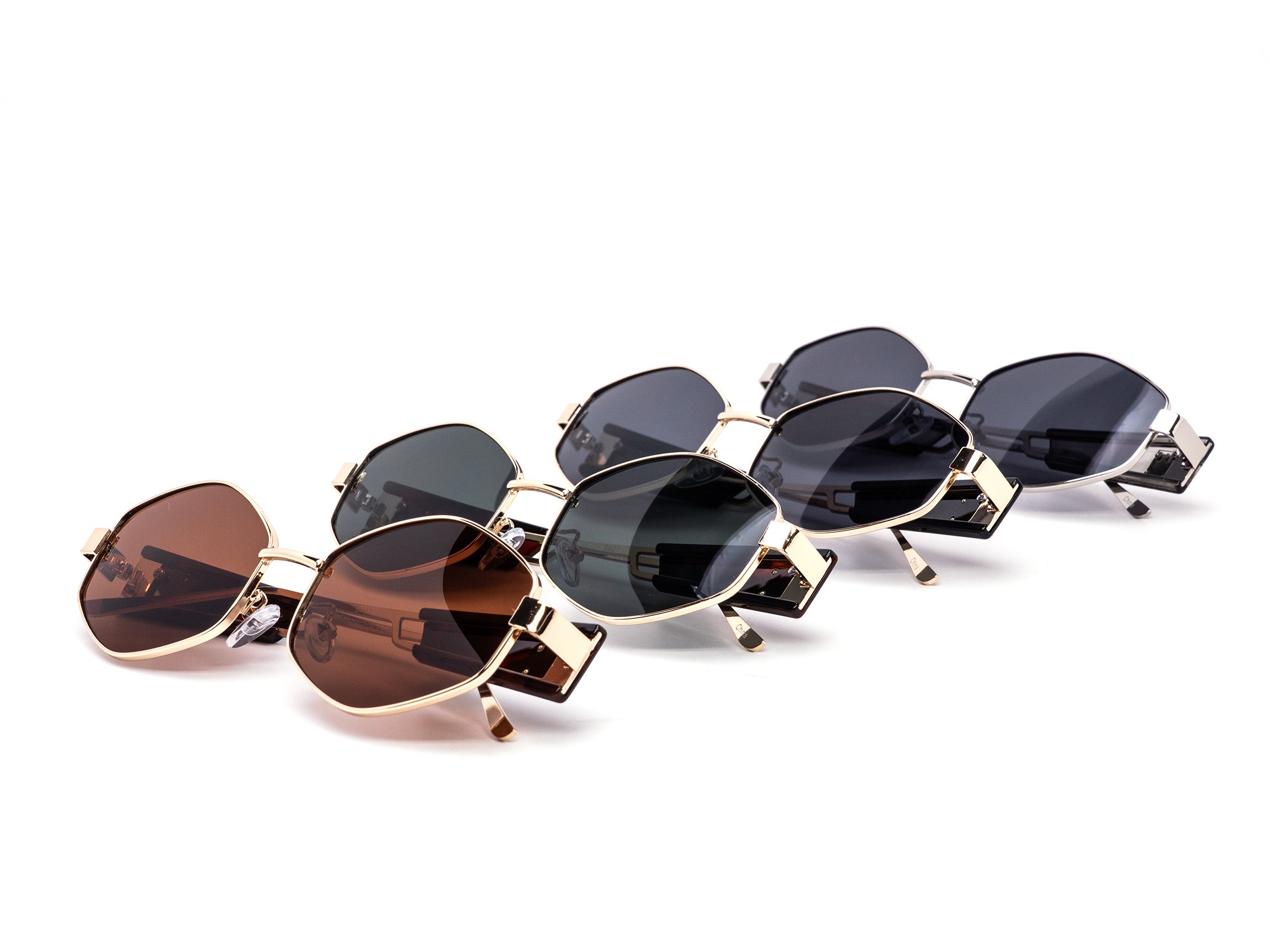 Modern hexagon metal frames paired with bold chunky PC temples for a clean, fashion-forward look. Finished with subtle metal accents on the sides that add just the right amount of edge. A strong statement piece that still feels wearable for everyday retail. Comes in 4 classy color ways mixed in each dozen.
