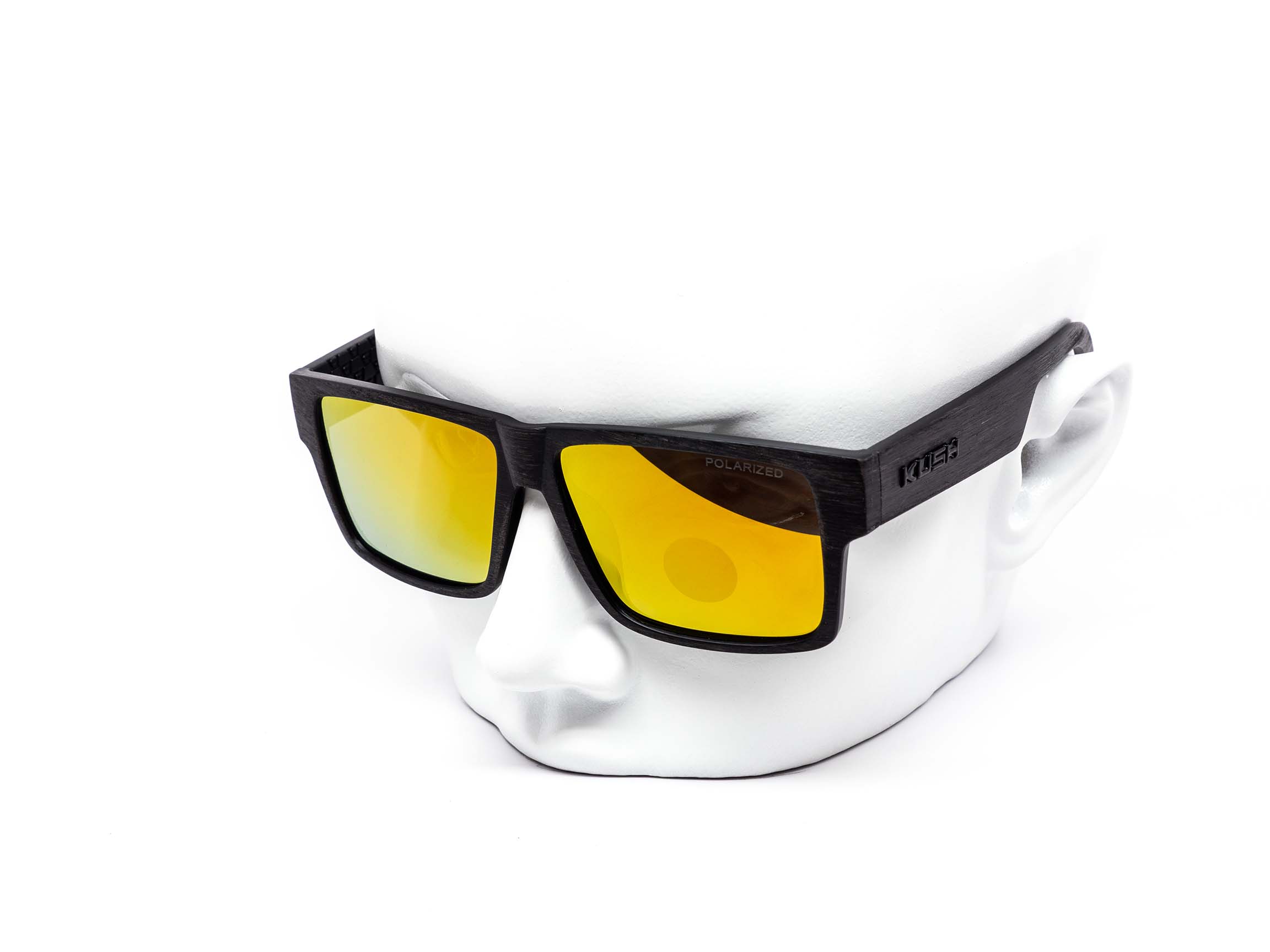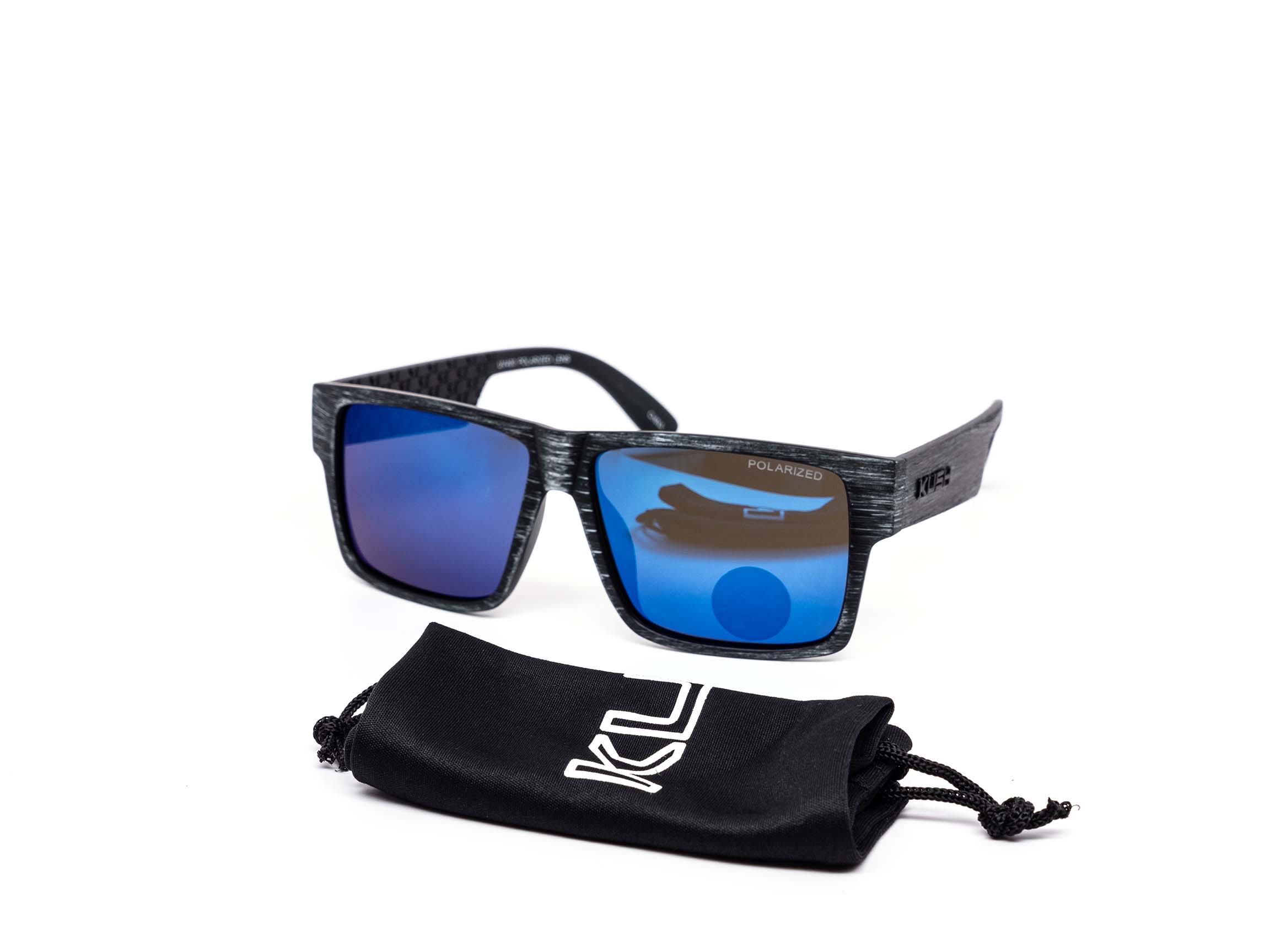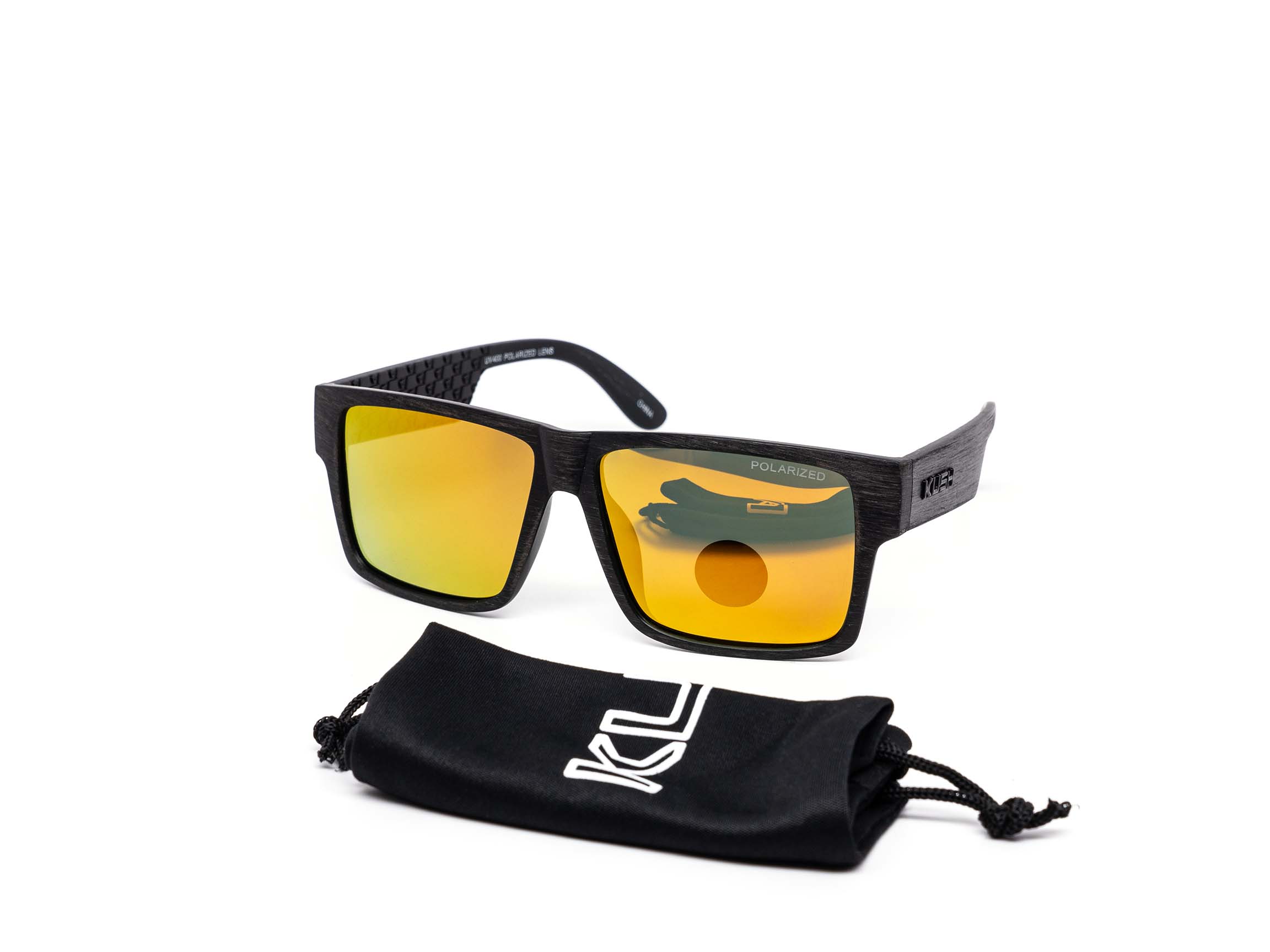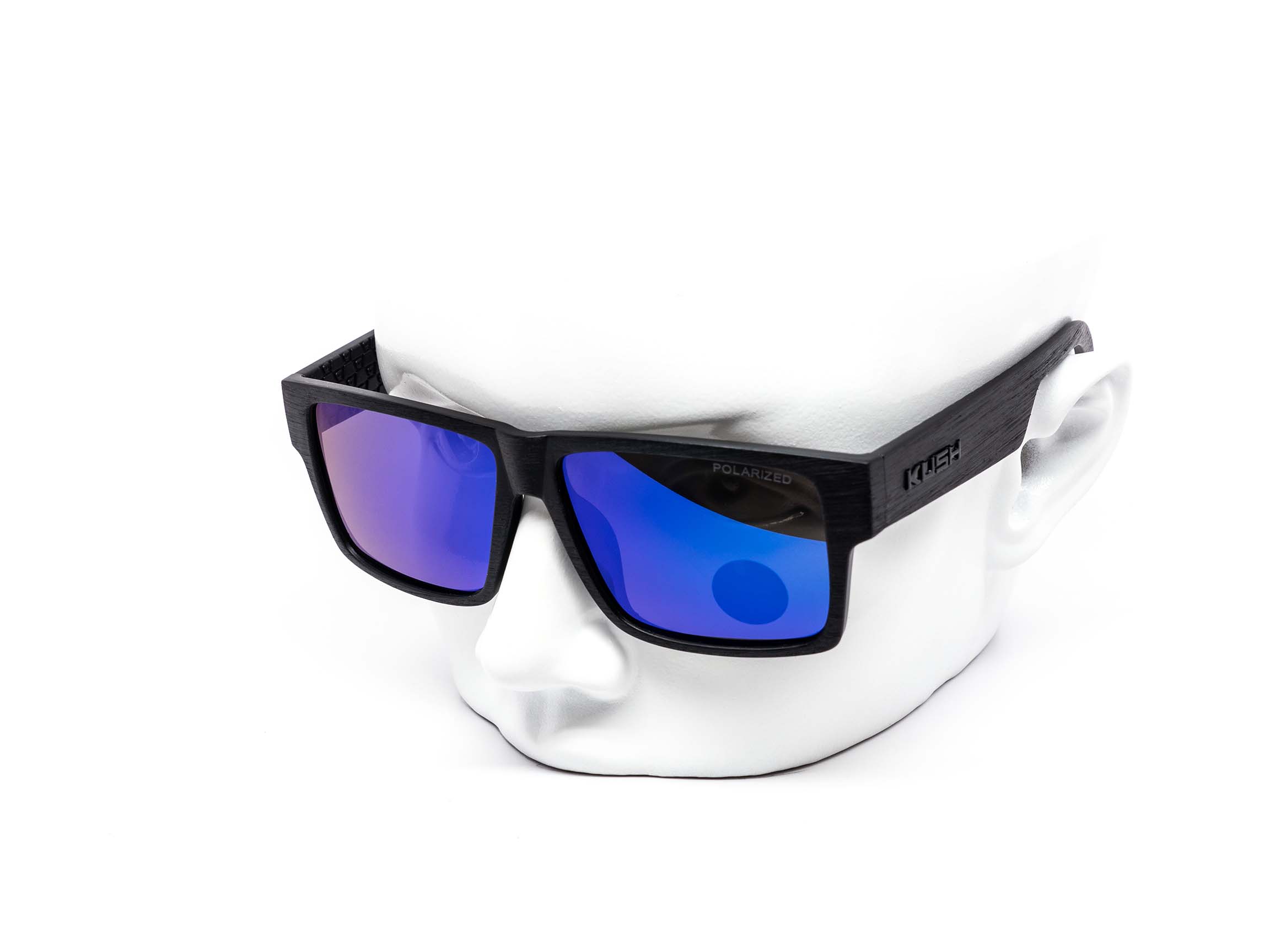 Polarized wood pattern straight top square design with black Kush logos on the temple and color mirror lens.