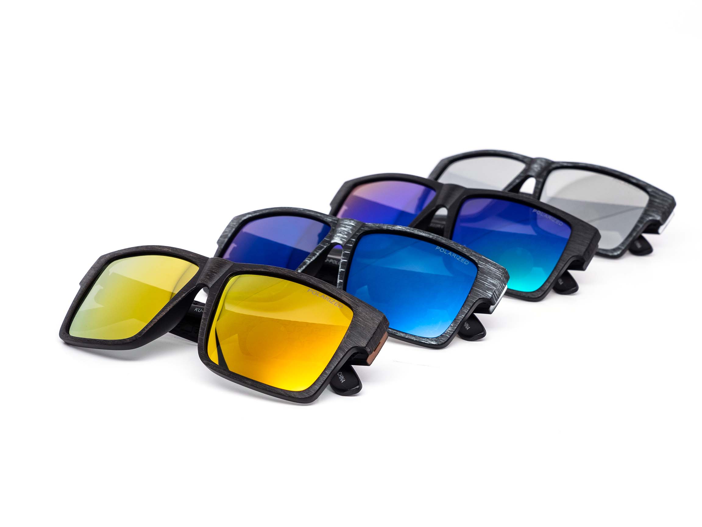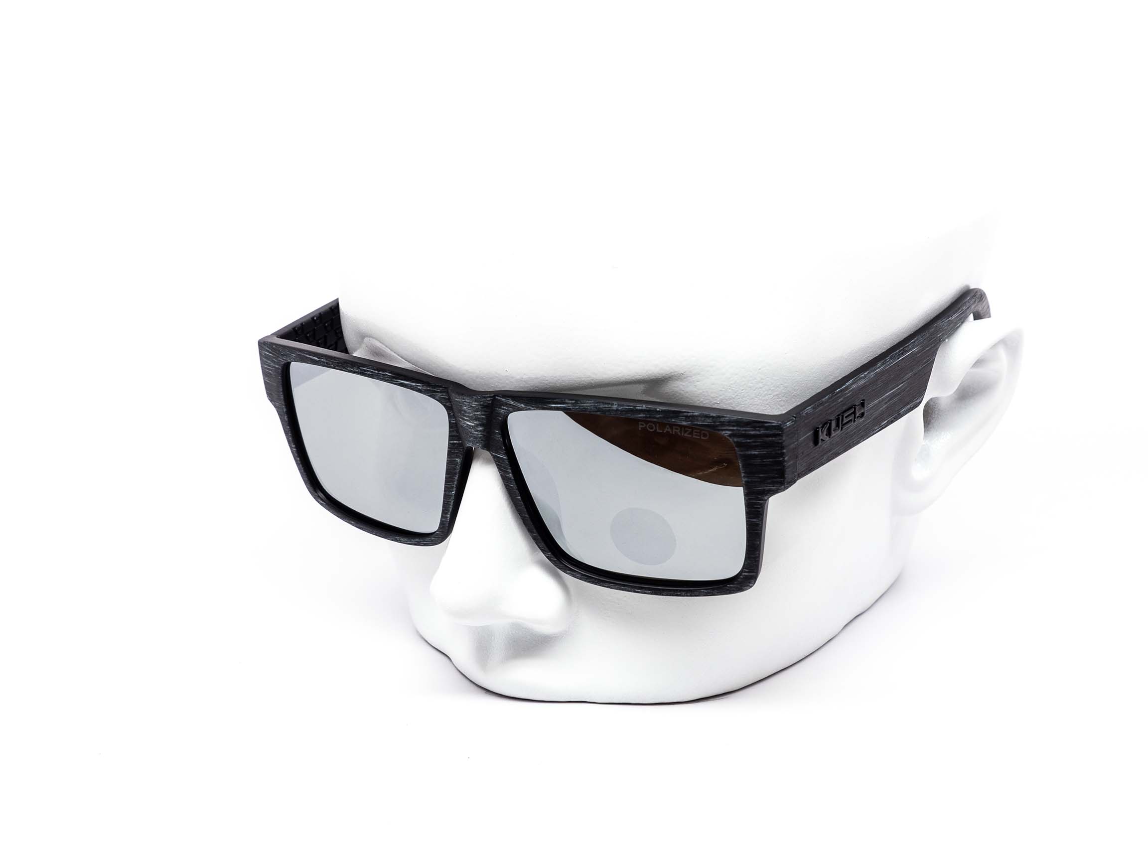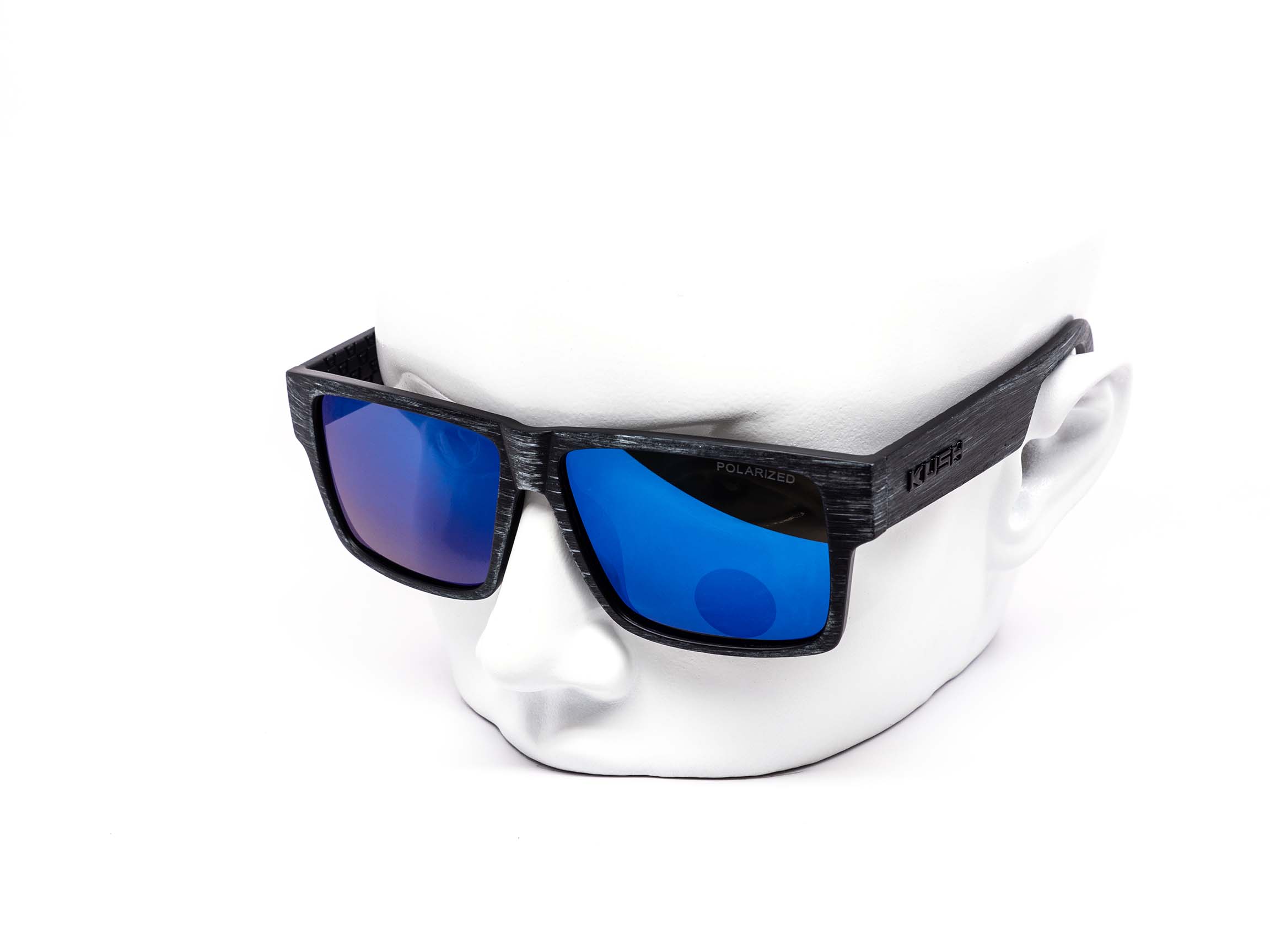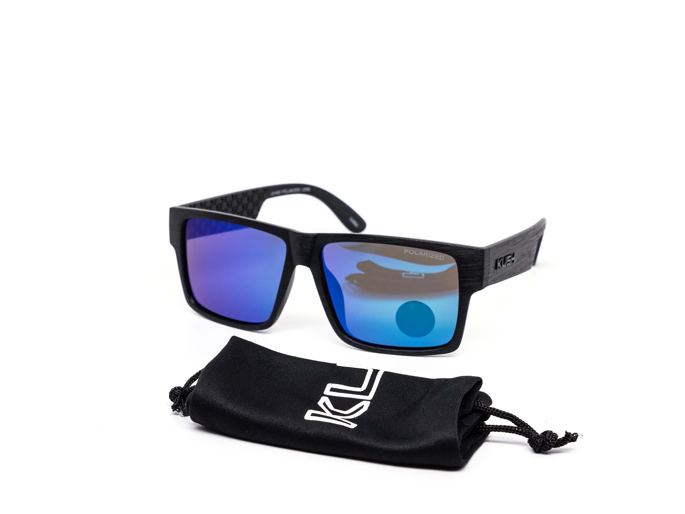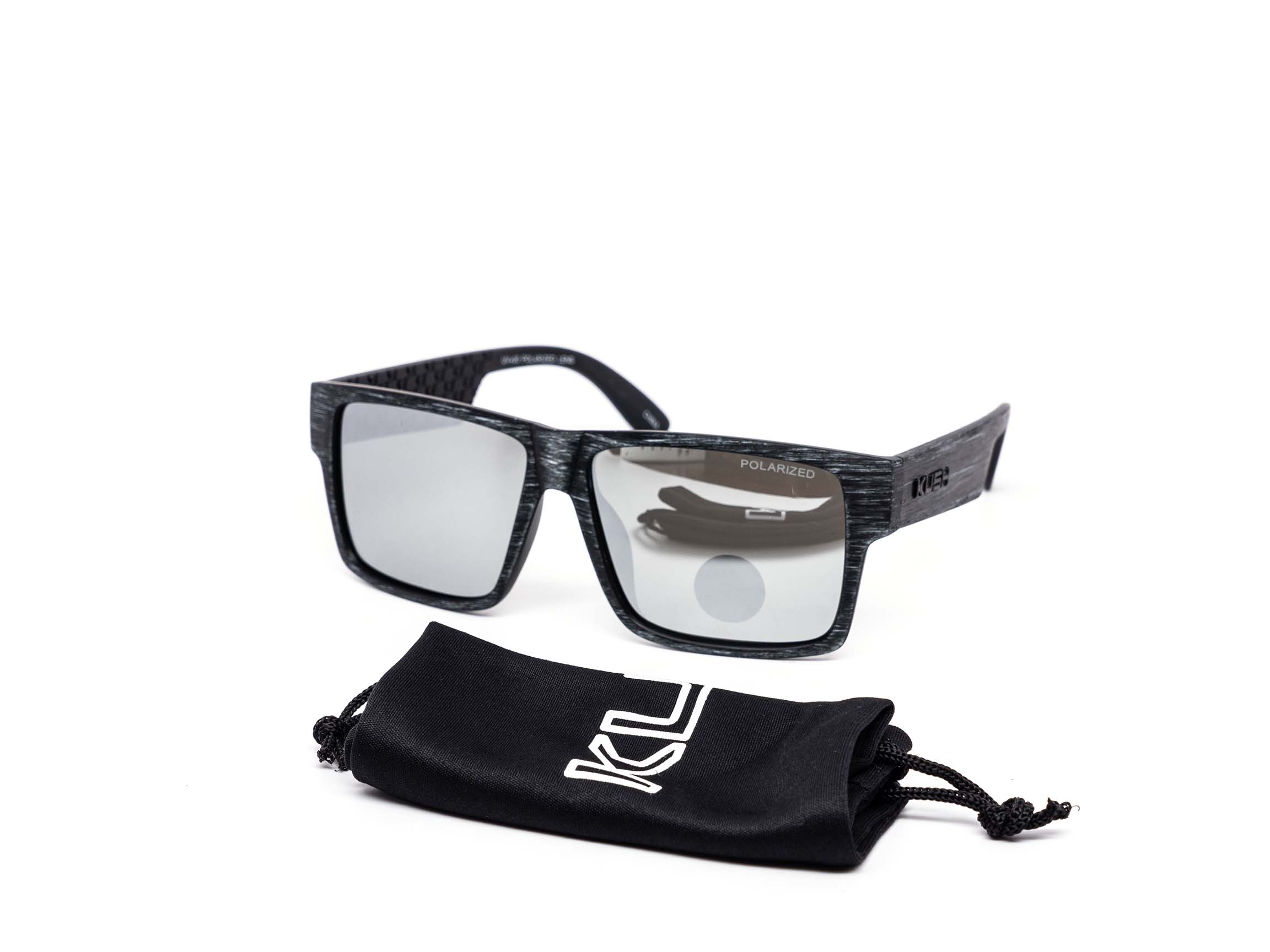 Polarized wood pattern straight top square design with black Kush logos on the temple and color mirror lens.