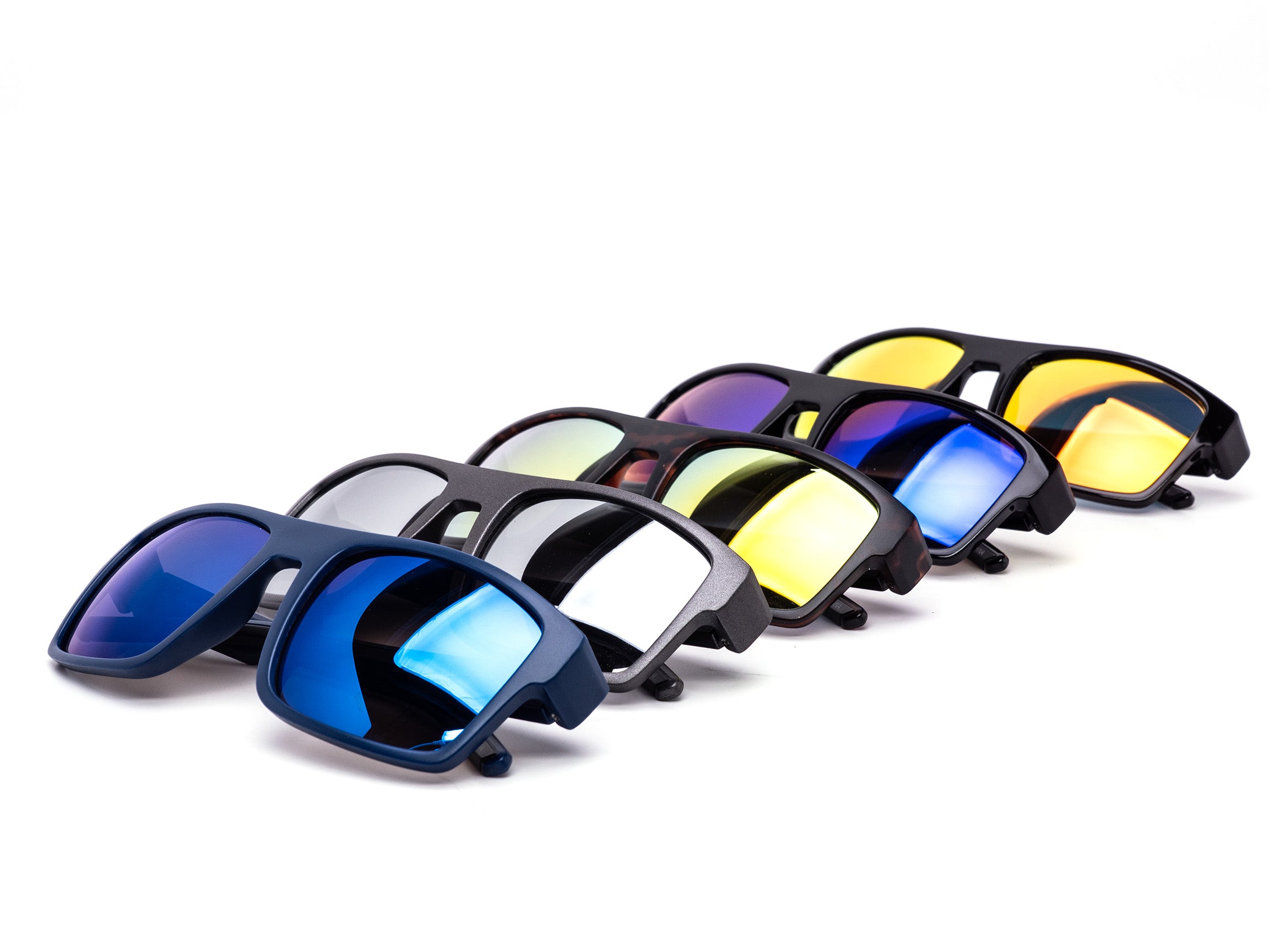 Classy sporty square style with assorted tinted mirror lenses for a bold everyday look. Mixed dozen includes four frame types paired with vibrant mirror finishes. Comfortable and easy to wear daily style.