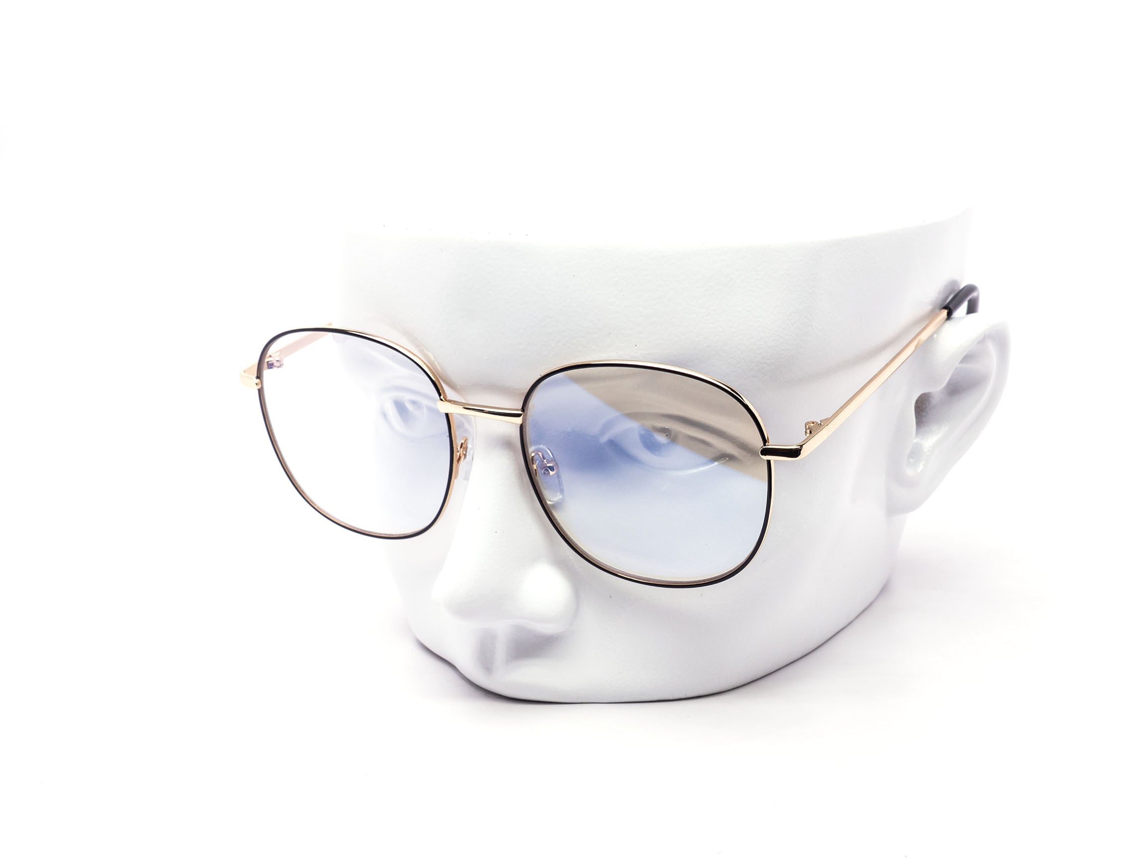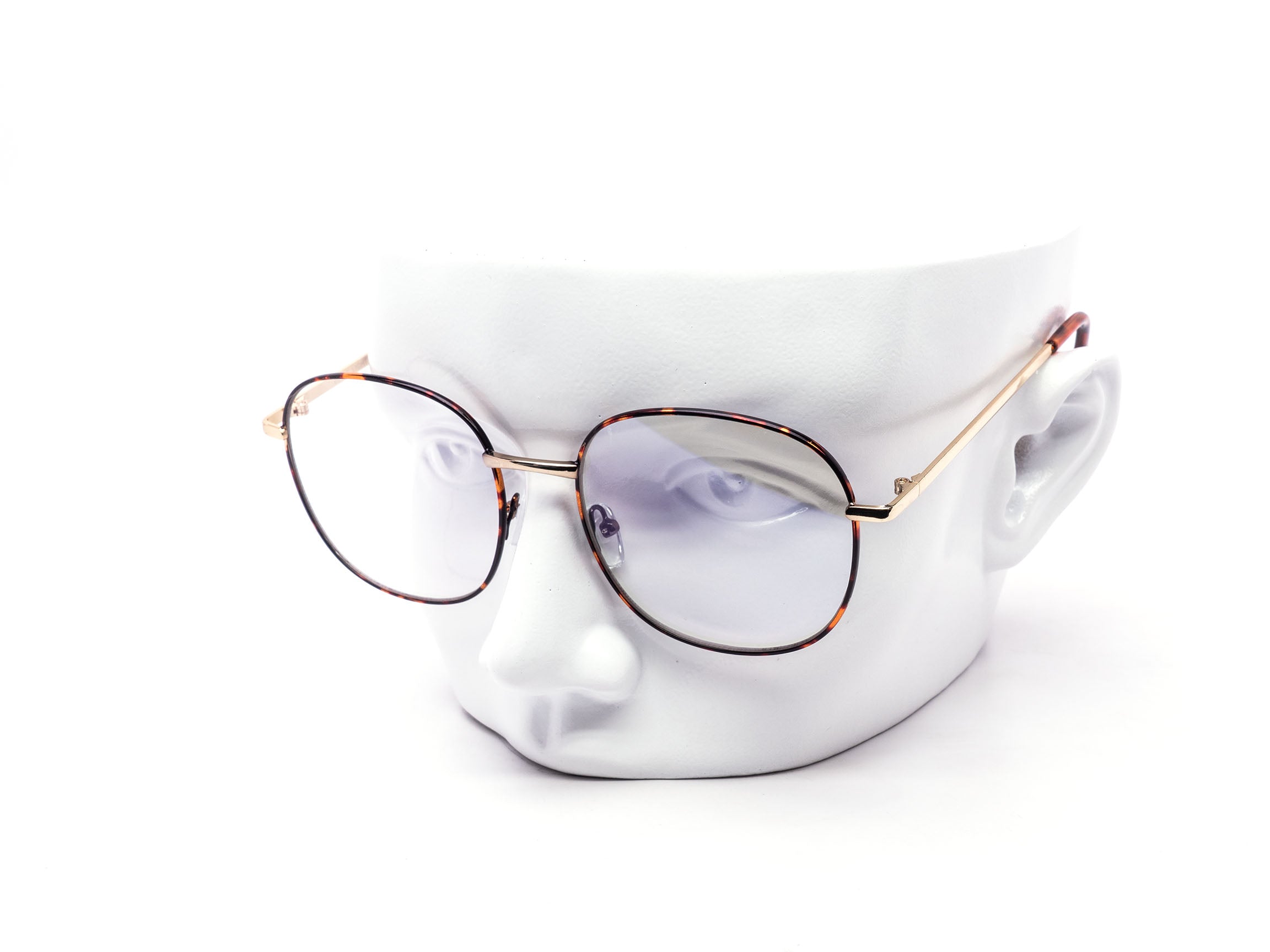 Oversized rounded silhouette with a clean metal profile and tortoise accents. Blue light filtering lens for everyday screen use. Vintage inspired with a modern finish. Assorted colors mixed per dozen.