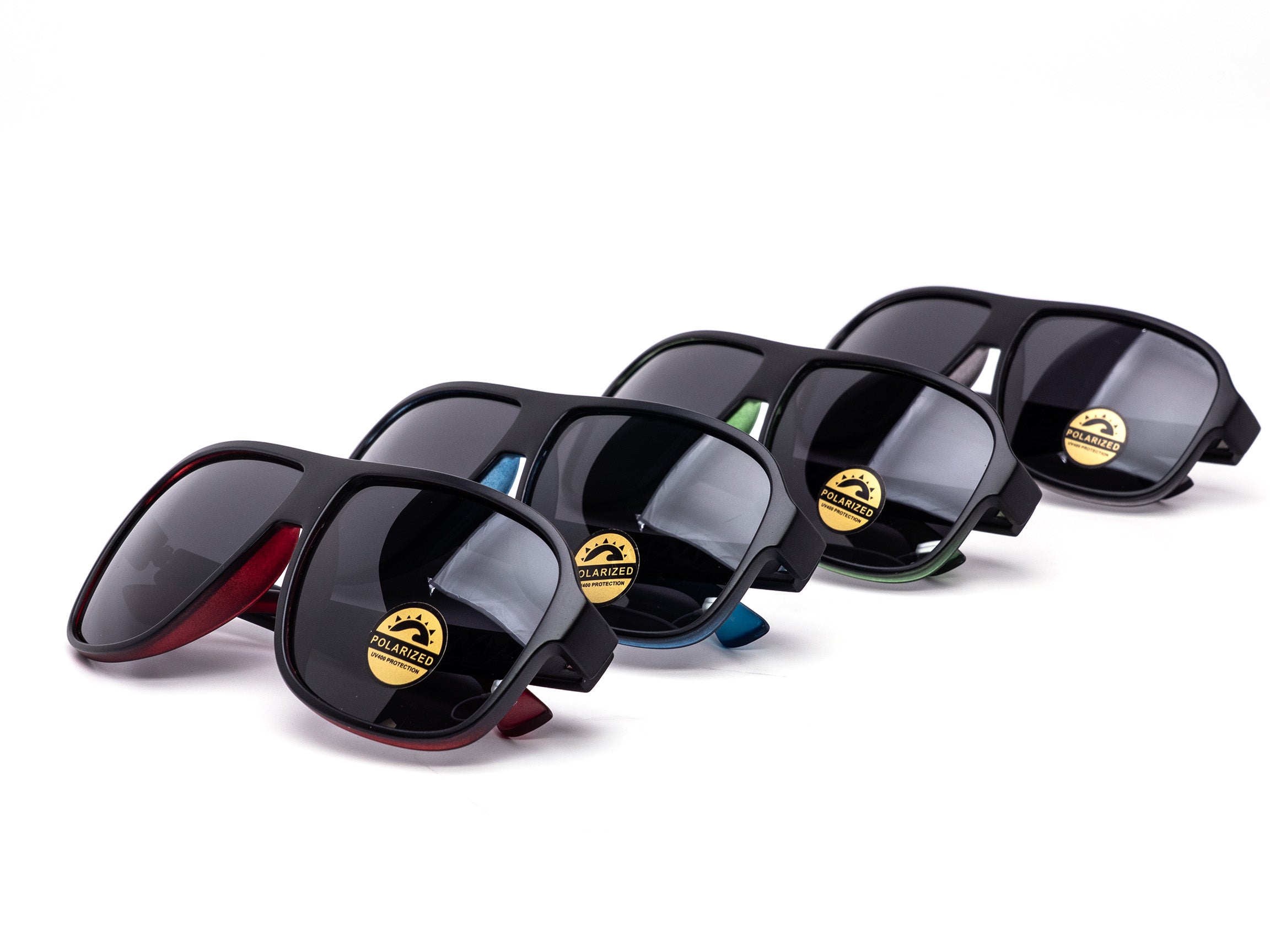 Sport inspired aviator shape with polarized lenses for comfortable daily wear. Mixed dozen includes four color variations with gradient temple tips and metallic temple accents. Easy selling sporty everyday style.