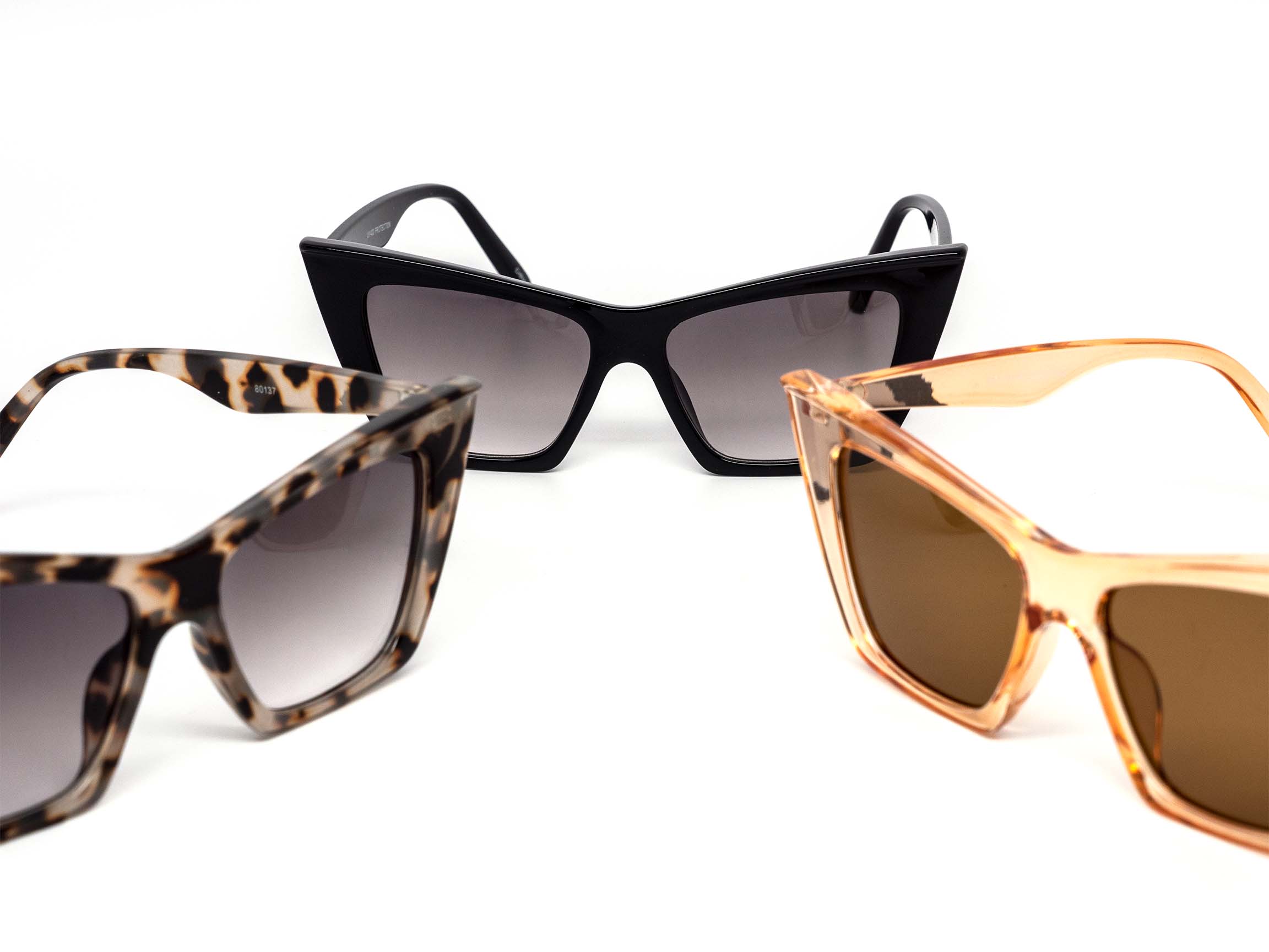 Modern spin on retro super cateye pointy design which comes in a beautifully assorted frames and dark/gradient lens.