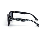 Classic black frames with the assortment of winter camouflage pattern on the temple and black.